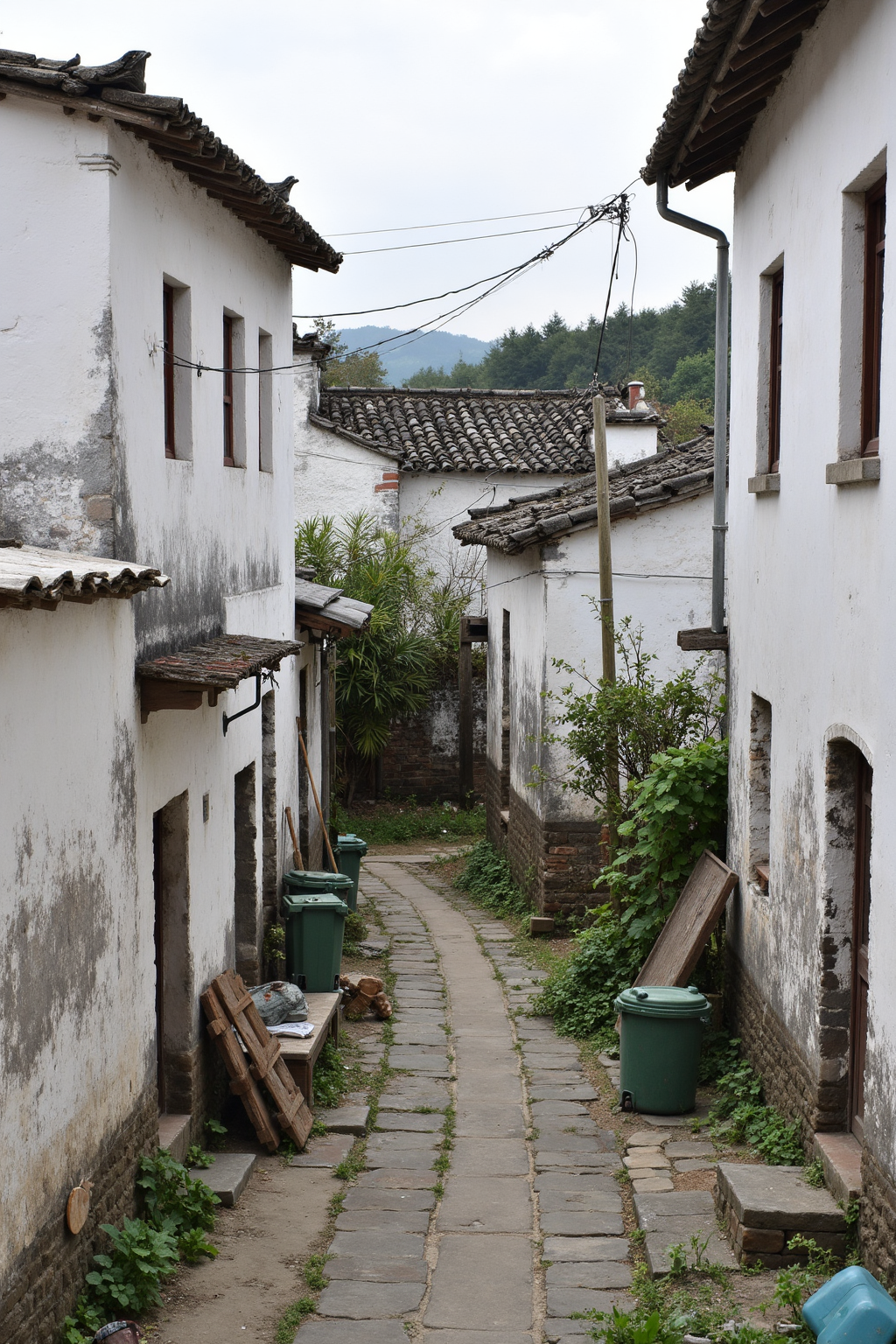 Show the rural village scene, aged white buildings, overgrown courtyards, a few scattered items, telling tales of bygone days.