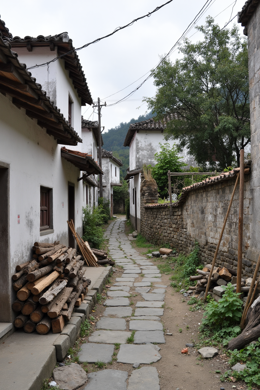 Show the rural village scene, traditional houses, rustic pathways, piles of firewood, the charm of a sleepy, aged hamlet.