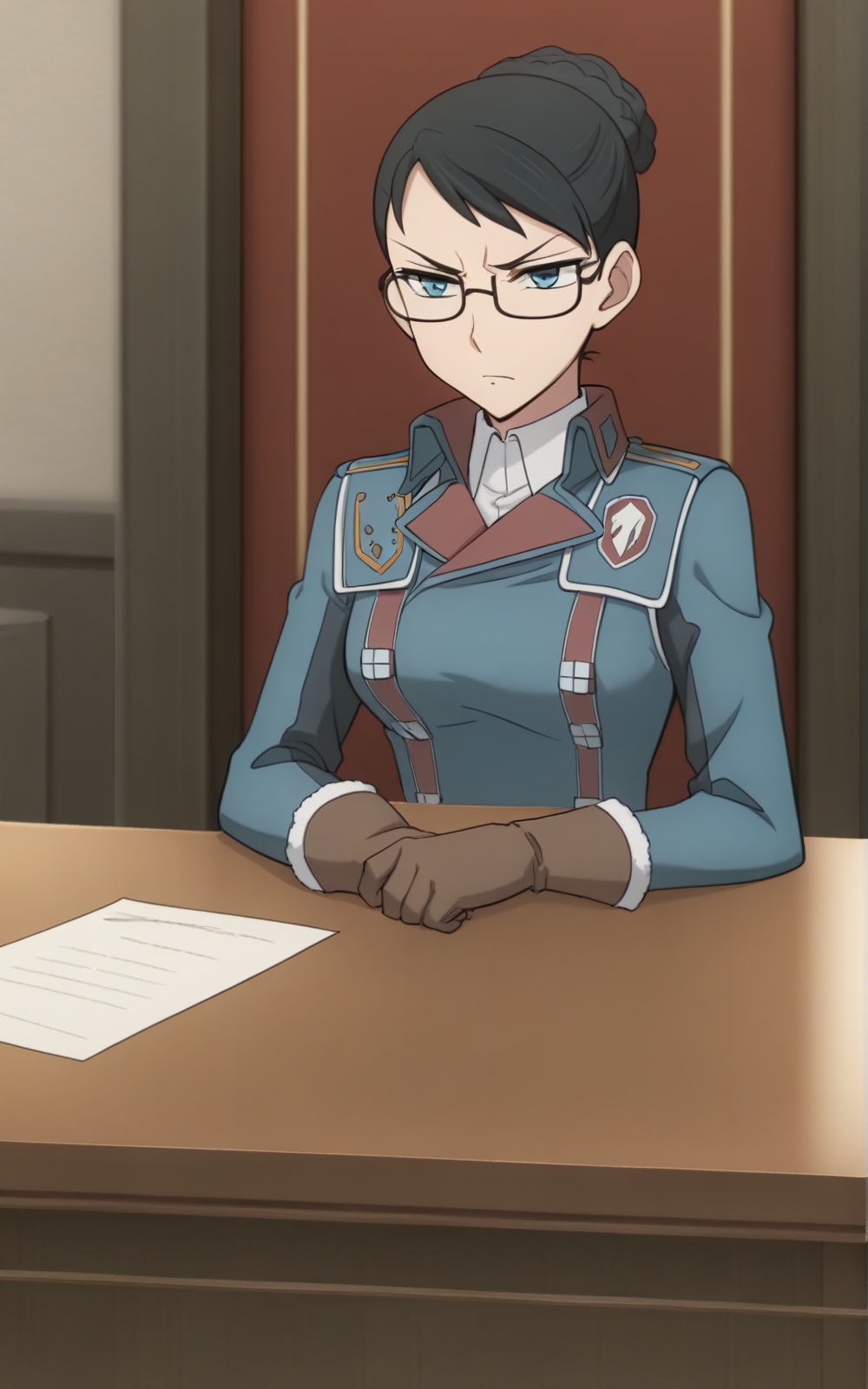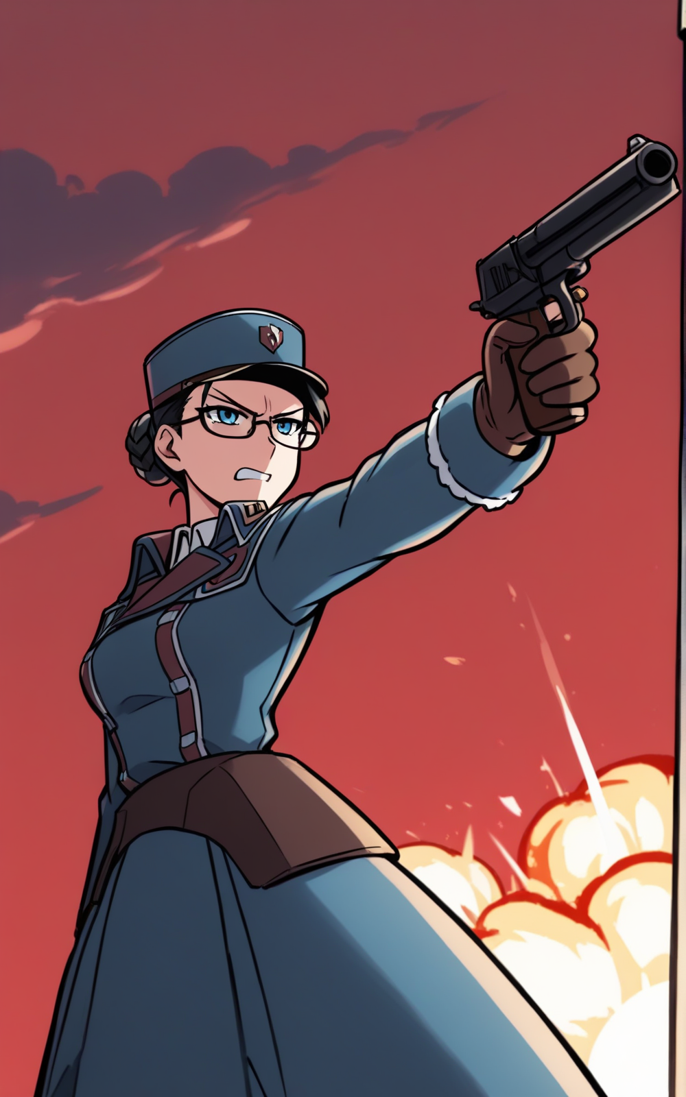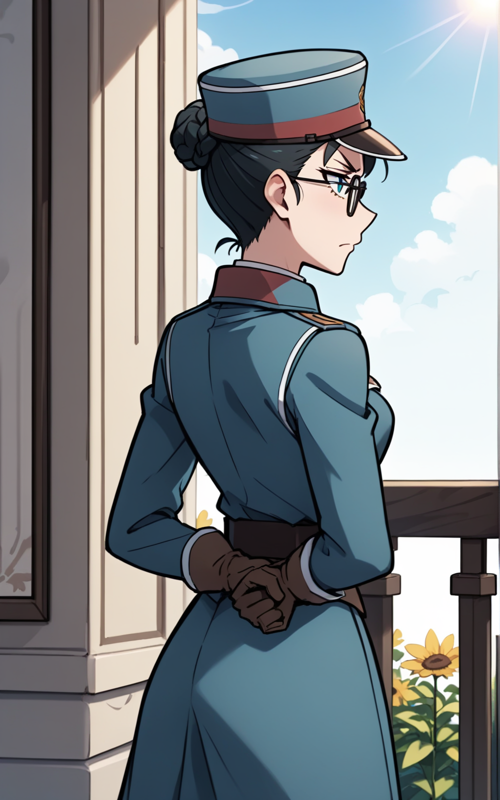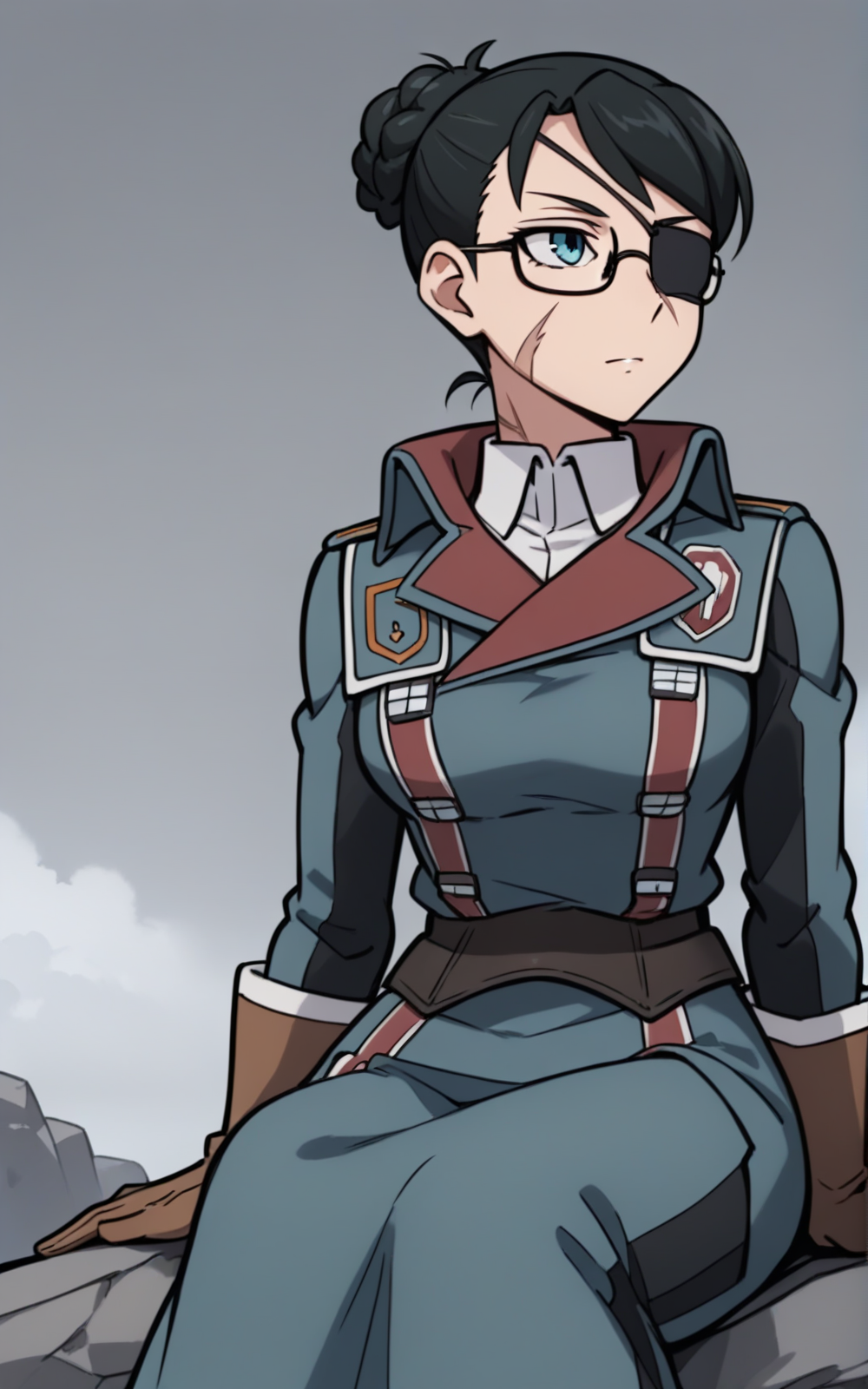 For her Outfit: boots, brown footwear, collared, uniform, long dress, military, military uniform, coat, long sleeves, glasses, blue uniform, gloves, brown gloves