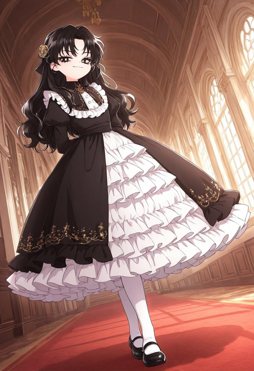black hair, black dress, white lace, bangs, black_eyes, hair_ornament, mary_janes, frills, frilled_dress,