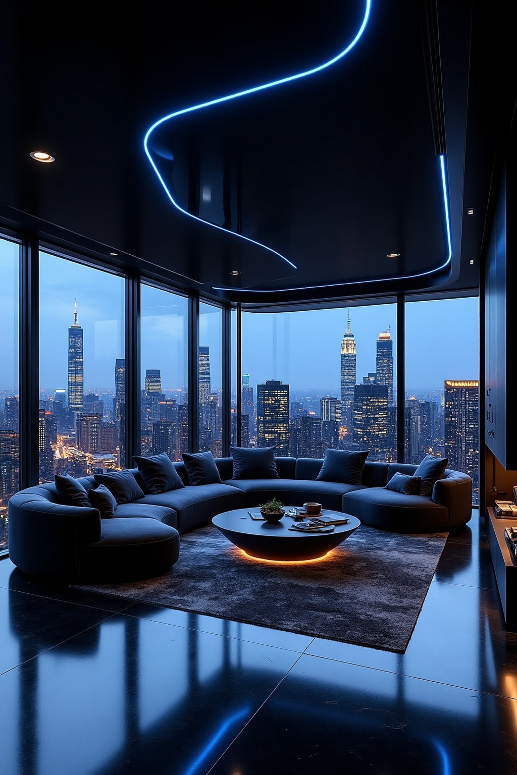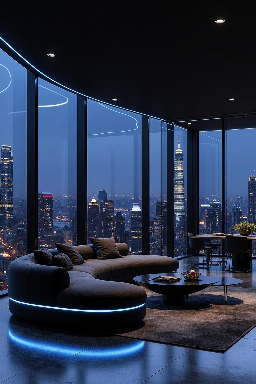 High - tech sense with cityscape view, avant - garde lounge, asymmetrical sofas, neon accents, vast windows, urban night panorama, high - gloss surfaces.