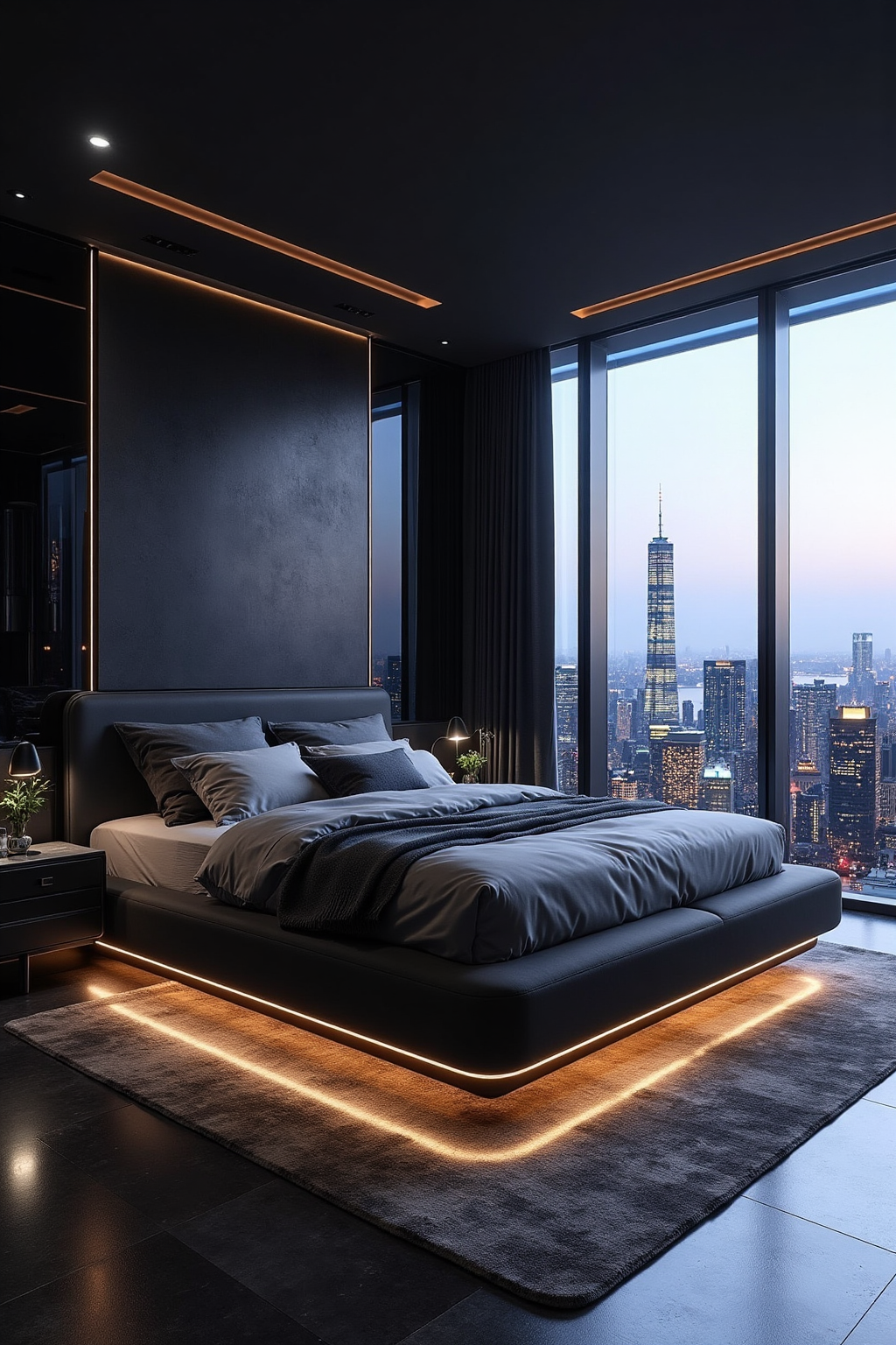 High - tech sense with cityscape view, luxury bedroom, low - profile bed, illuminated base, floor - to - ceiling glass, city dawn view, minimalist bedside tables.