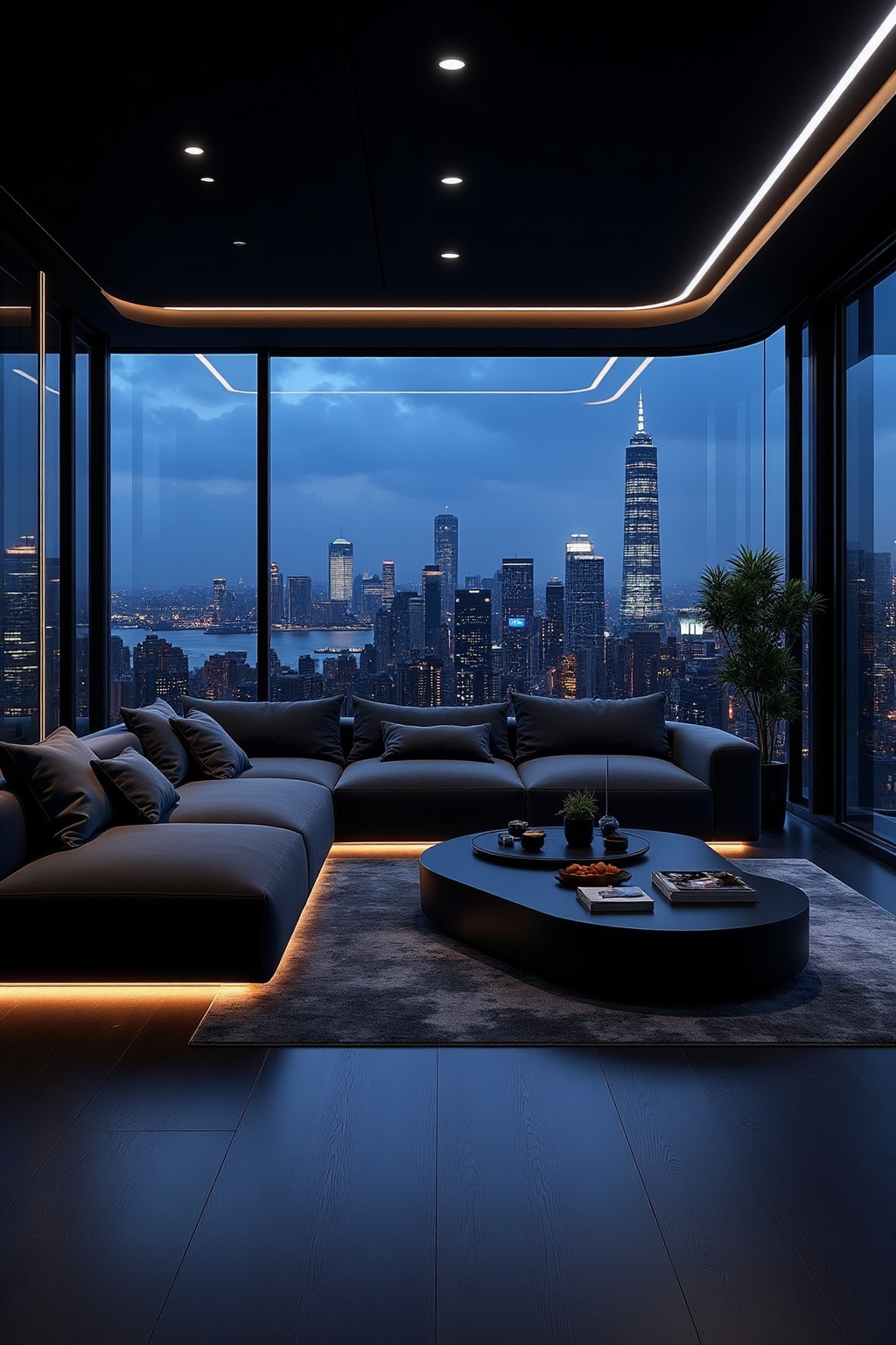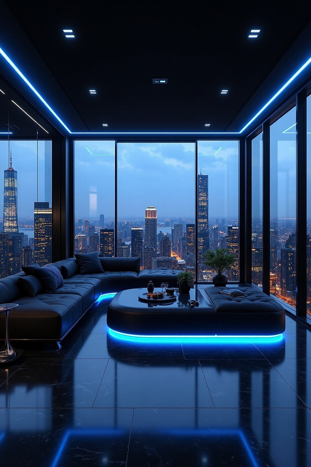 High - tech sense with cityscape view, futuristic living room, large floor - to - ceiling windows, black leather sofas, neon blue lights, reflecting glossy floors, urban skyline at dusk.