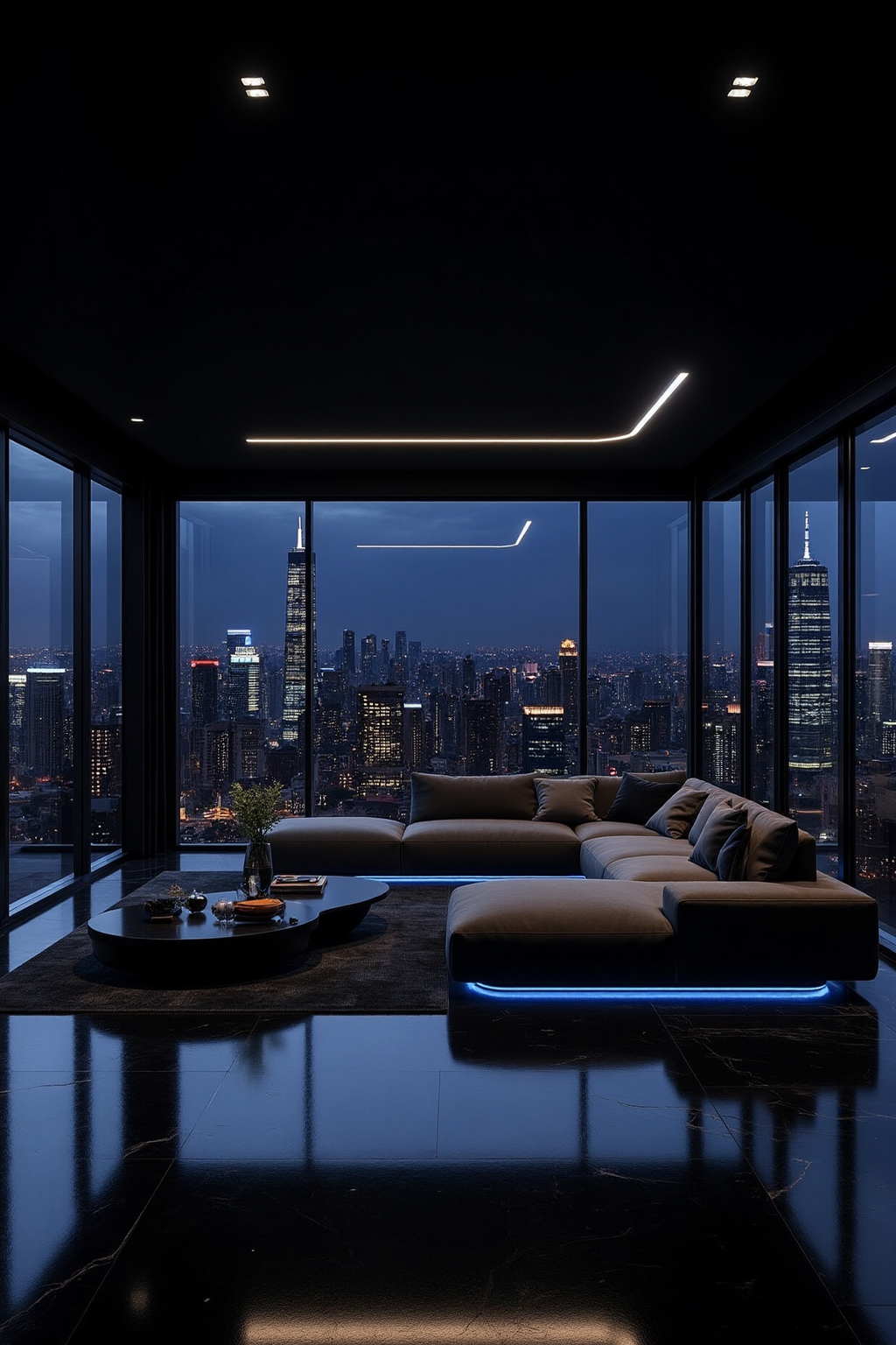 High - tech sense with cityscape view, high - end living area, plush sofas, linear lights, glass walls, city skyline at night, reflective floors.