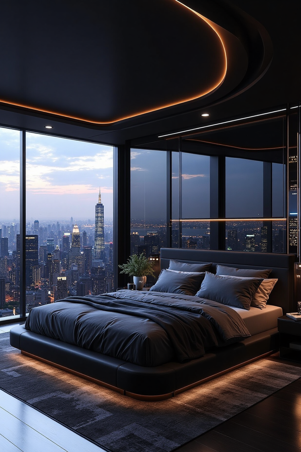 High - tech sense with cityscape view, stylish bedroom, integrated lighting, large glass panels, city sunset view, plush bedding, minimalist design.