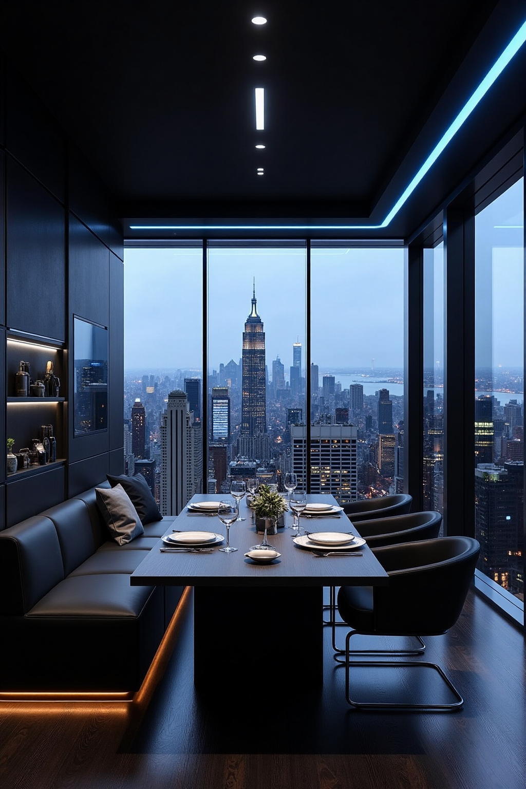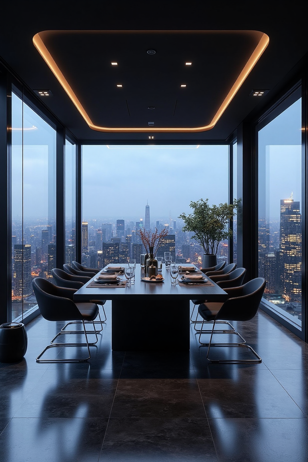 High - tech sense with cityscape view, smart dining area, sleek table, ambient lighting, panoramic windows, metropolitan buildings in the distance, high - end utensils.