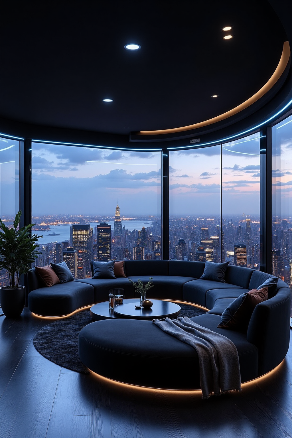 High - tech sense with cityscape view, modern relaxation space, rounded sofas, LED highlights, panoramic windows, city dawn panorama, sleek decor.