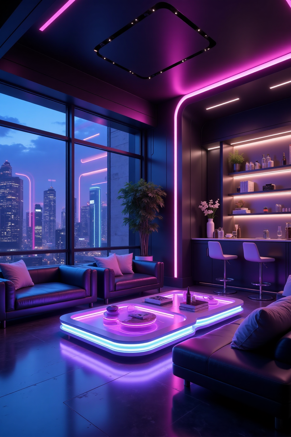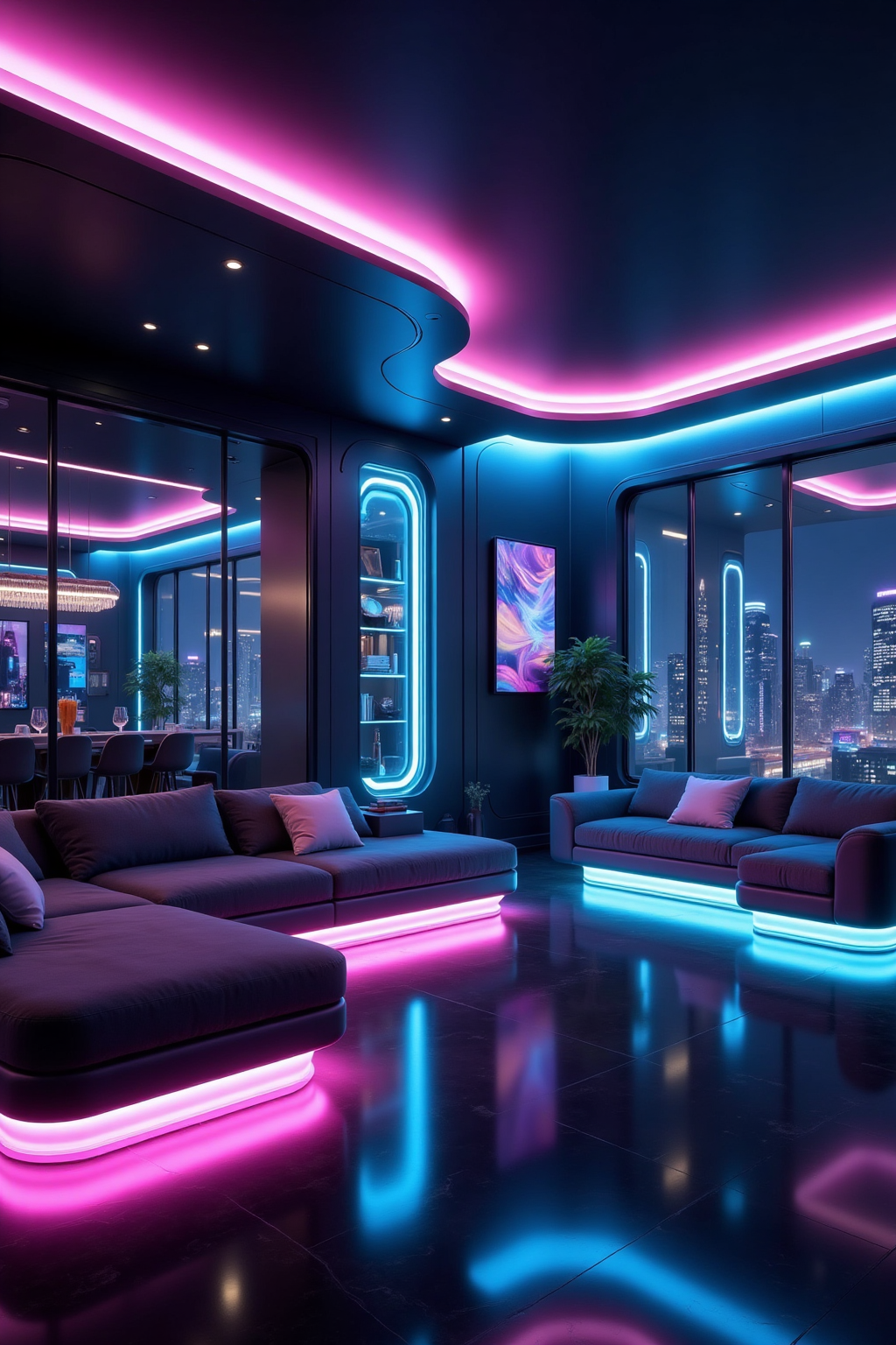 Neon lighting and futuristic interior design, a living room having layered neon lines, modular sofas, smart glass partitions, city - themed art.
