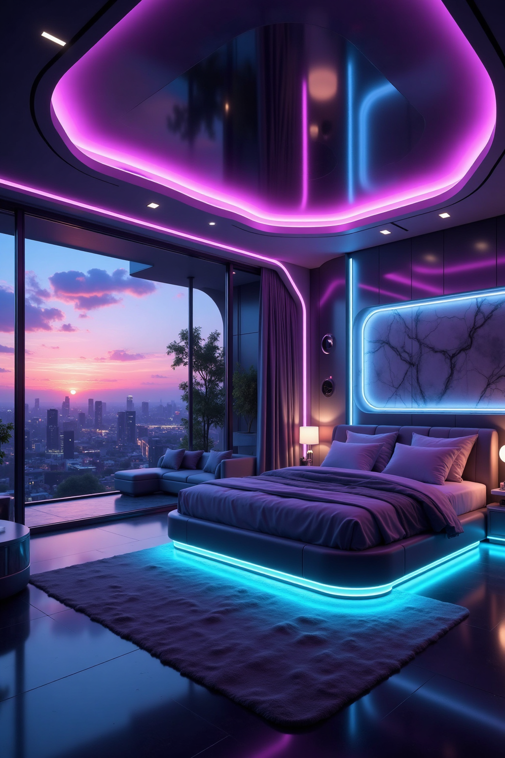Neon lighting and futuristic interior design, a bedroom with curved neon strips, panoramic city windows, glossy dark floors, plush bed, cyberpunk vibe.