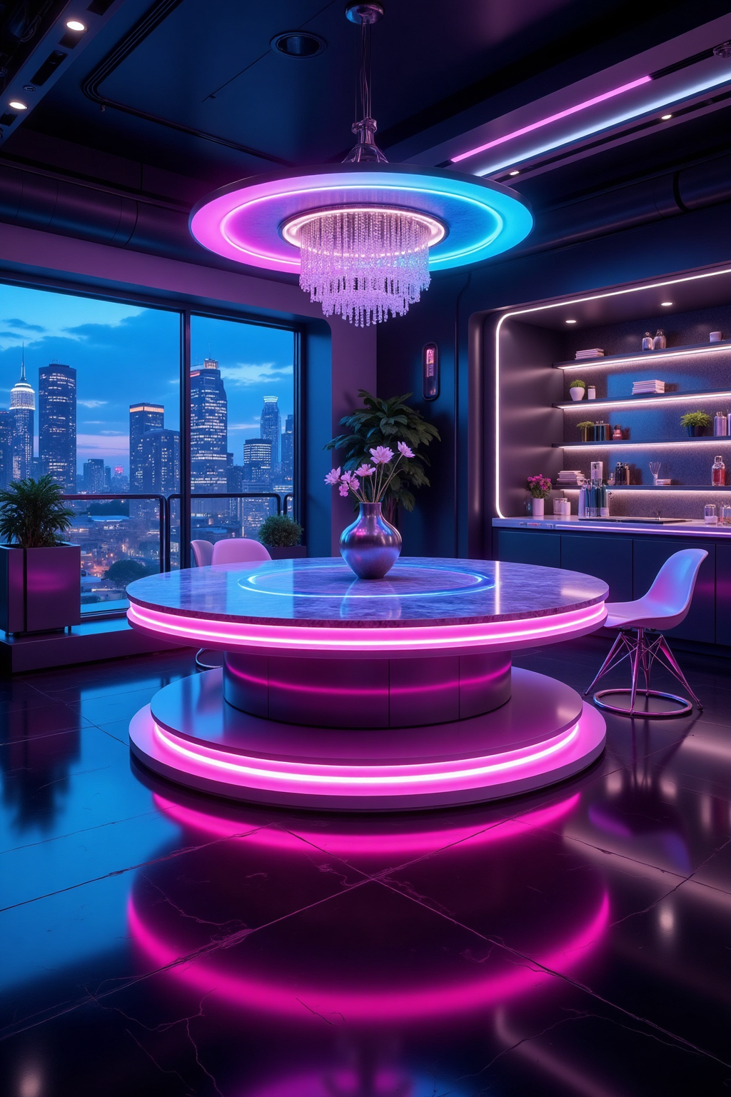 Neon lighting and futuristic interior design, a dining area with circular neon - rimmed table, floating chairs, holographic decor, urban skyline backdrop.