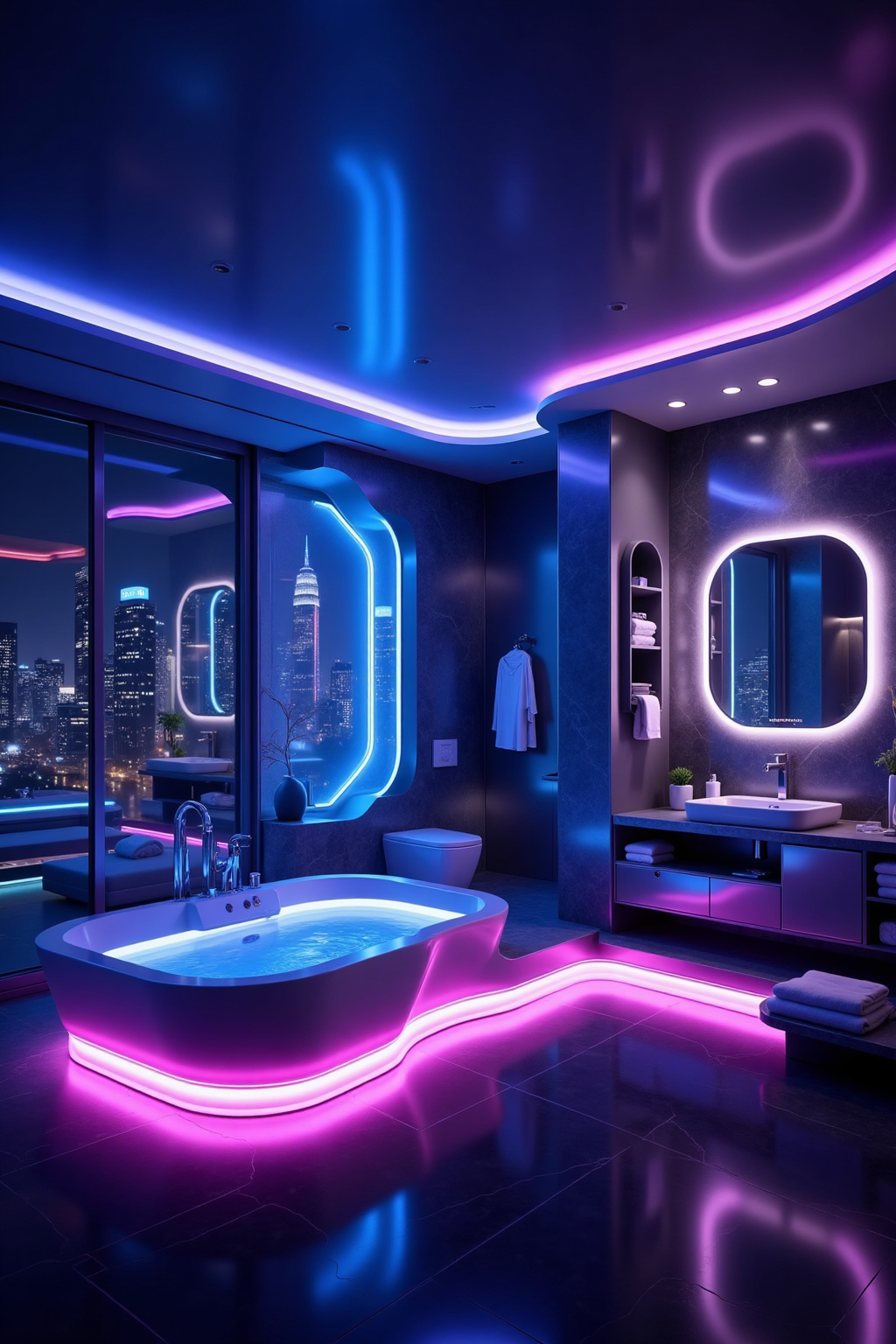 Neon lighting and futuristic interior design, a bathroom featuring a neon - lit tub, transparent walls, cityscape view, high - tech fixtures, sleek surfaces.