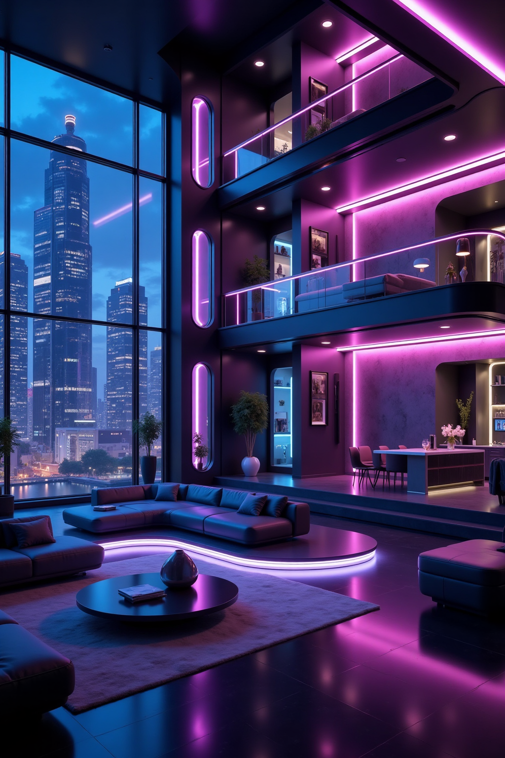 Neon lighting and futuristic interior design, a multi - level living room, neon strips along railings, city panorama from every level, modern furniture.