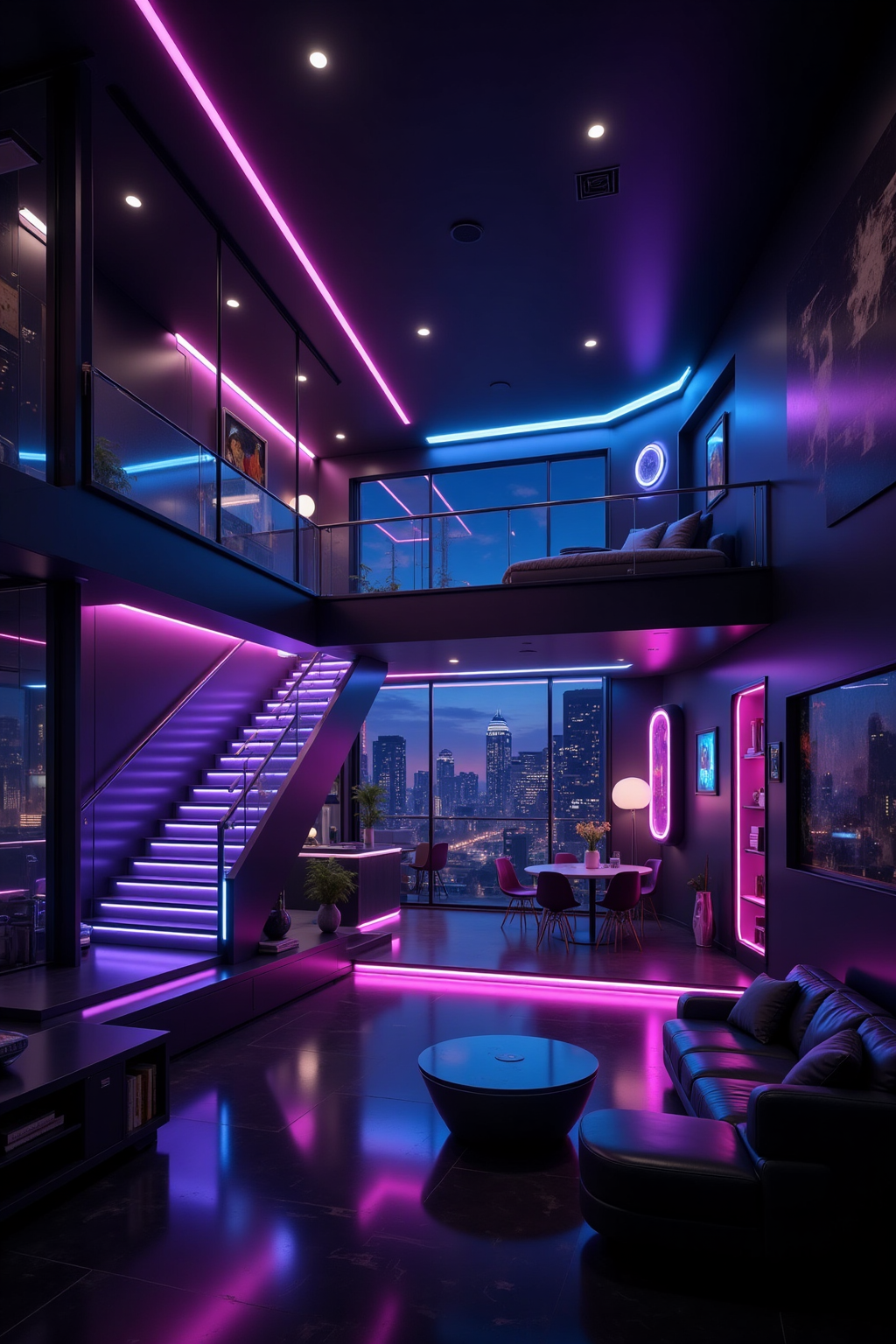 Neon lighting and futuristic interior design, a duplex living space with neon stair lighting, open - plan layout, city lights twinkling outside.