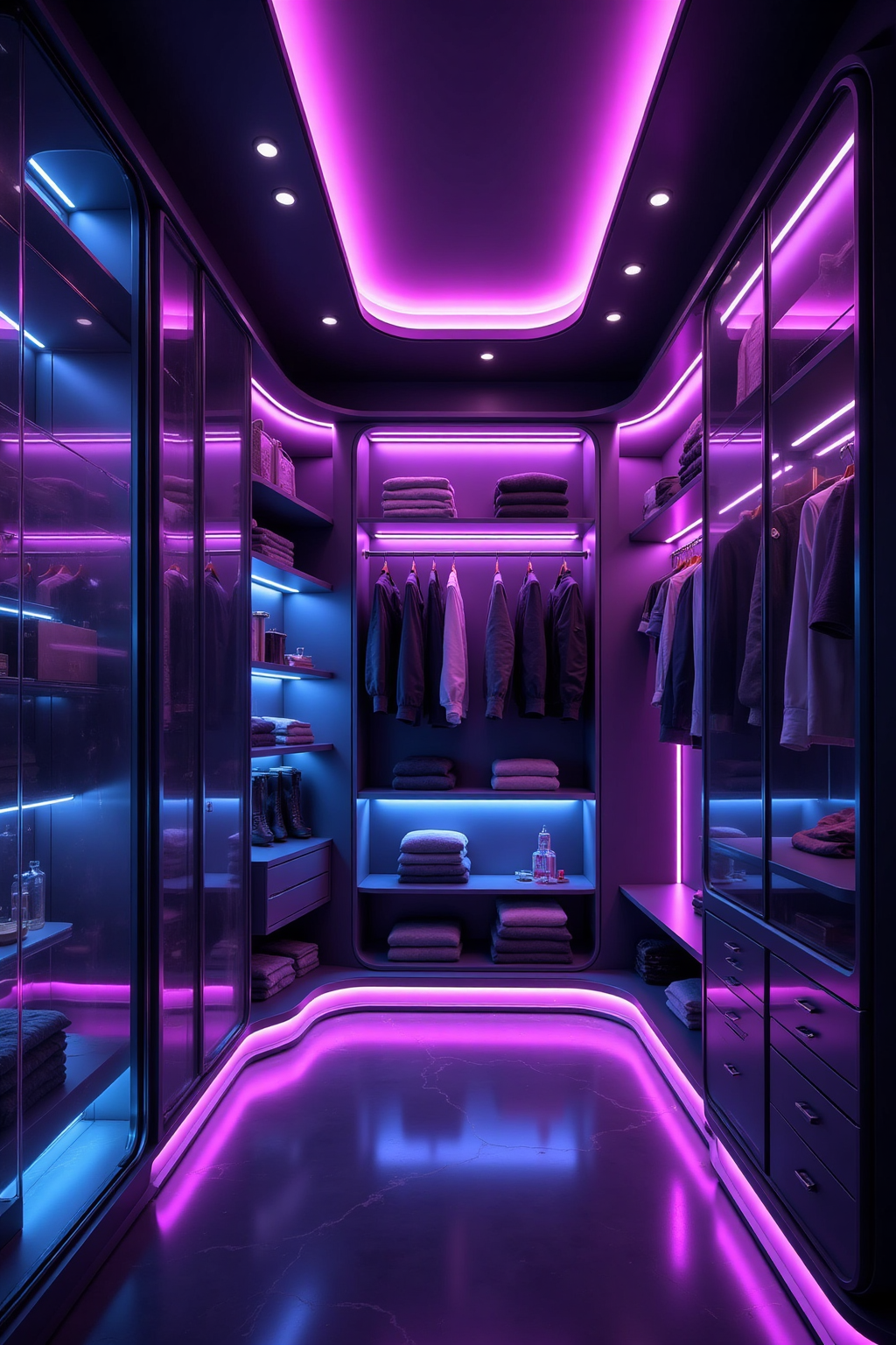 Neon lighting and futuristic interior design, a walk - in closet with neon - lit shelves, rotating garment racks, mirror walls, high - tech storage.
