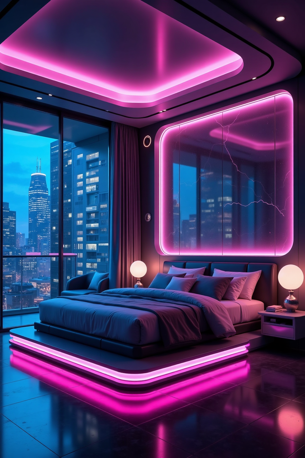 Neon lighting and futuristic interior design, a bedroom with neon - accented headboard, floating nightstands, smart glass that shows cityscapes.