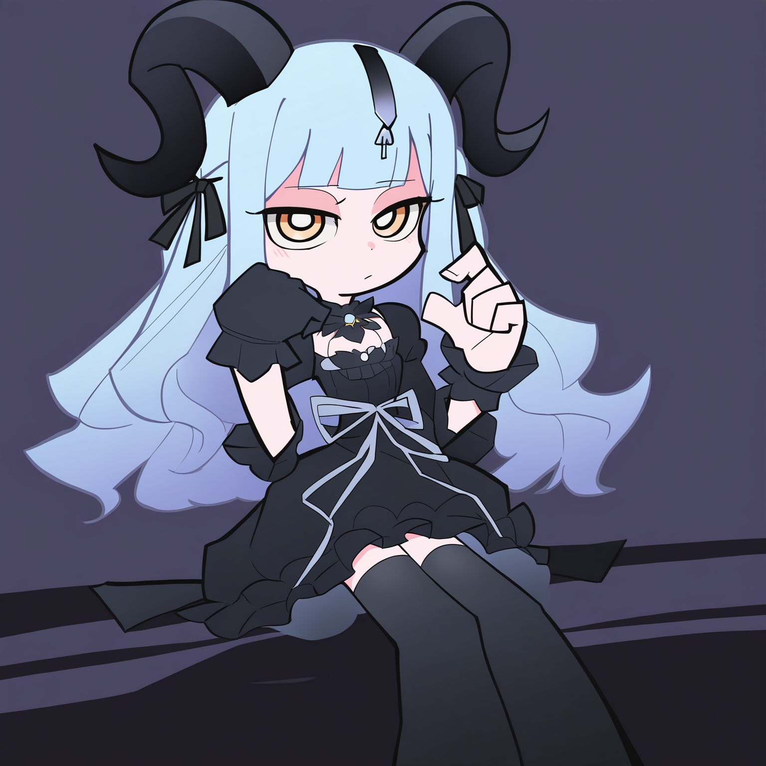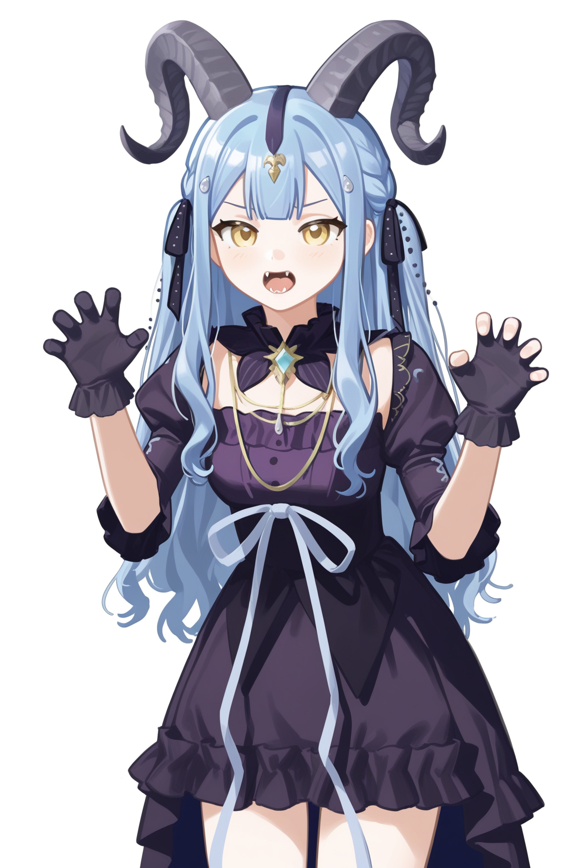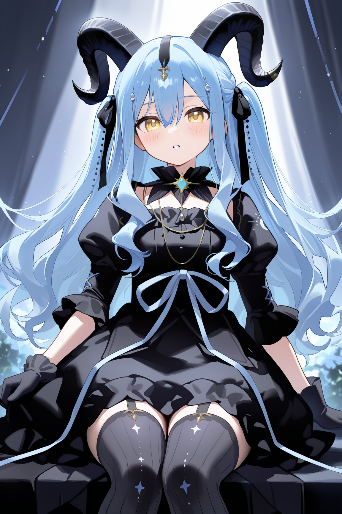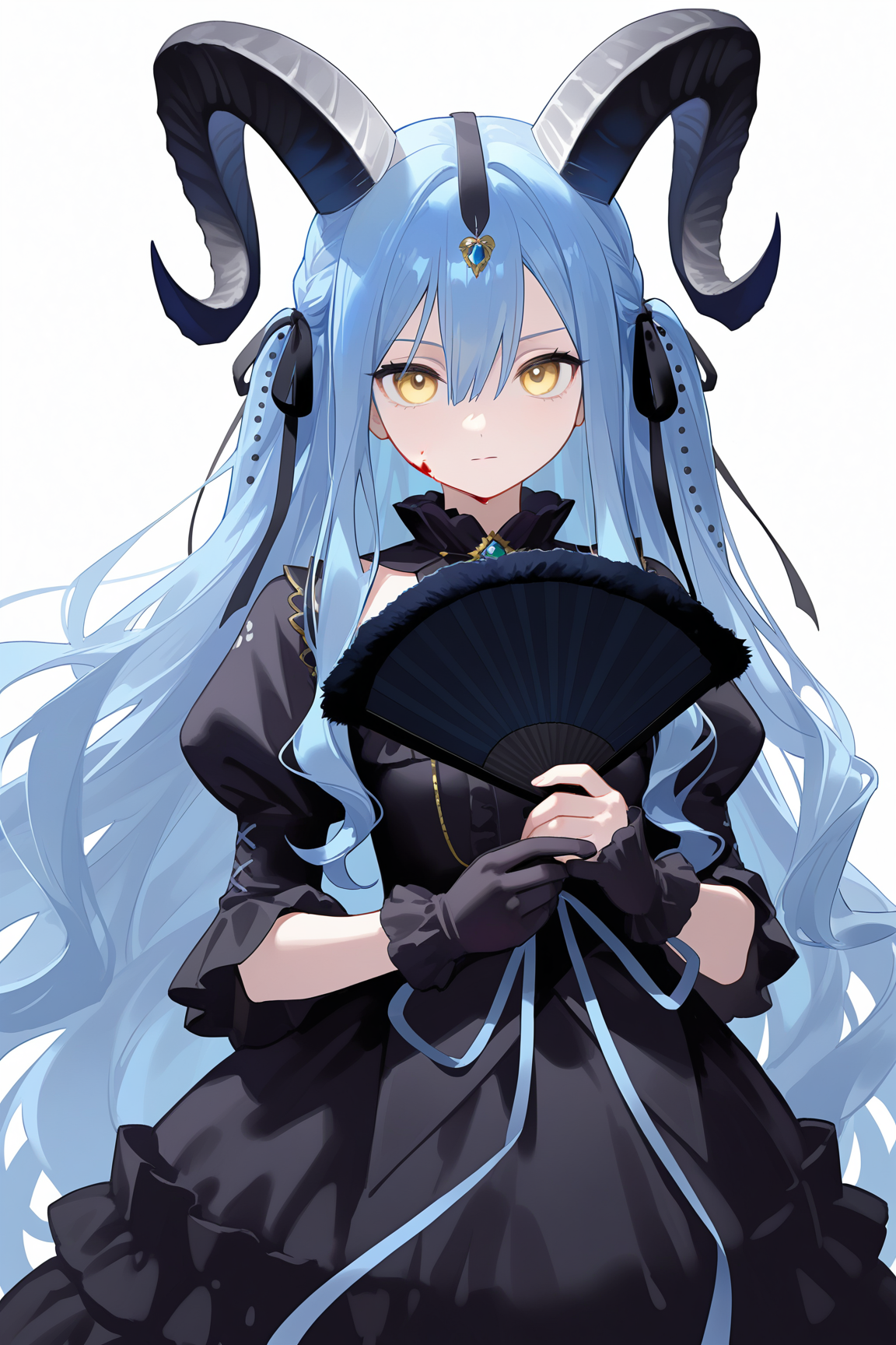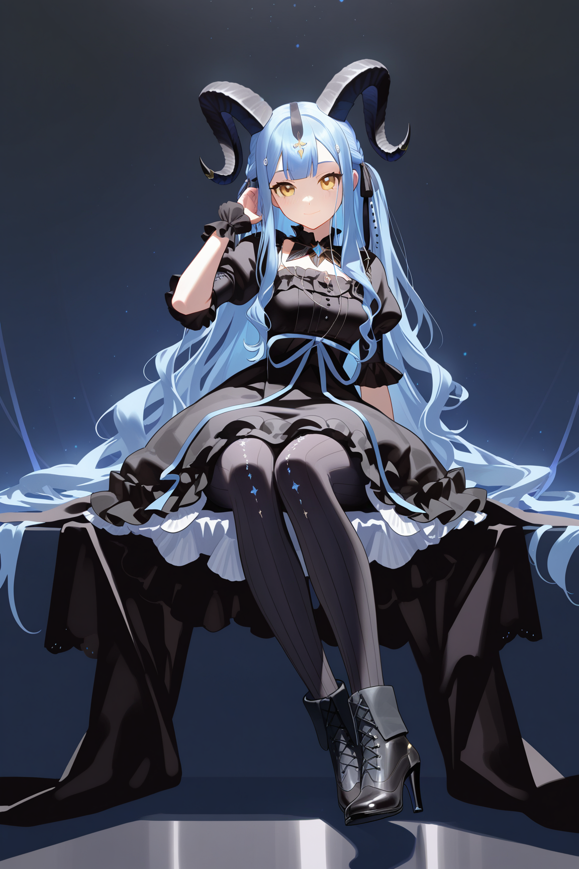 togawa sakiko \(master of melodia\), 1girl, horns, hair ornament, dress, long hair, yellow eyes, blue hair, tail, black horns, black dress, curled horns, frills, wrist cuffs, frilled dress