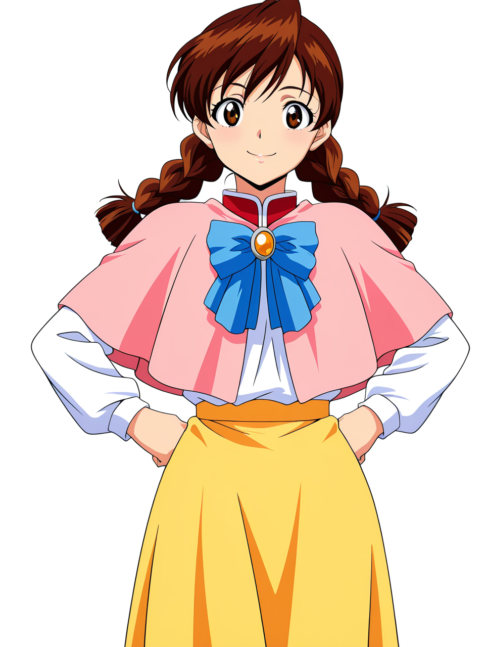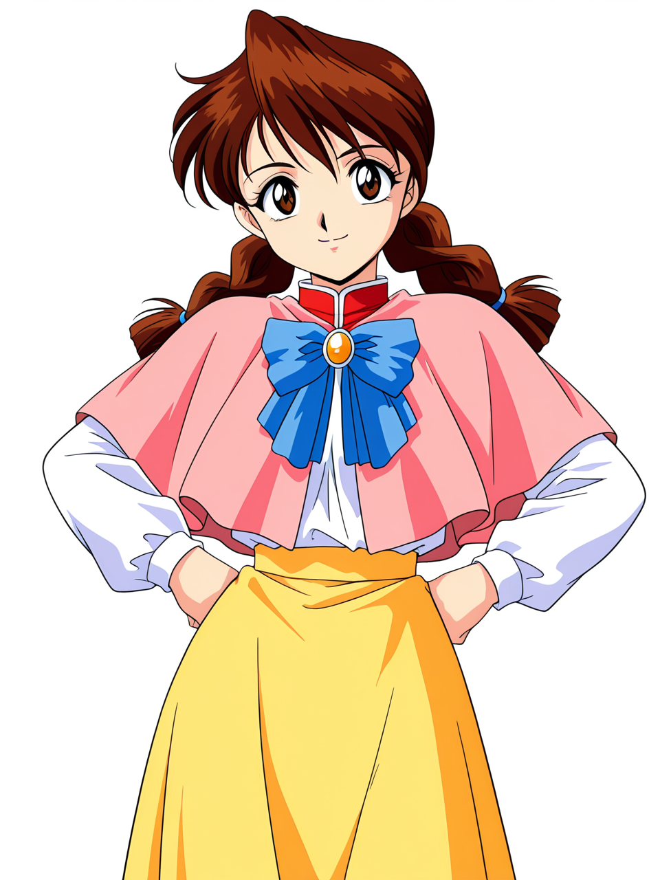pink capelet, brooch, blue bow, white shirt, long sleeves, yellow skirt, long skirt,