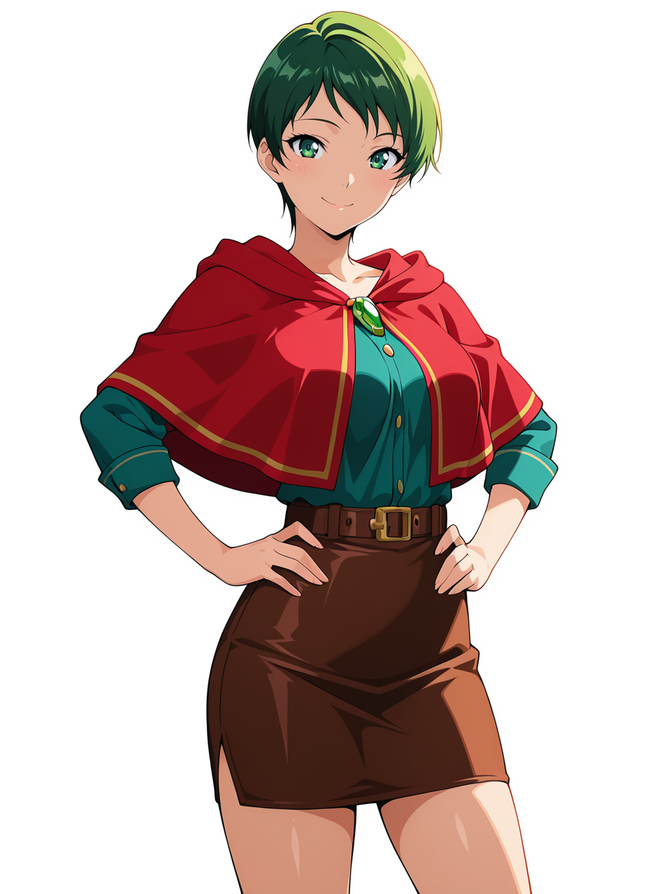 red capelet, pencil skirt, miniskirt, brown skirt,
