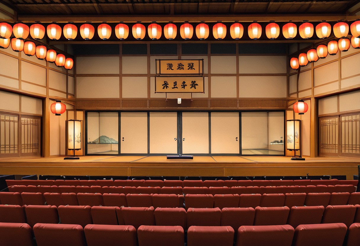 jeh,indoors,paper lantern,east asian architecture,sliding doors,no humans, audience seats,stage,