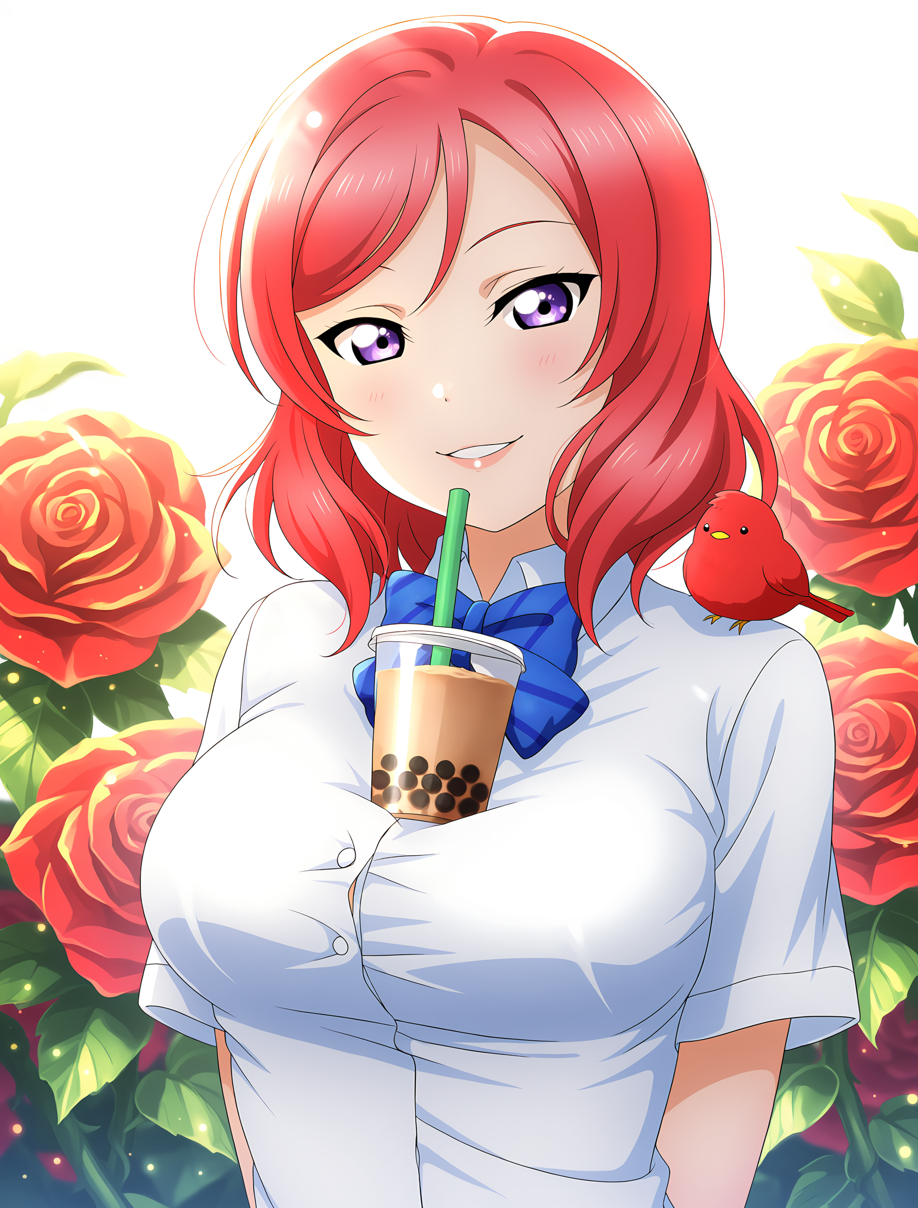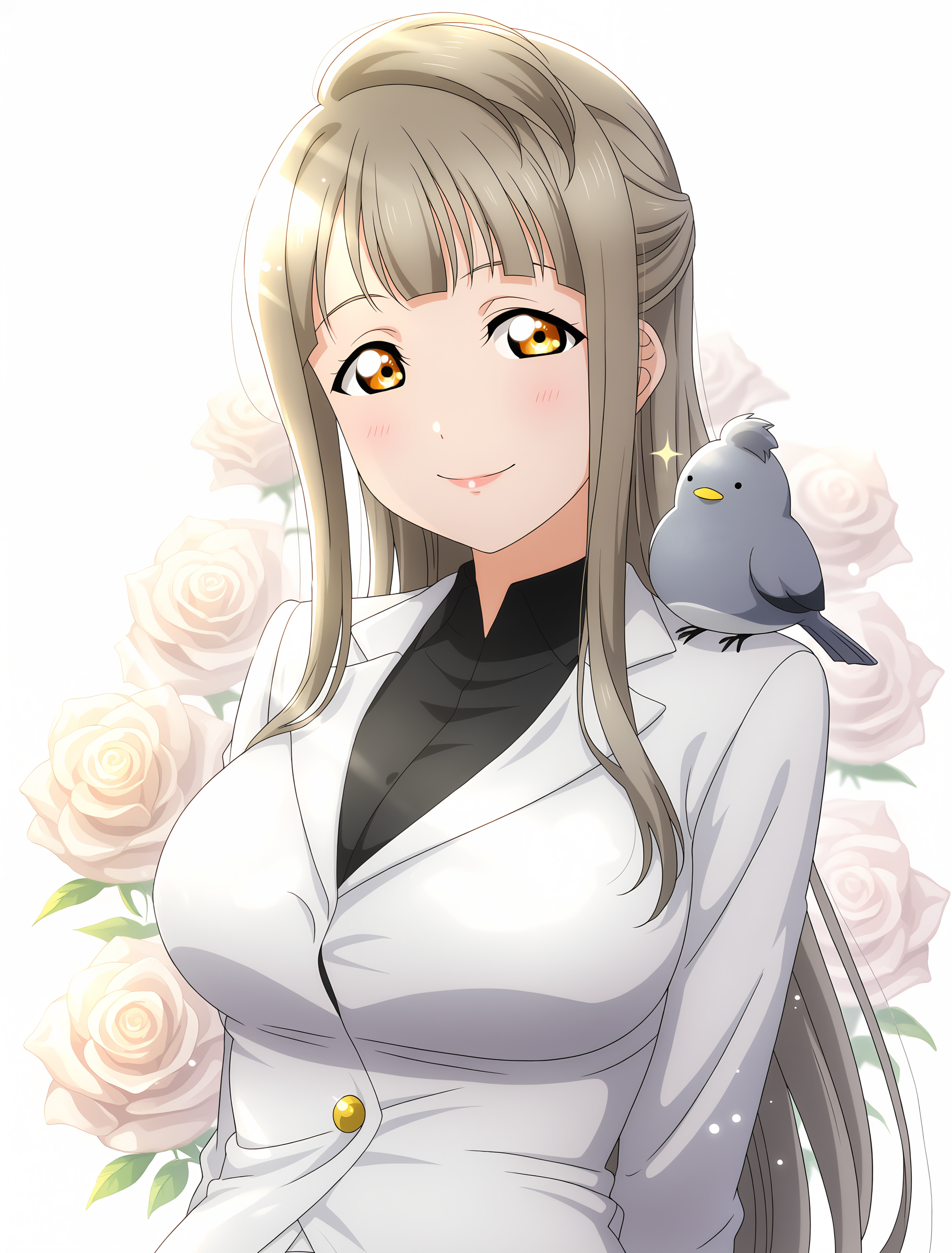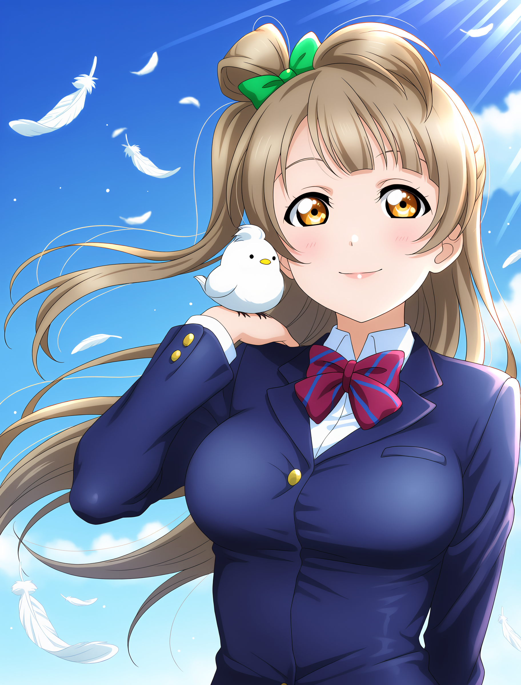 holding bouquet, white rose, breast focus, floating hair, wind, very long hair, (falling feathers:1.3), day, blue sky, (cloud:0.8), blue background, white background, gradient background, (sunlight, sunbeam)