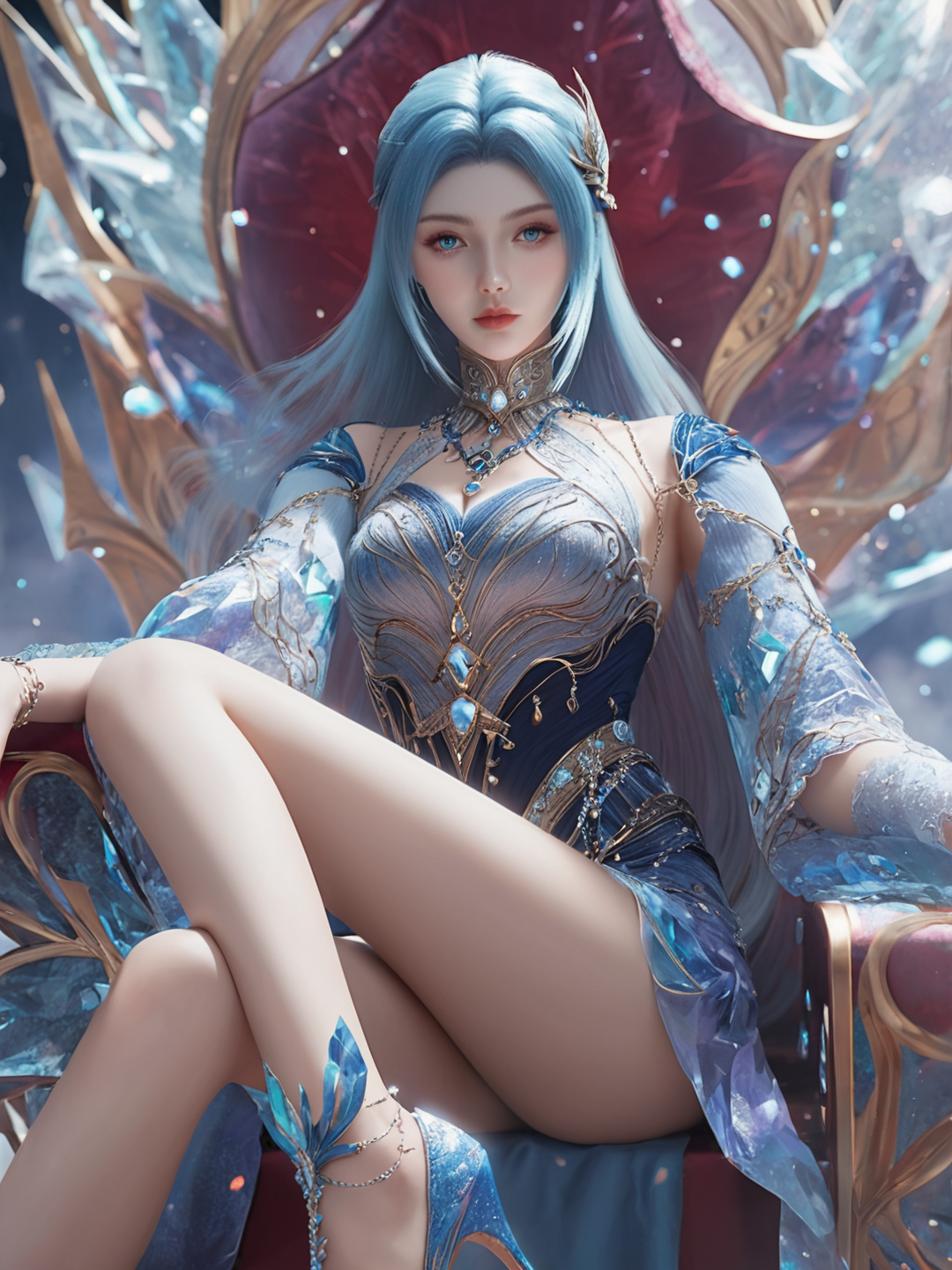 -Clothing:blue long gauze dress,blue crystal wings,exquisitely decorated high heels ,gem - encrusted chains