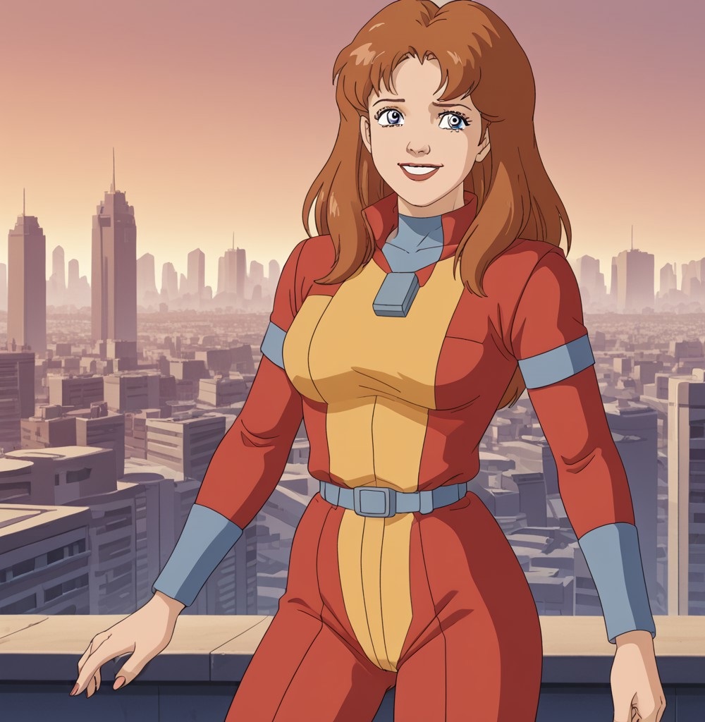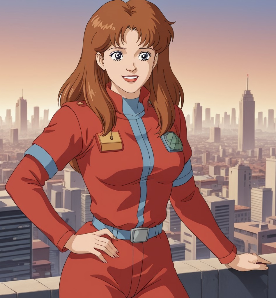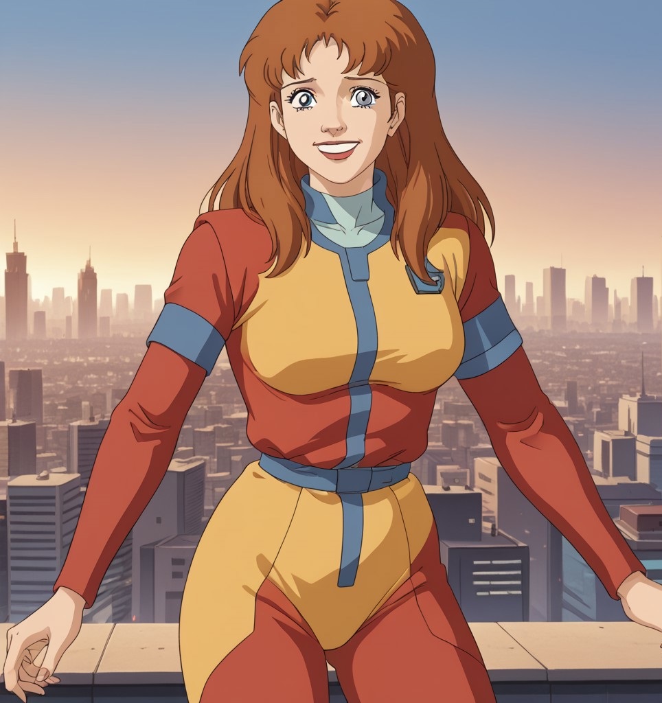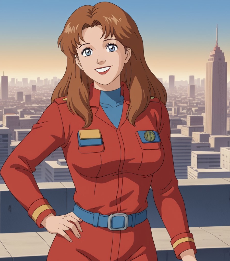 H313NB3NN3TT, blue eyes, brown hair, long hair, red bodysuit, yellow bodysuit, uniform, retro artstyle, 1980s (style)