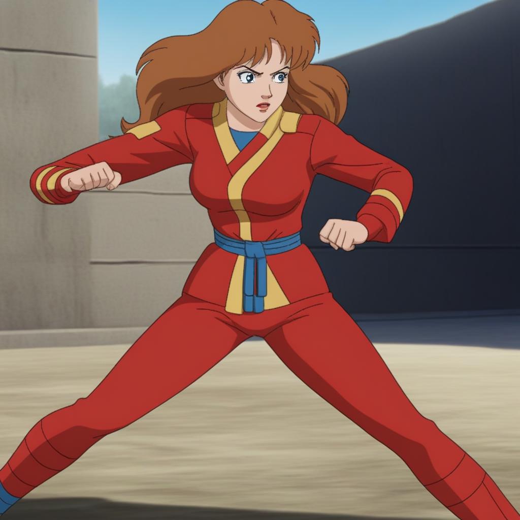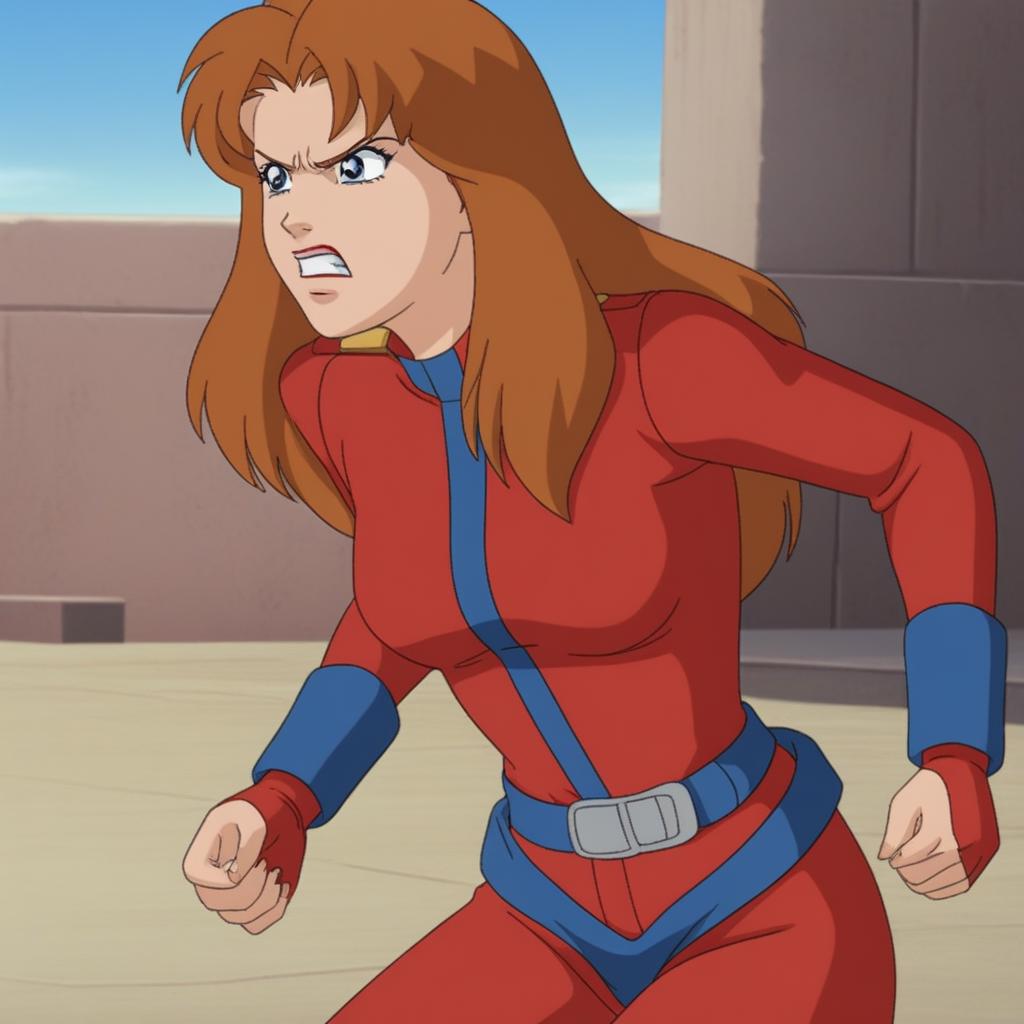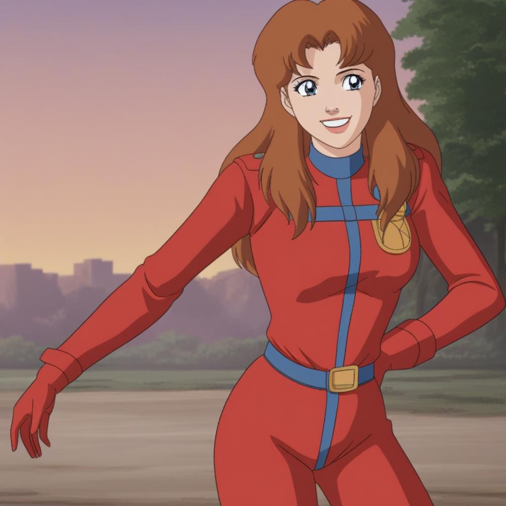 H313NB3NN3TT, blue eyes, brown hair, long hair, red bodysuit, yellow bodysuit, uniform, retro artstyle, 1980s (style)