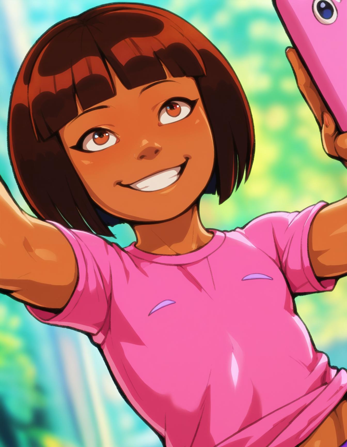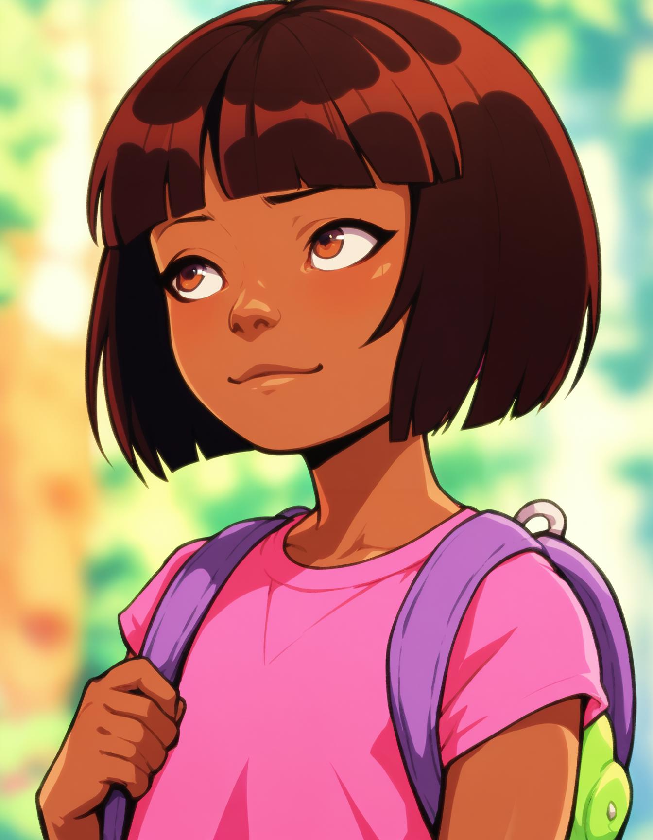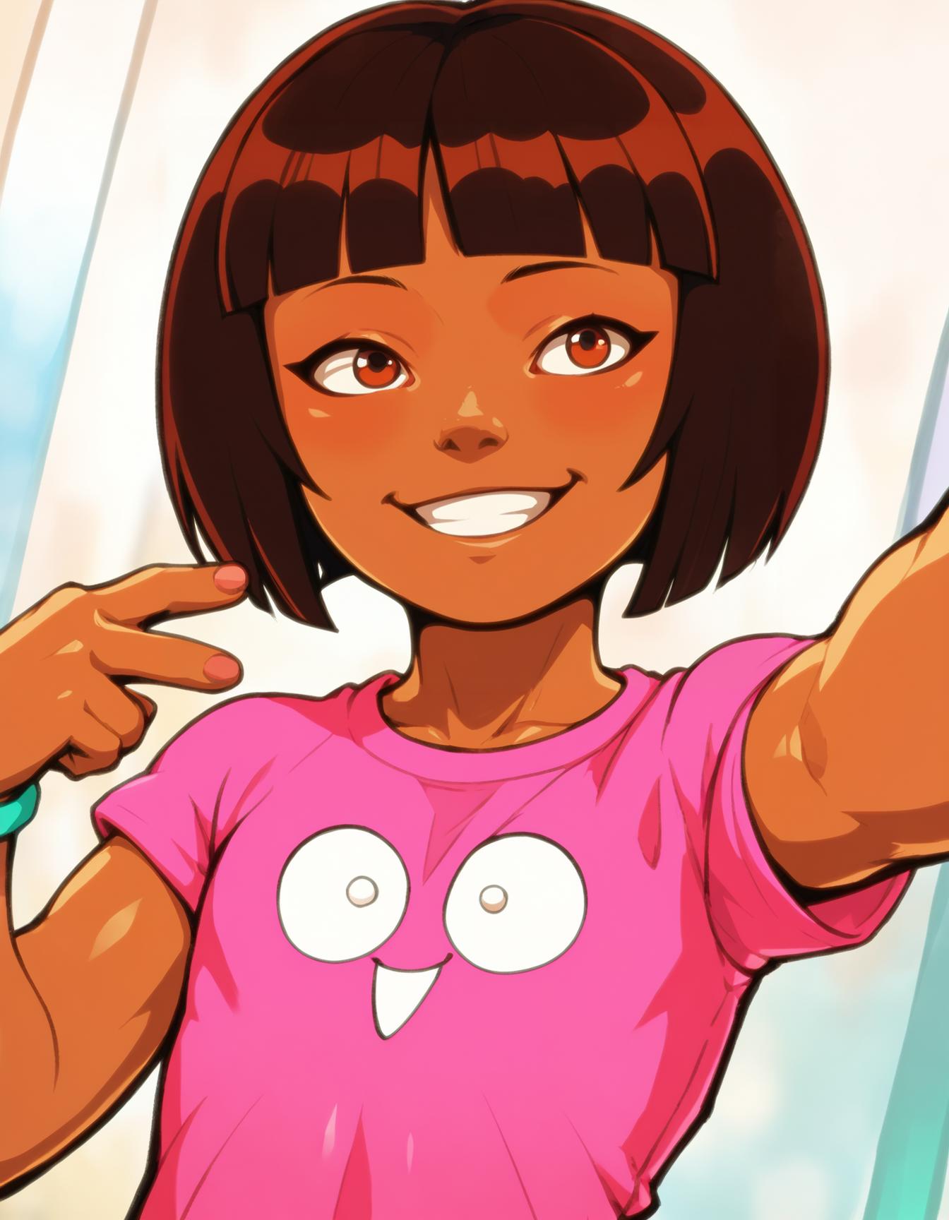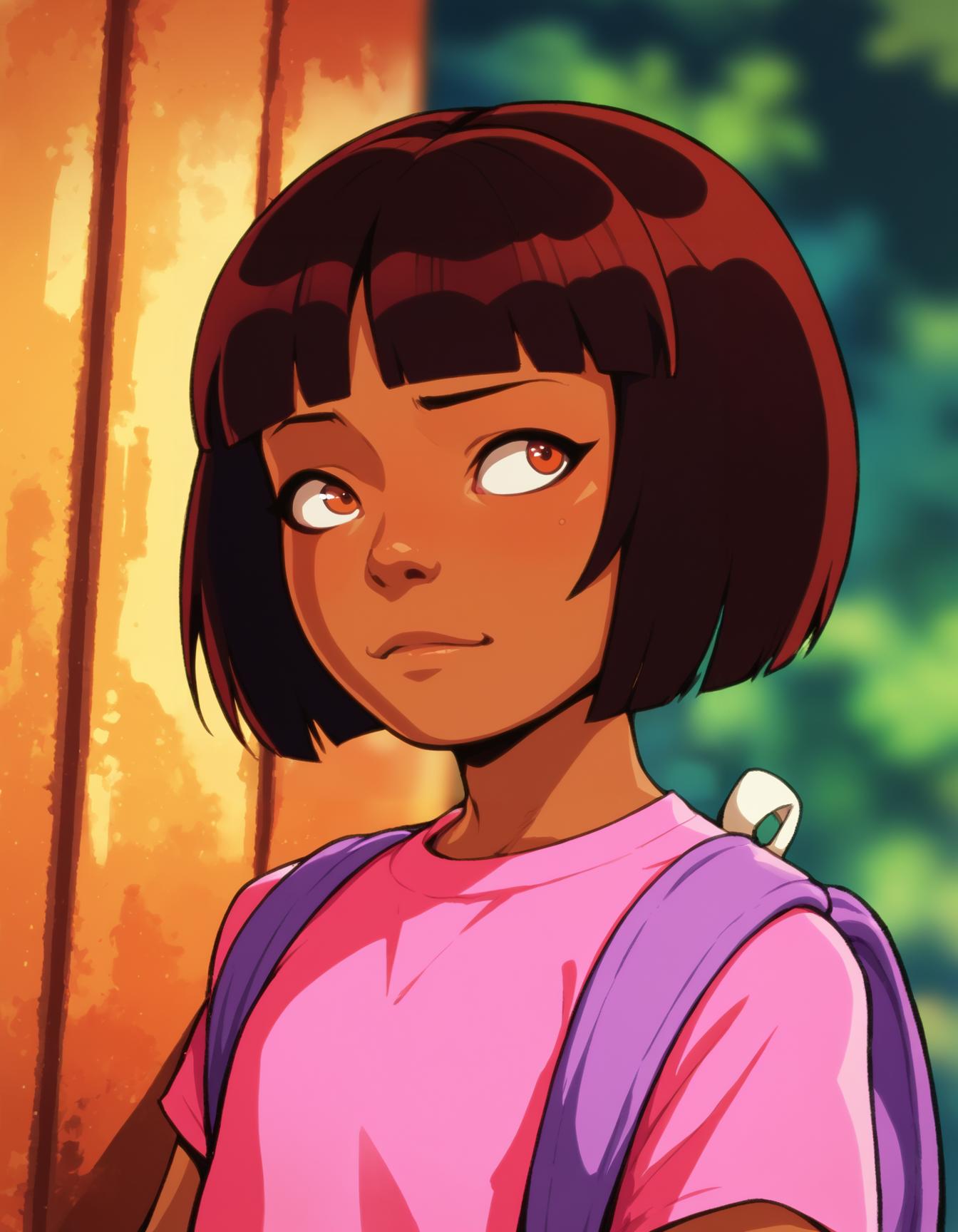 ponpudora,1girl,solo, dark skin,brown hair,short hair,flat chest, bob cut, backpack,purple backpack,shirt,pink shirt,red shorts