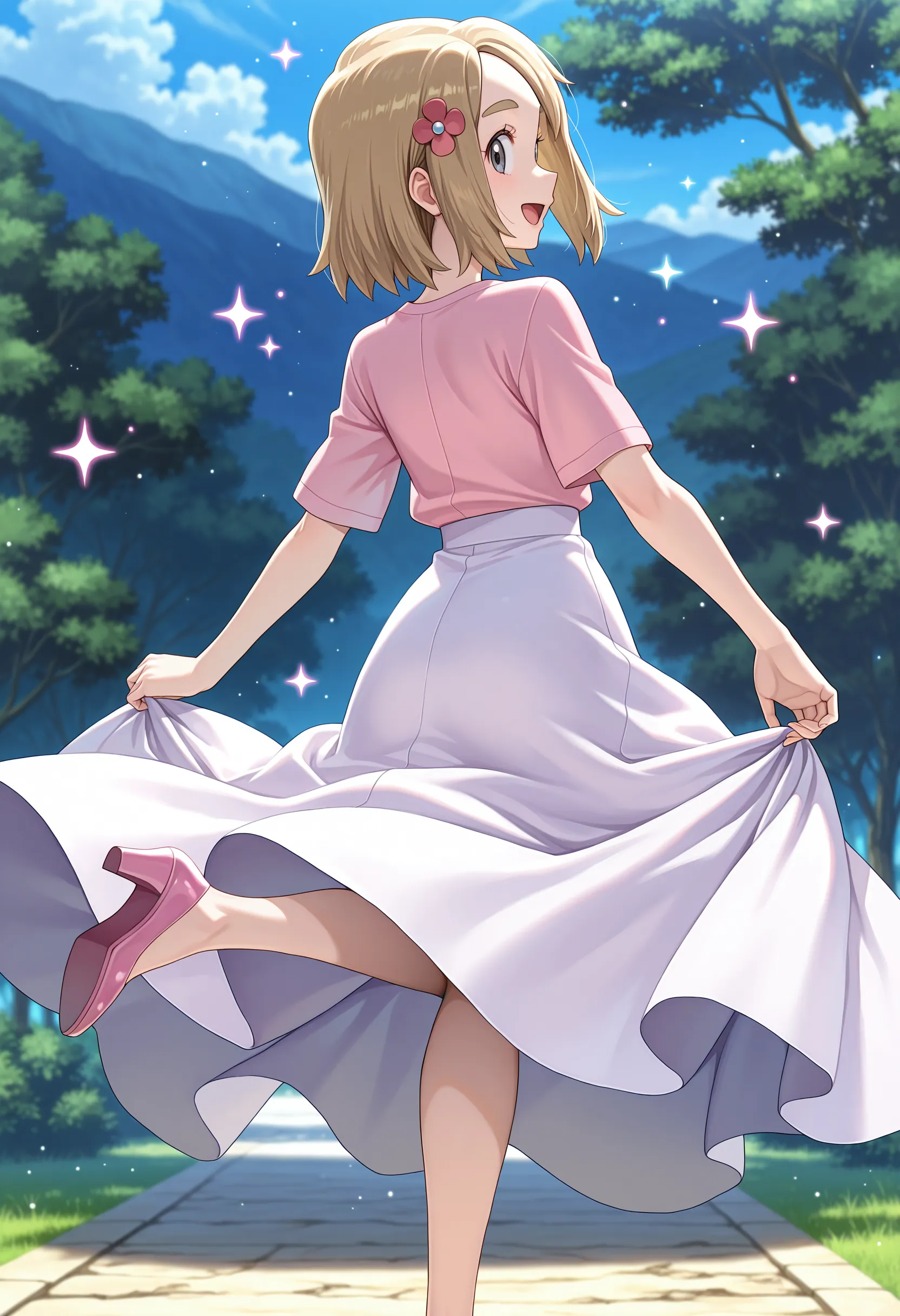 pink shirt,short sleeves,long skirt,white skirt,pink heels,