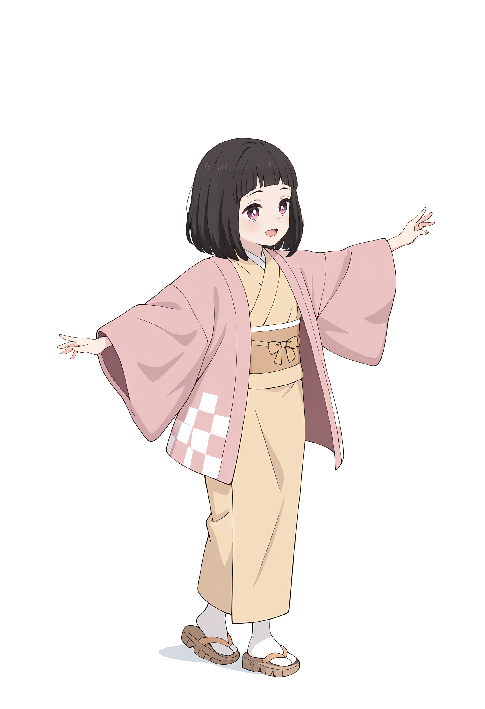 yellow kimono, pink haori, checkered haori bottom, zori, white socks,