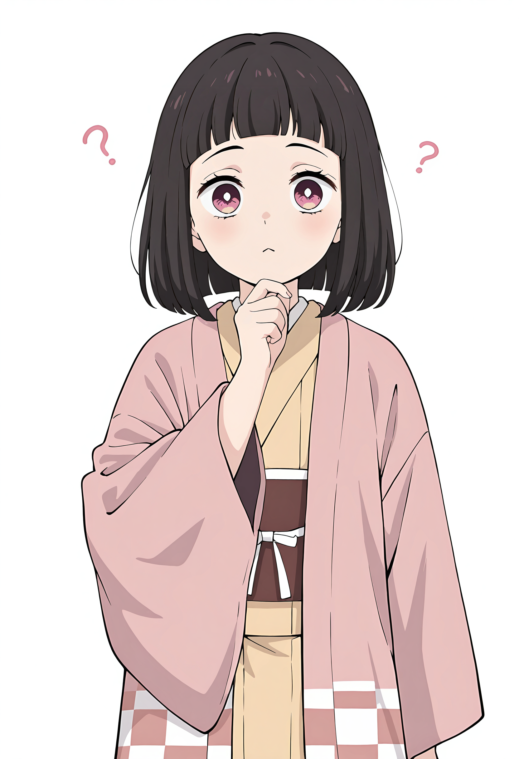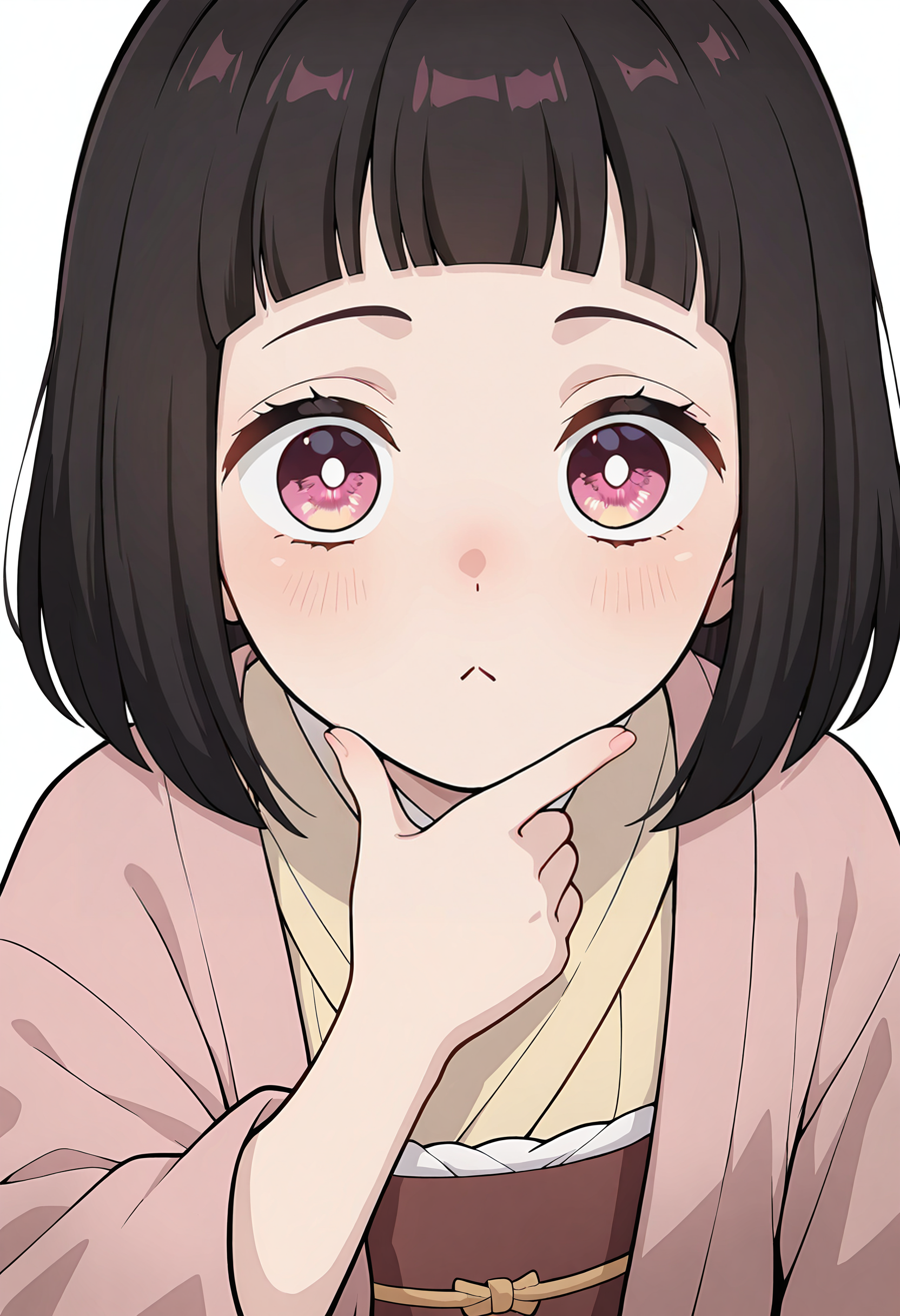 1girl, Kamado Hanako, child, solo, black hair, short hair, bangs, pink eyes, white pupils, eyelashes,