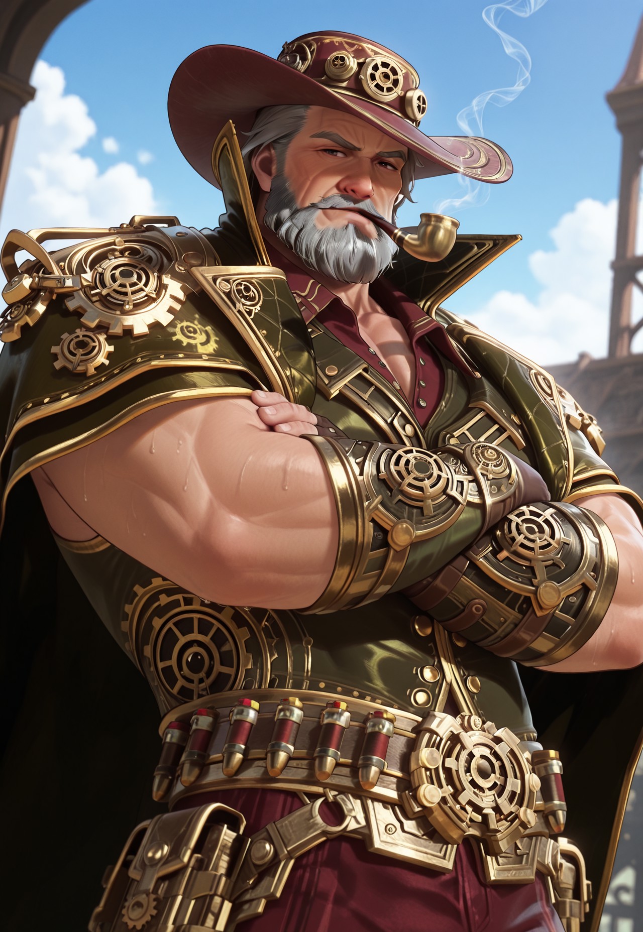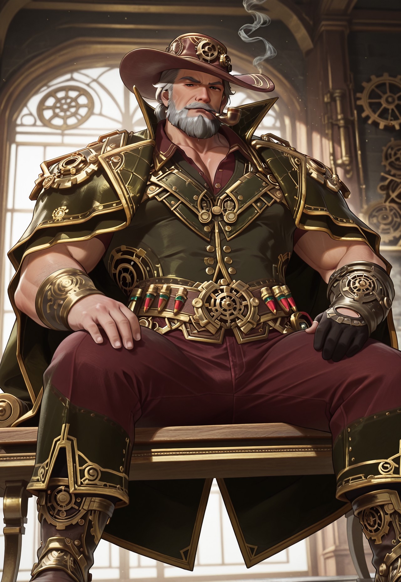 作者的起名能力只能用悲剧来形容了grey hair,beard,facial hair,mustache,coat,high collar,gloves,hat,pants,belt,black sleeveless open-collar jacket,dark green coat on shoulders,boots,smoking pipe,