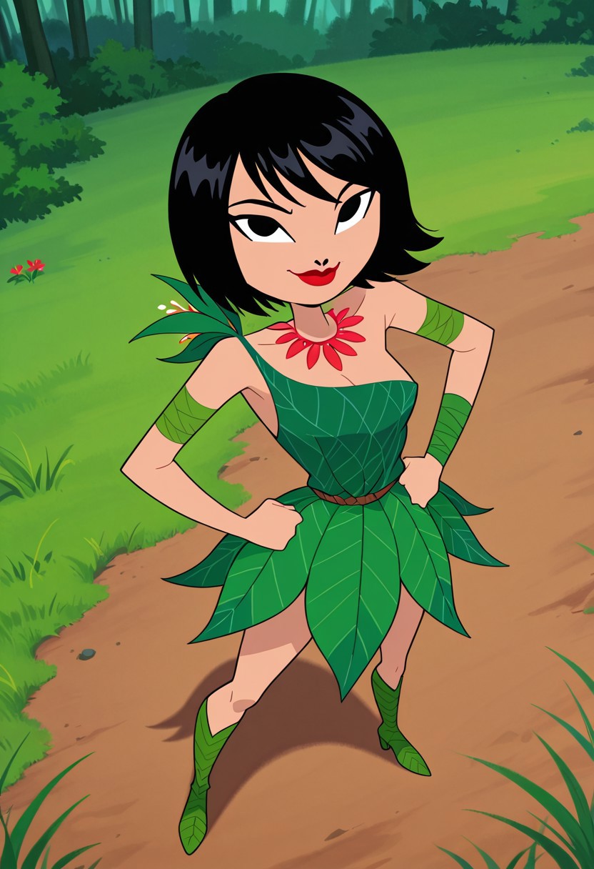 red flower necklace, green leaf dress, leaf armbands, leaf thigh-high boots
