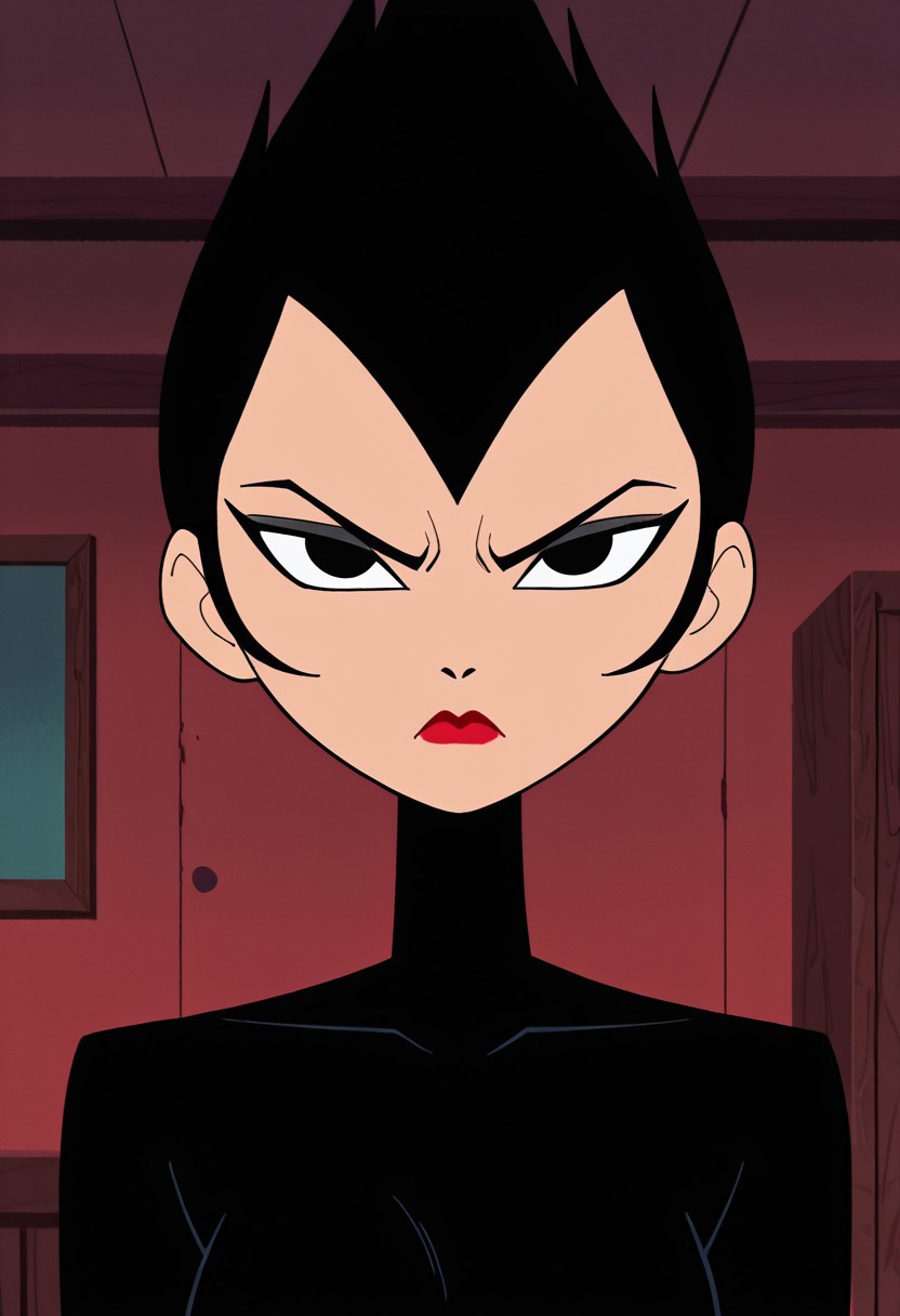 spiky pointy hair, black full bodysuit