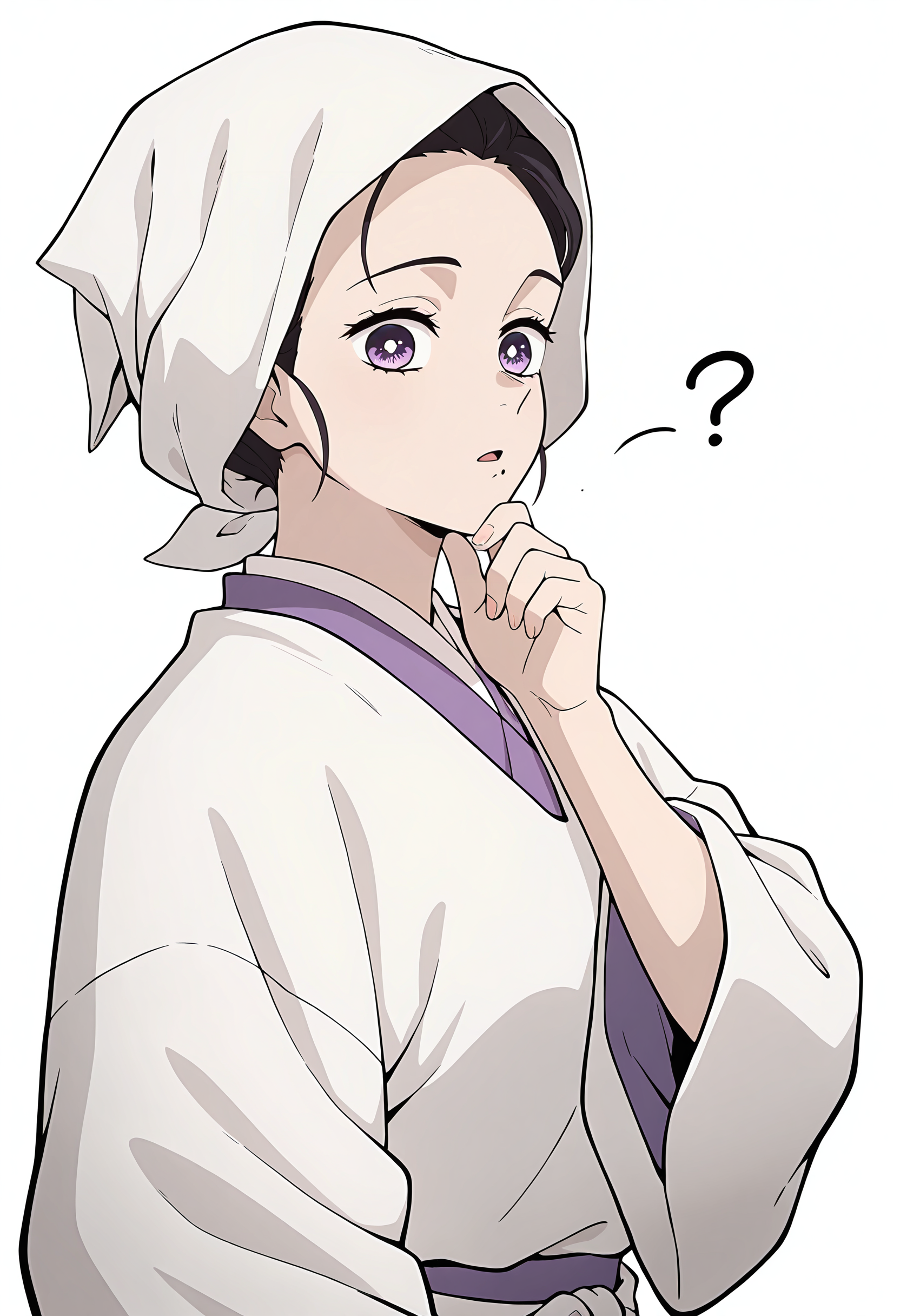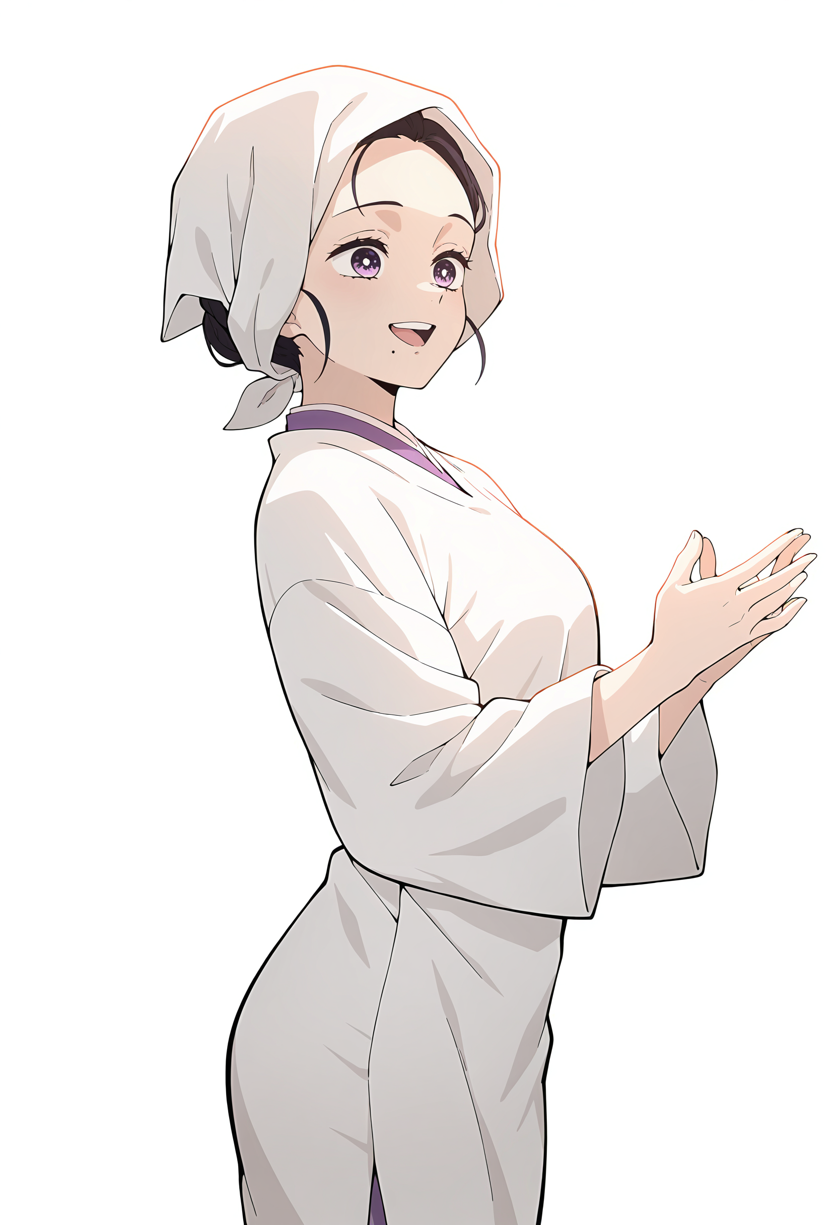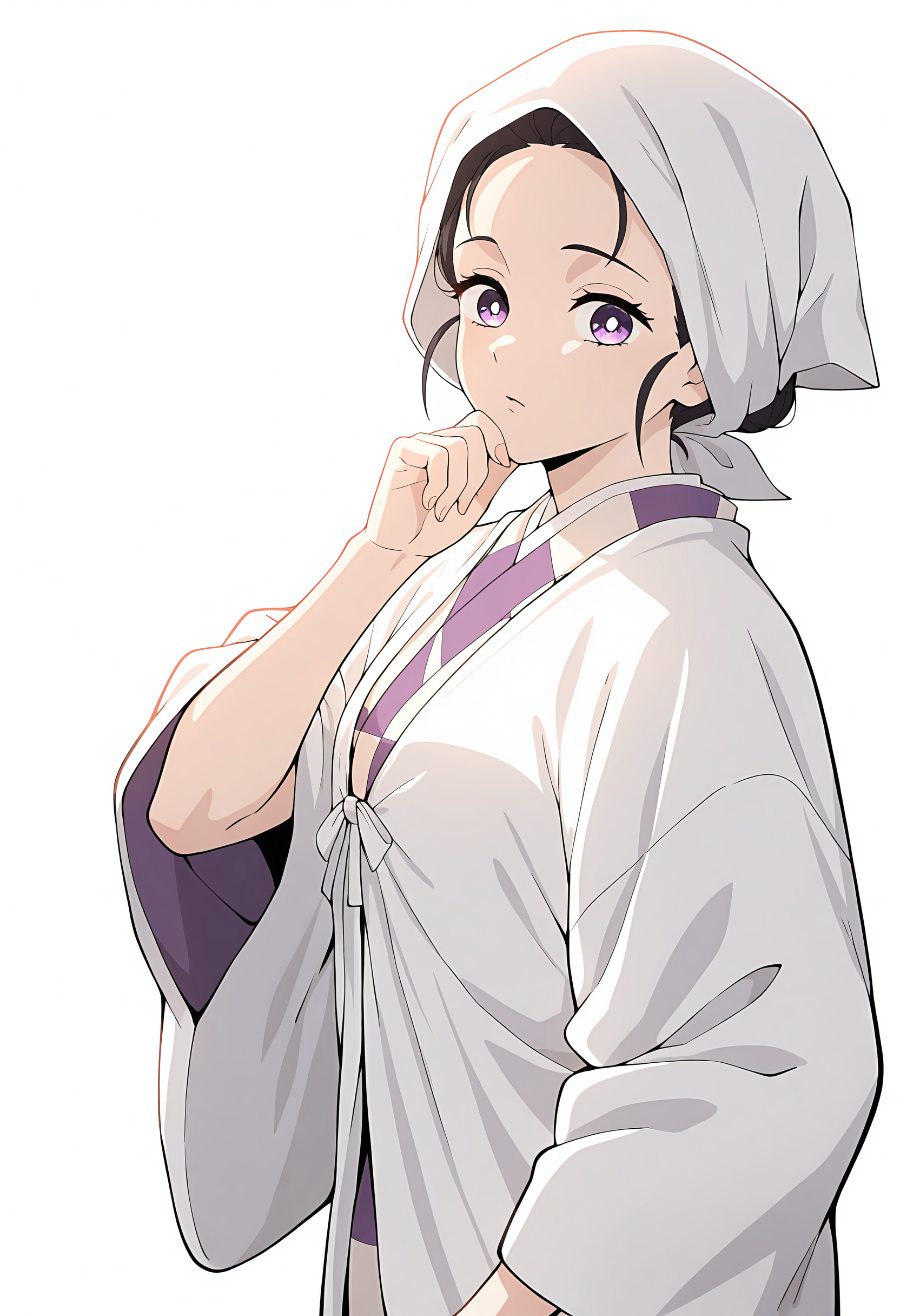 1girl, Kamado Kie, solo, white tenugui, black hair, purple eyes, white pupils, mole under lip,
