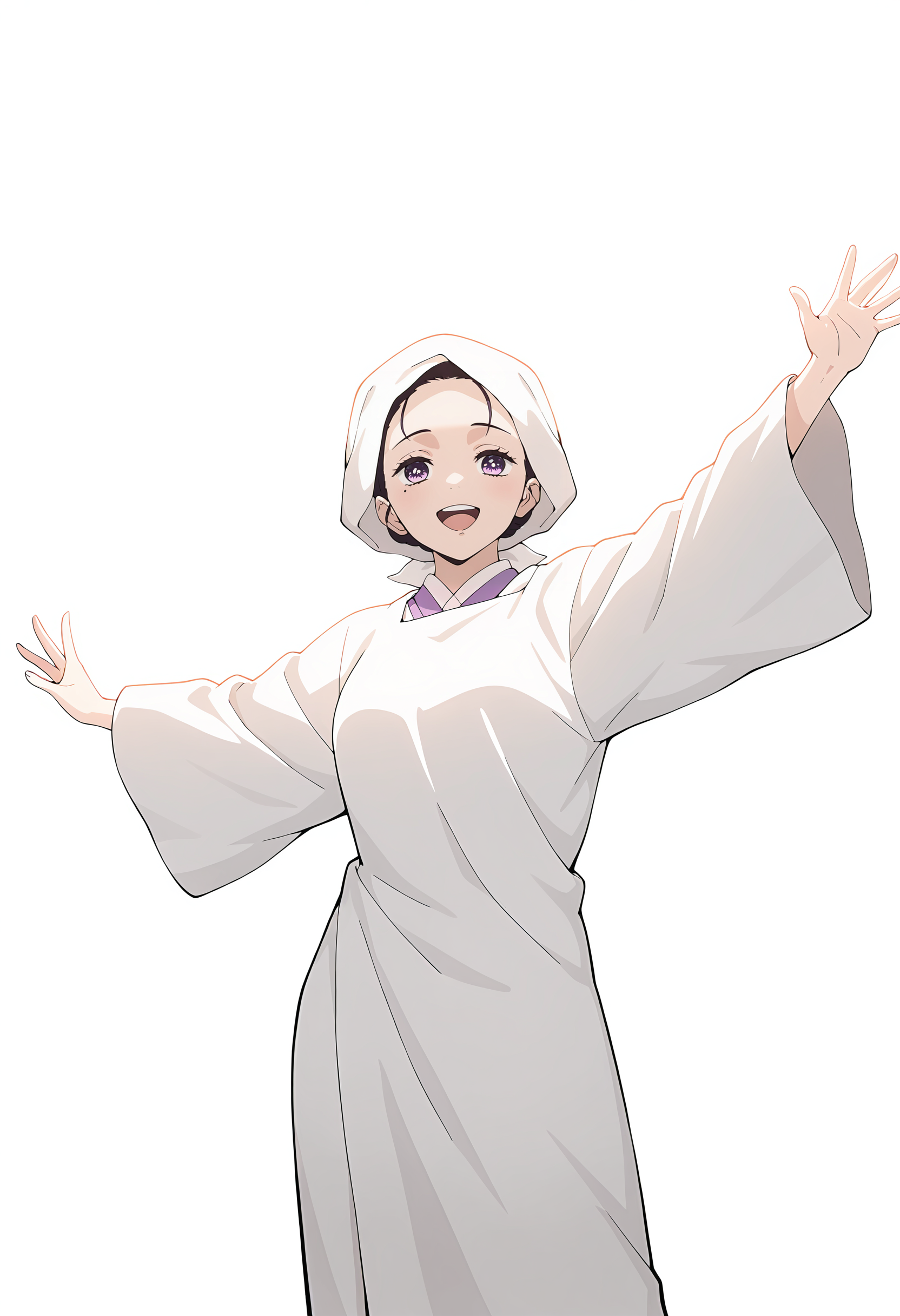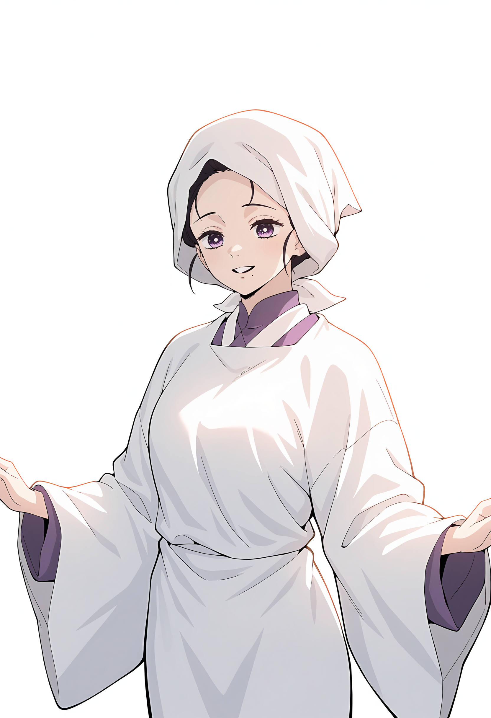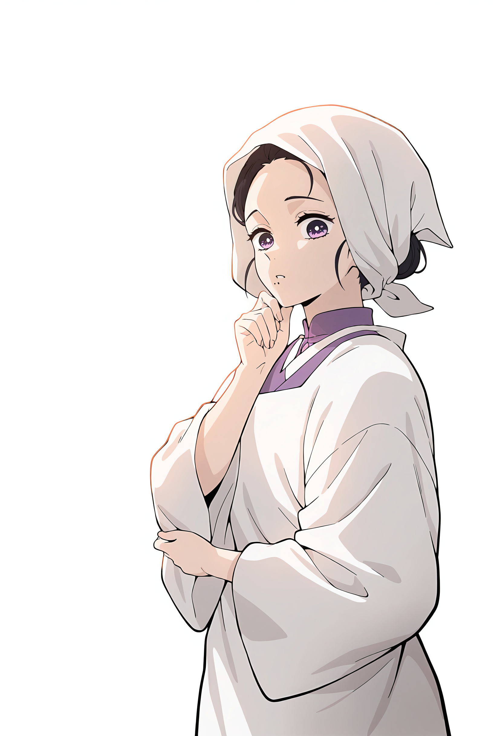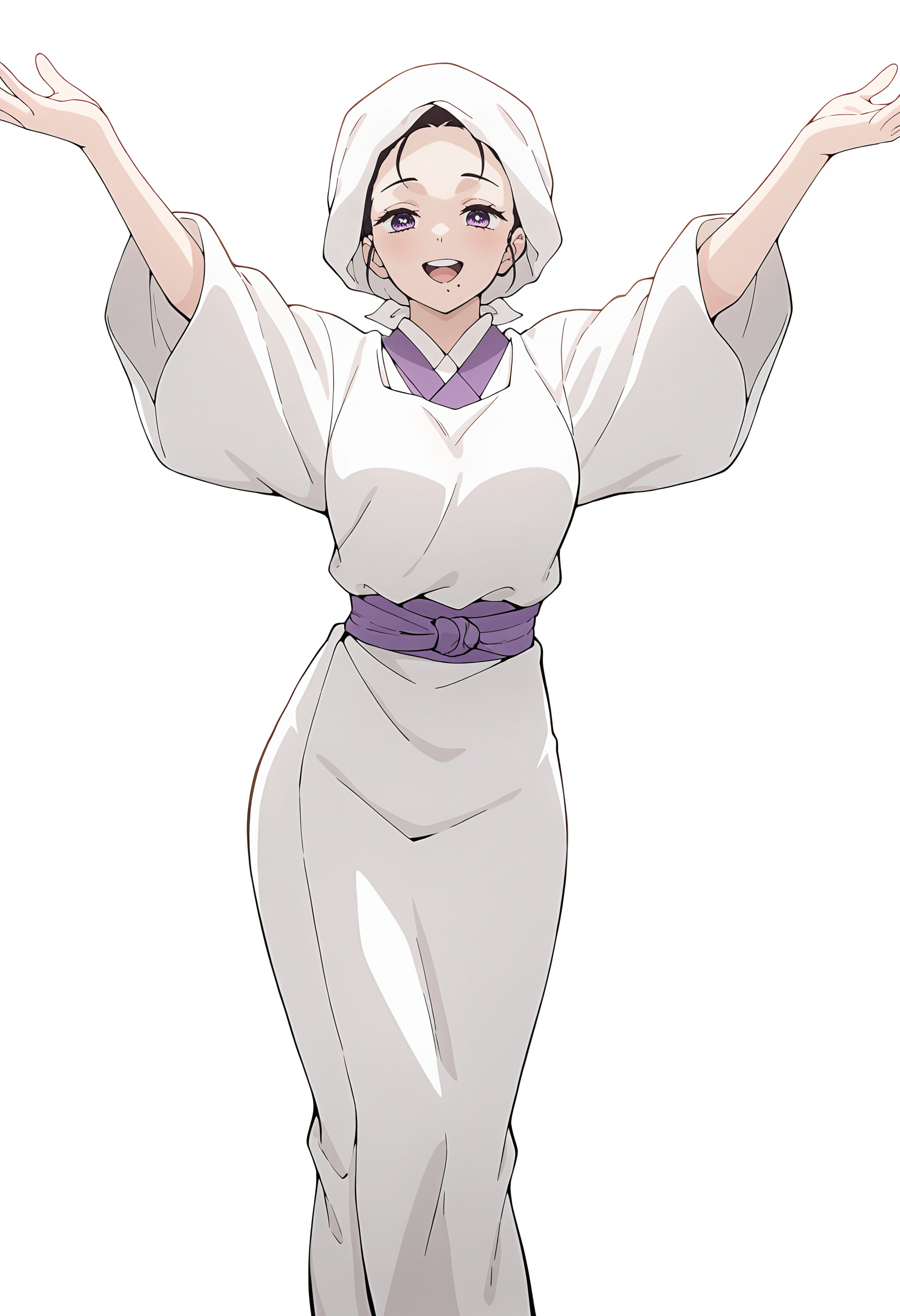 1girl, Kamado Kie, solo, white tenugui, black hair, purple eyes, white pupils, mole under lip,