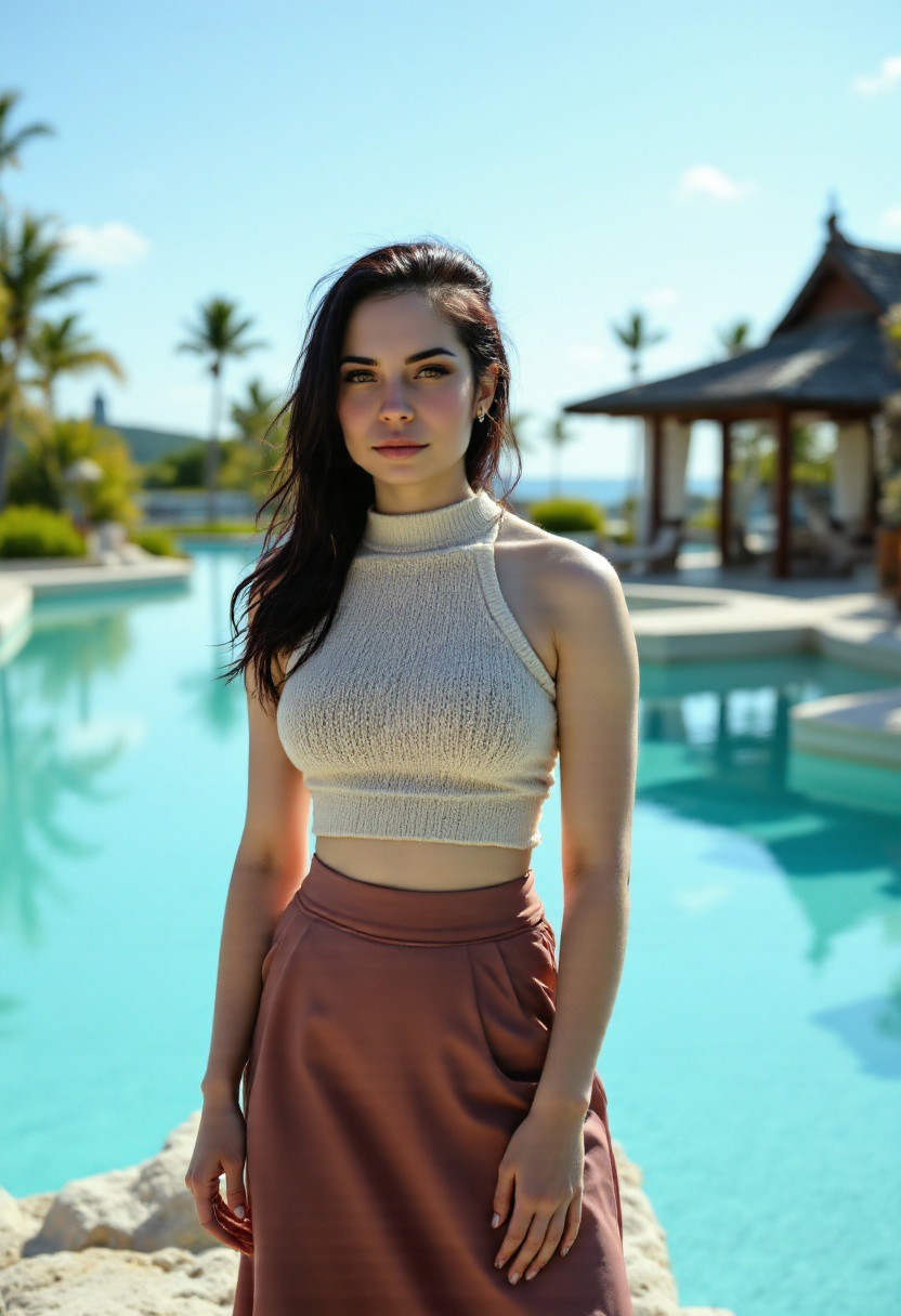 Upper body professional model portrait of 1Girl.A close up,Raw photo, Wearing cropped knitted fitted Women's Mock Neck Tank Top and a long silk skirt. Highly detailed beautiful expressive eyes. Light makeup. Standing in a tropical island lagoon. Sunny day. Vibrant dynamic light. Photorealistic, Natural atmospheric lighting, intricate details, 35mm photograph, film, professional, 4k visuals, highly detailed, elegant, studio quality, elegant black hair, <lora:(Edit)_aidmaFLUXPro1.1-FLUX-v0.3:0.7> <lora:Mgrt03:1>