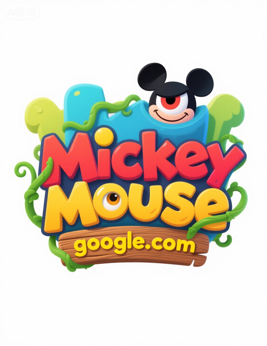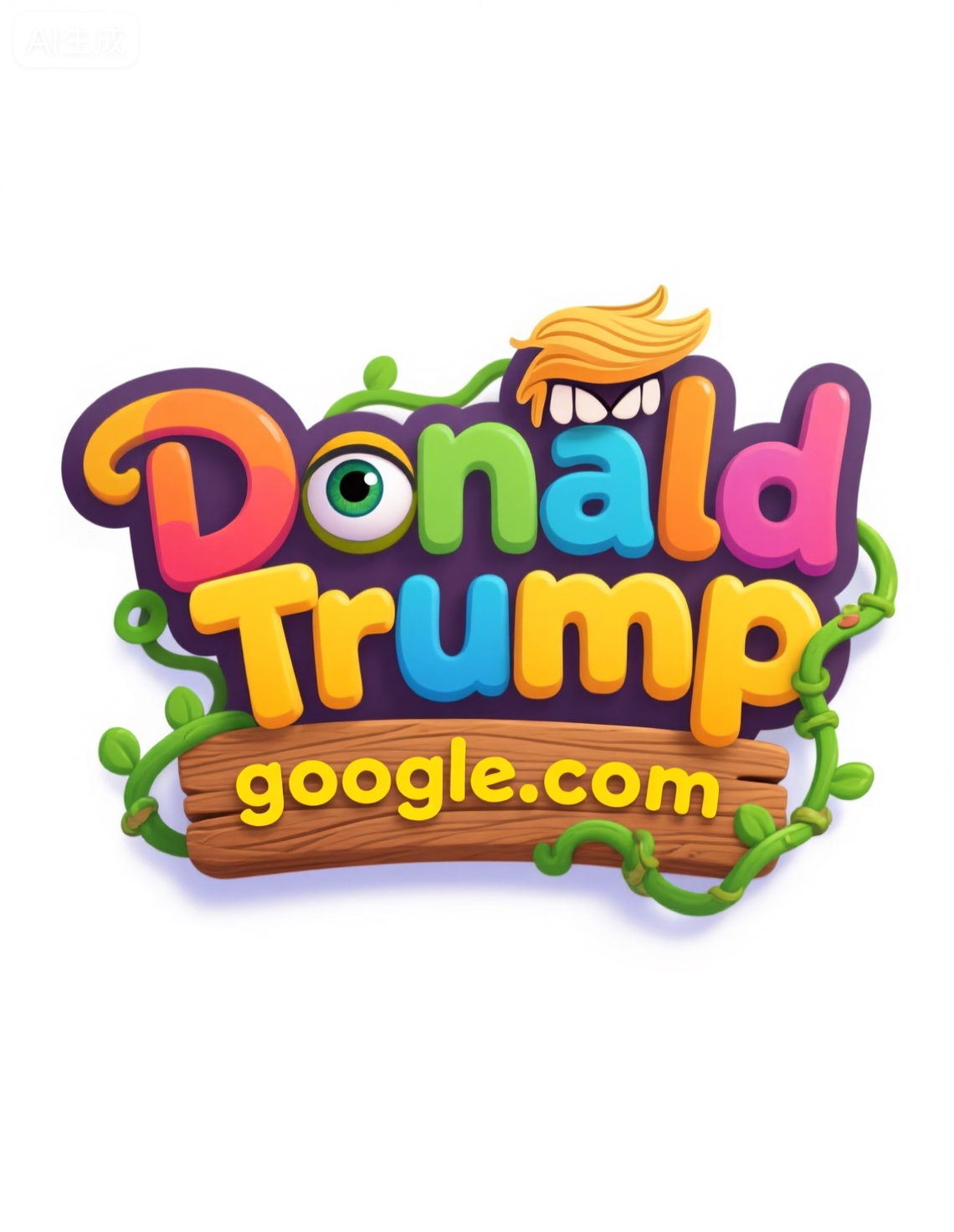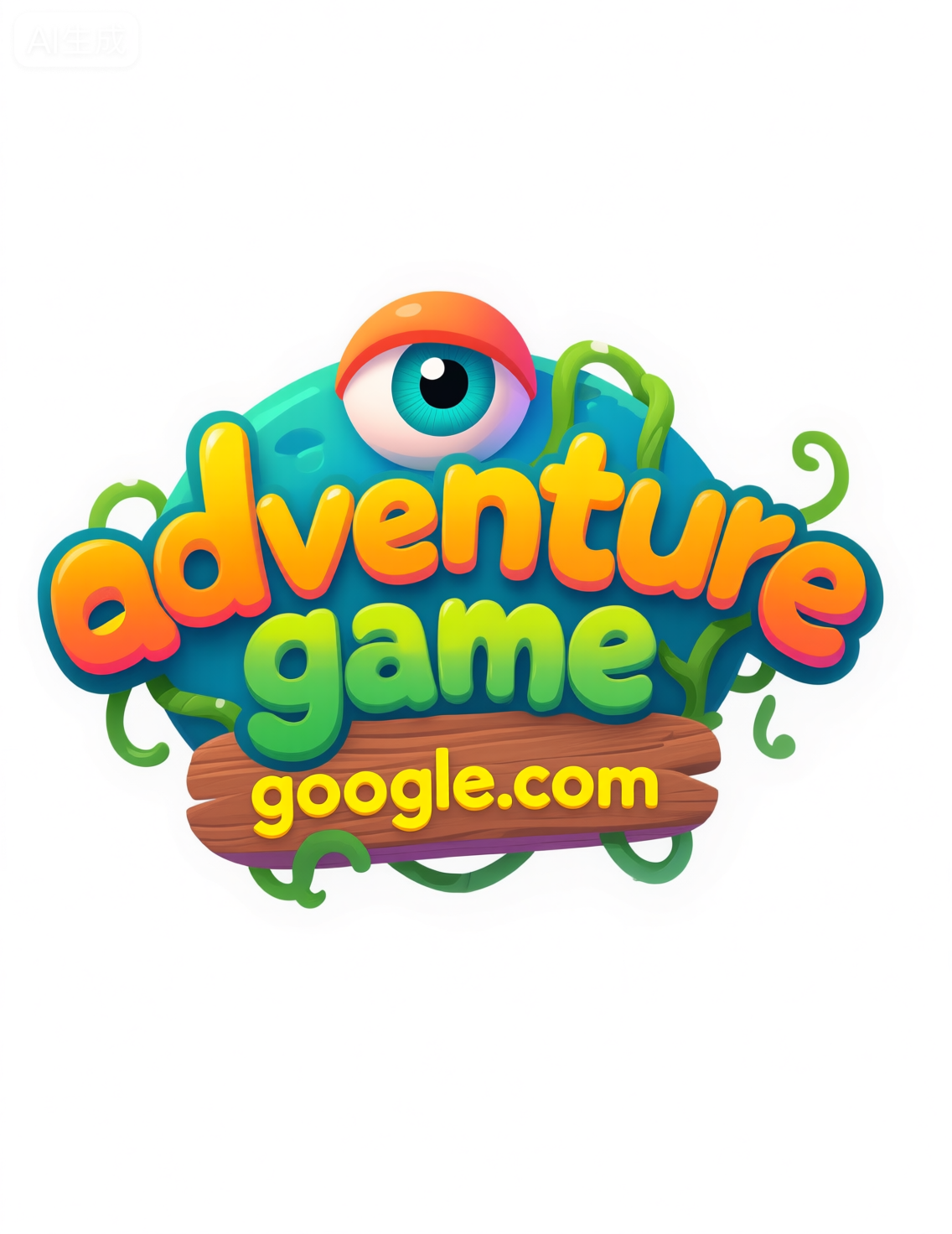 white_background,colorful cartoon game logo,the main body of the logo is the text "adventure game" in an artistic font,lively design,a mischievous eye above the letters adds a lively and interesting touch,below the text is the yellow text "google.com" with a wooden texture,green vines meander through the text,the overall style is full of childhood innocence and imagination.,