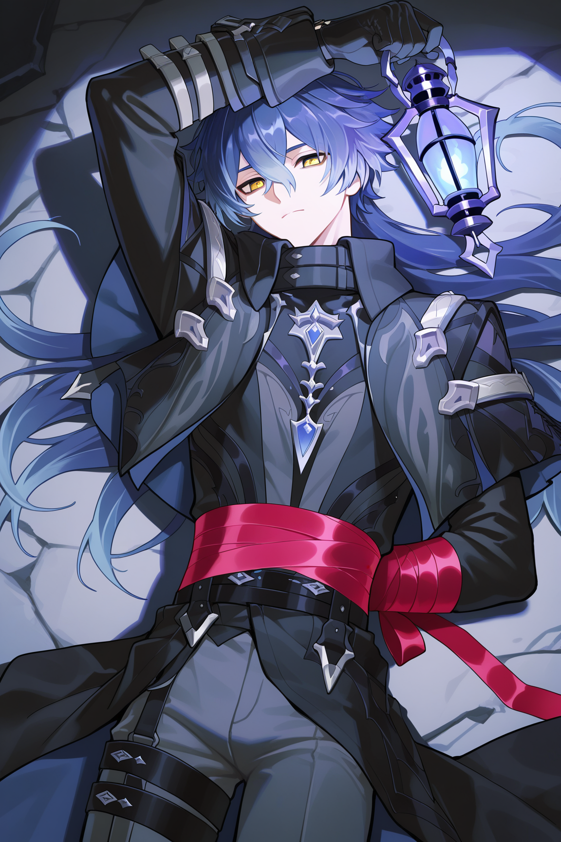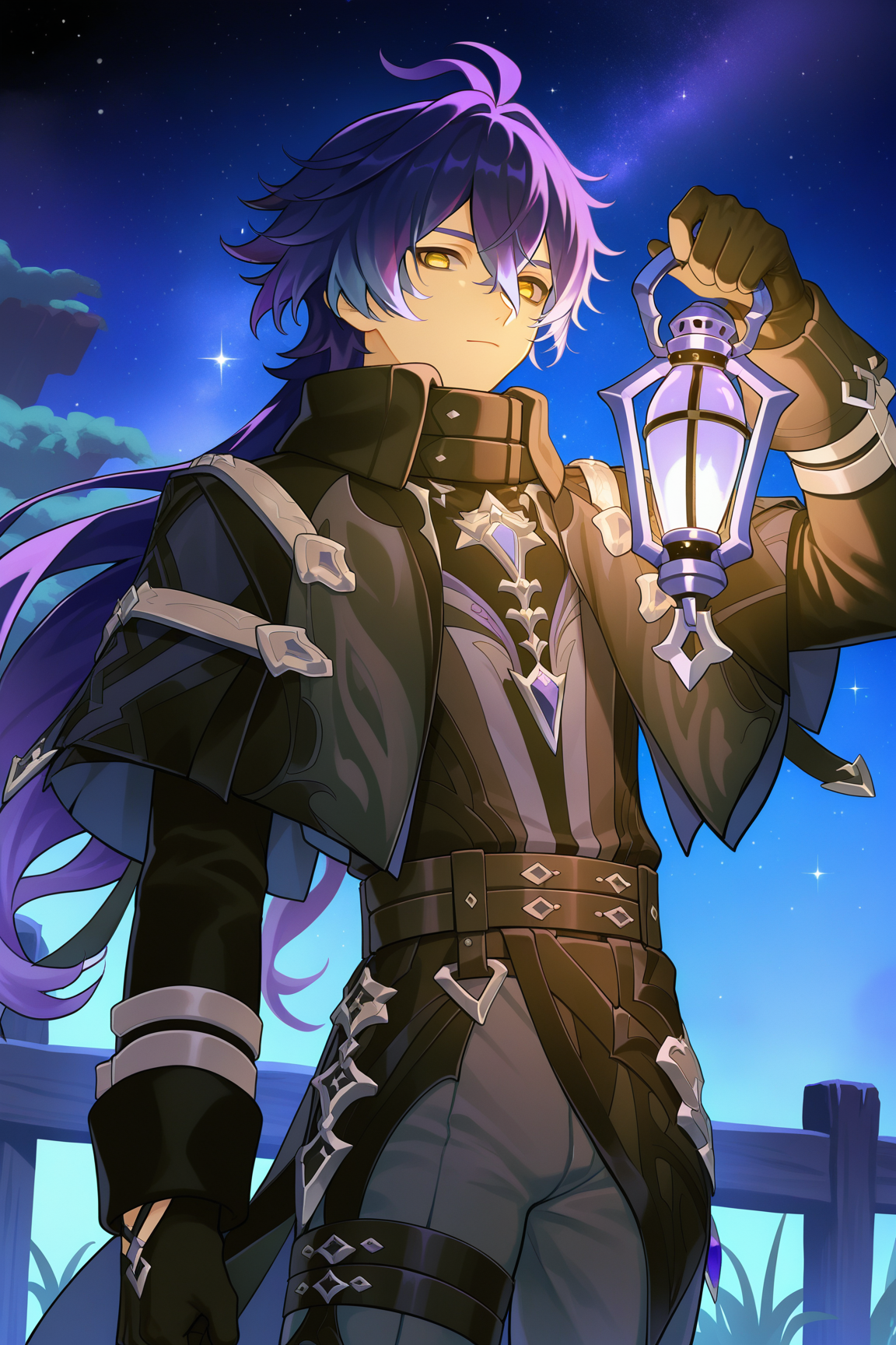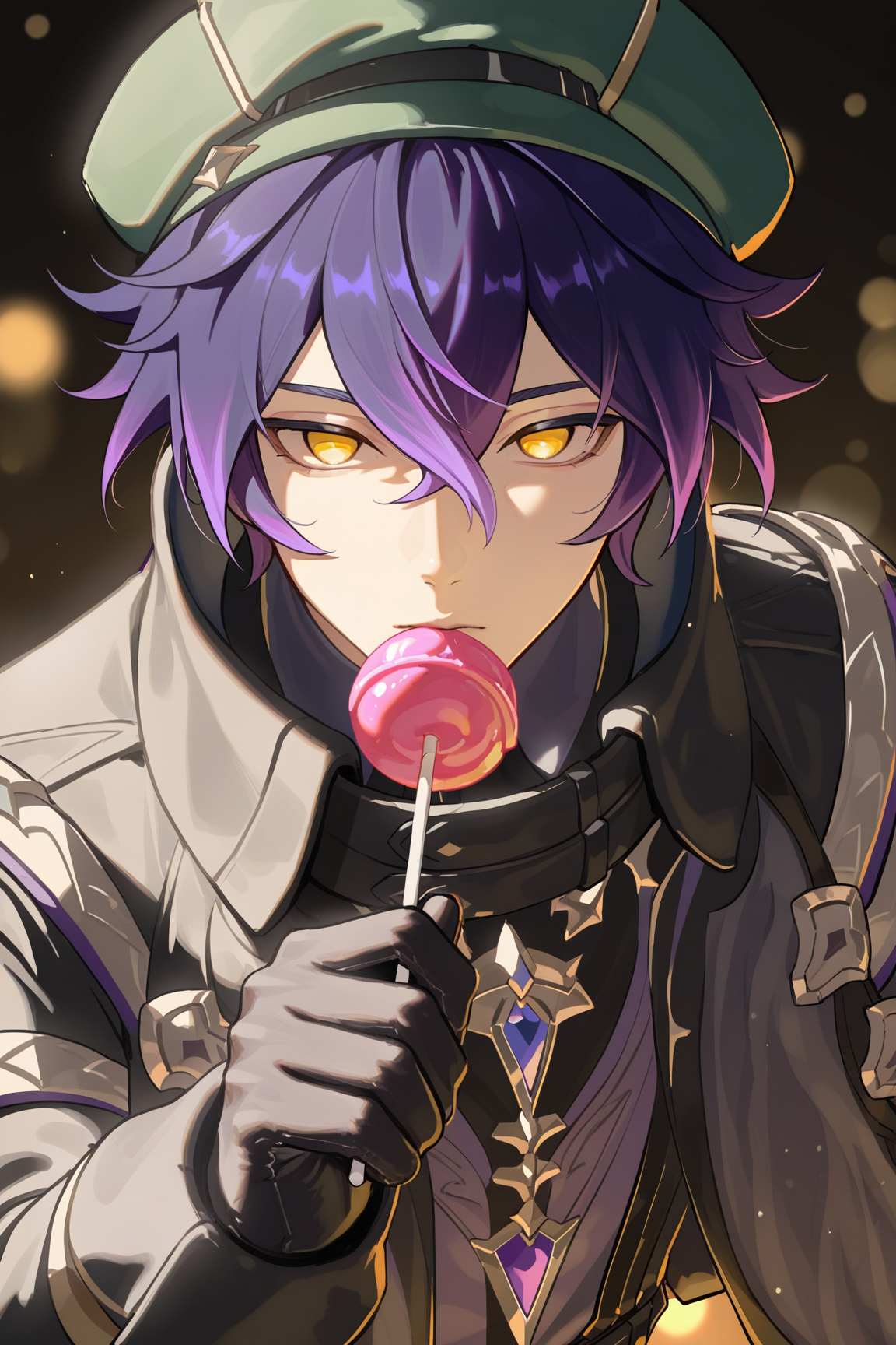 flins \(genshin impact\), 1boy, male focus, long hair, hair between eyes, yellow eyes, purple hair, long sleeves, hair between eyes, gloves, black capelet, black gloves, pants, capelet