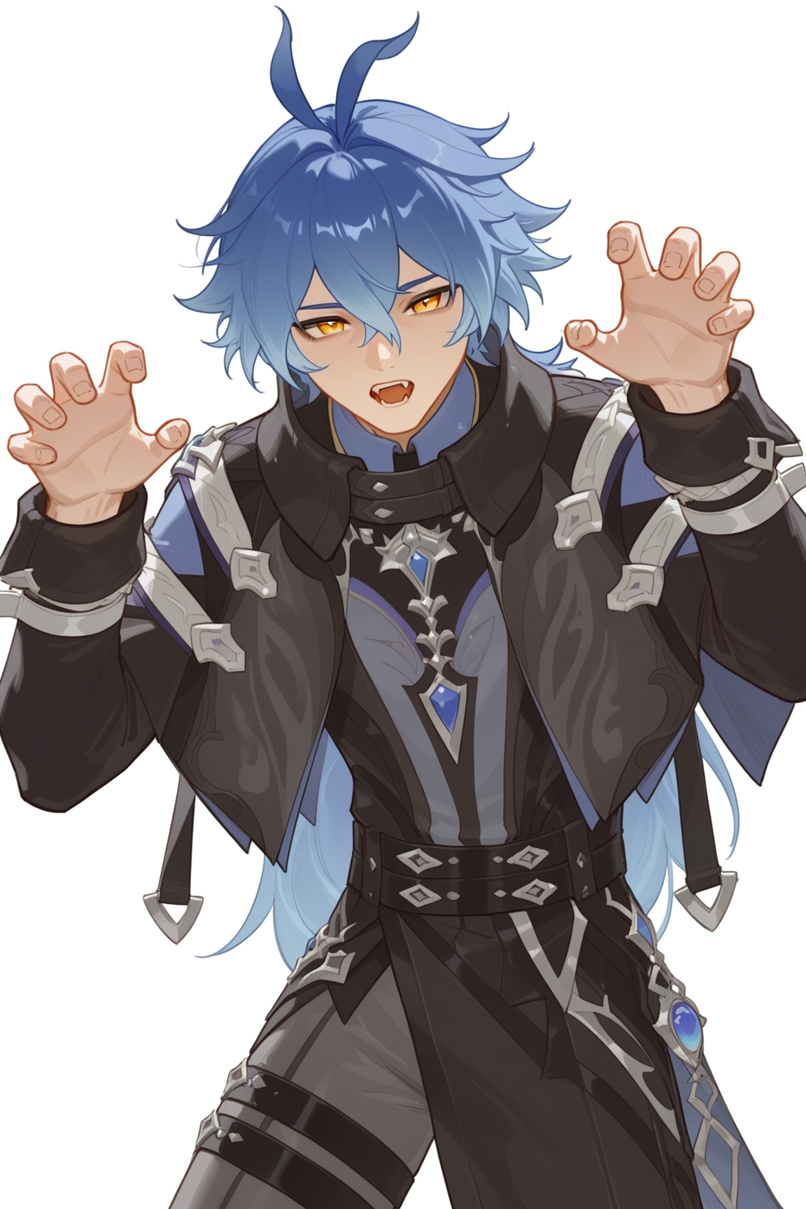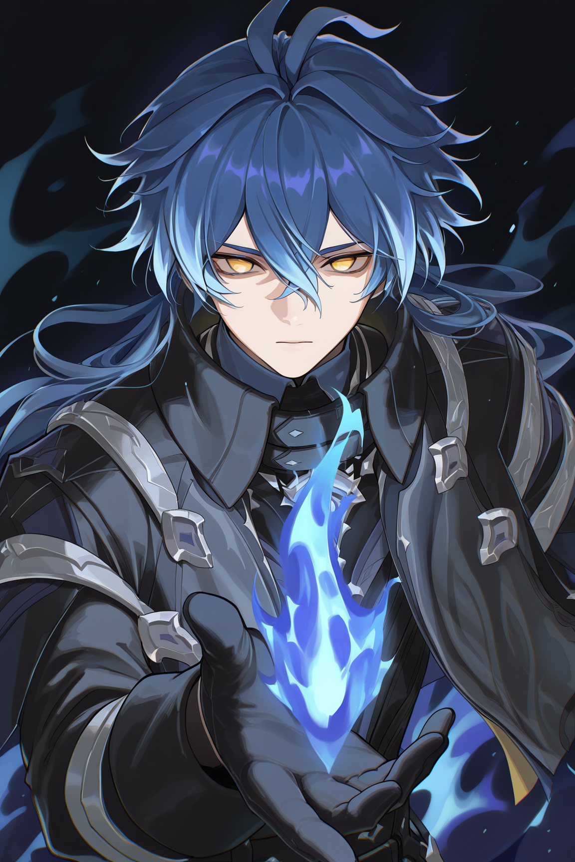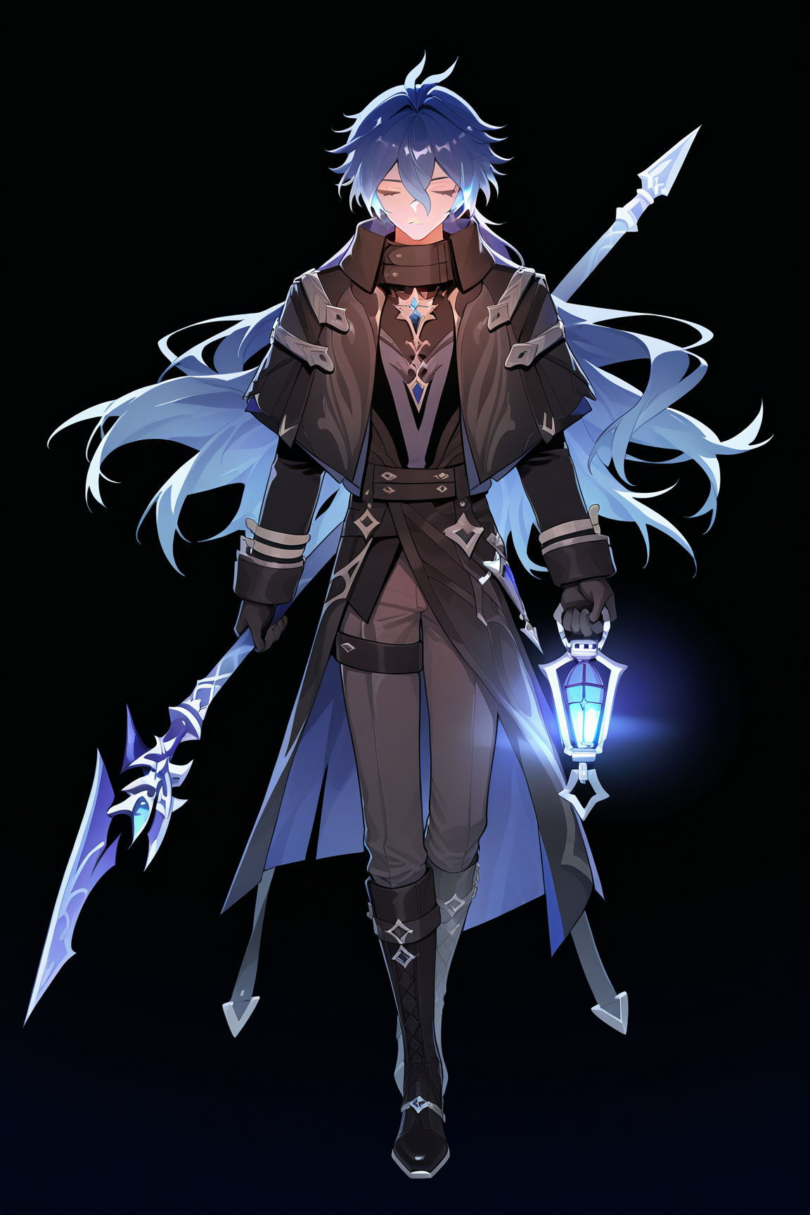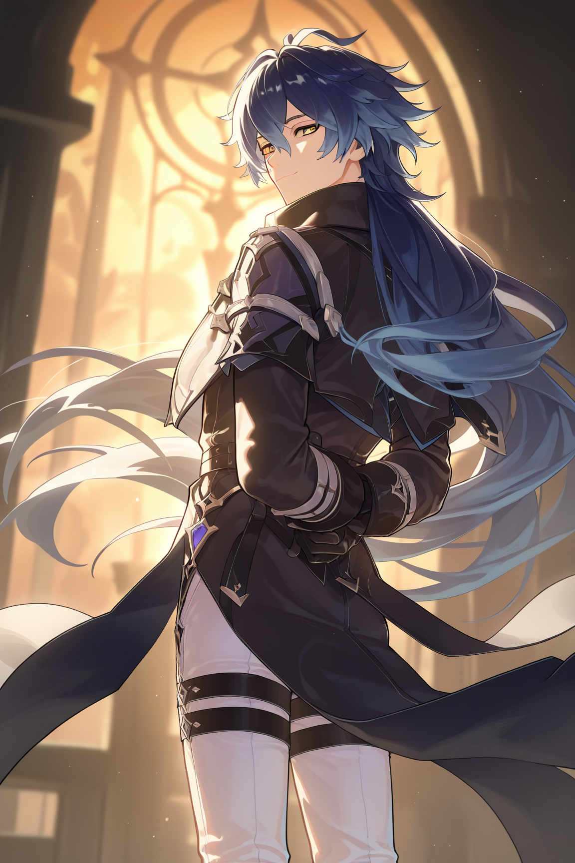 flins \(genshin impact\), 1boy, male focus, long hair, hair between eyes, yellow eyes, purple hair, long sleeves, hair between eyes, gloves, black capelet, black gloves, pants, capelet