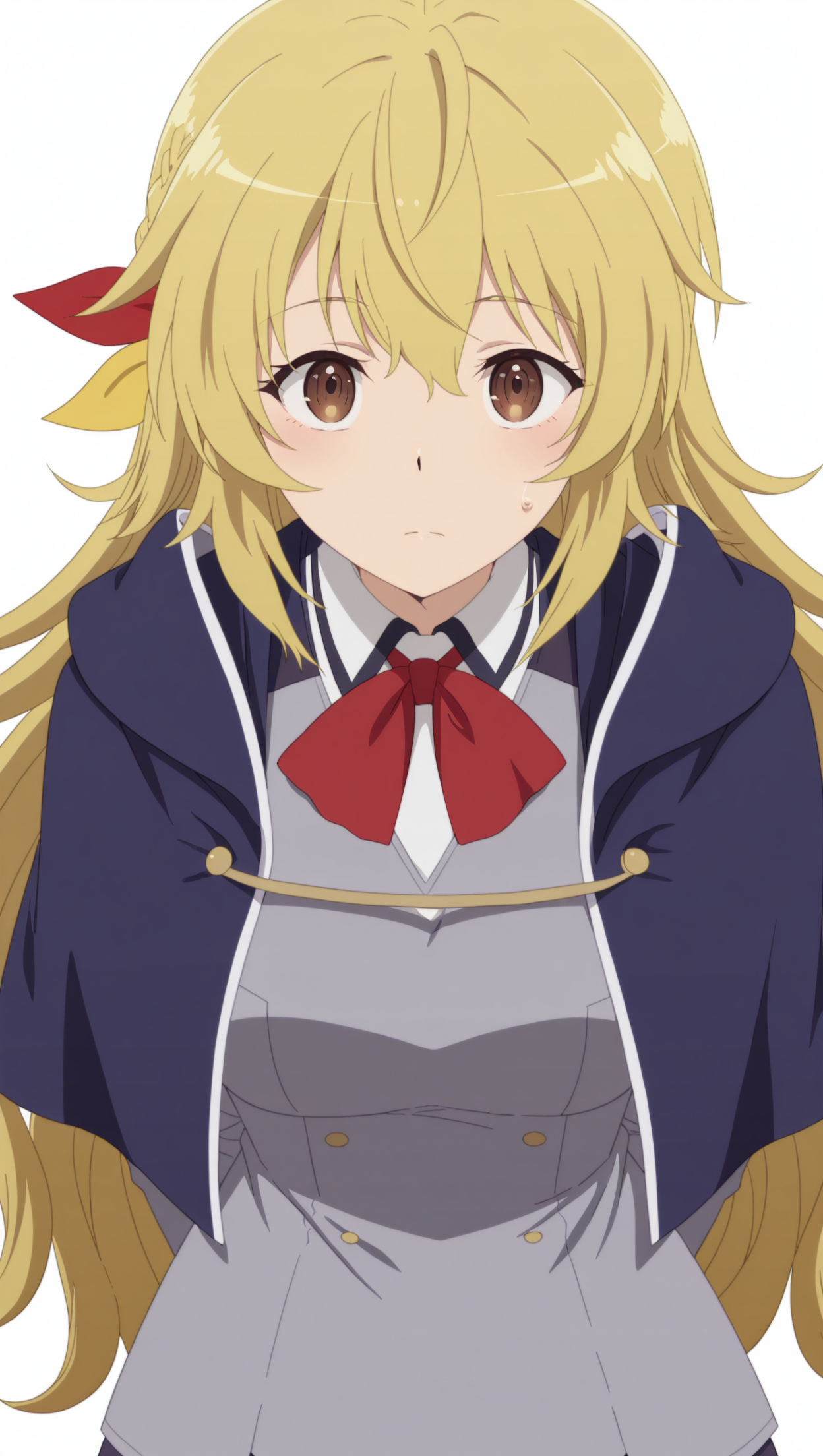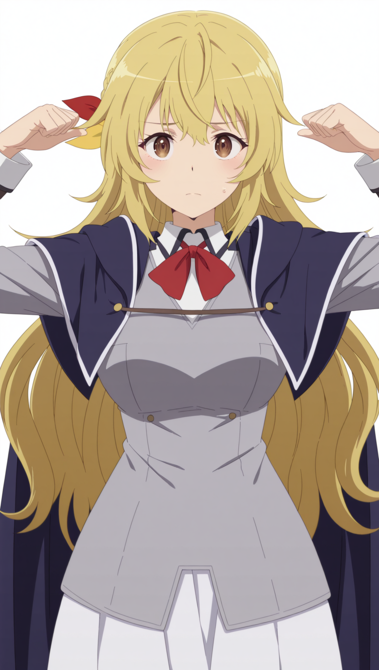 anime coloring, masterpiece, best quality, amazing quality, yifa, 1girl, long hair, blonde hair, brown eyes, medium breasts, hair ornament, cape, bowtie, shirt, collared shirt, grey shirt, skirt, pleated skirt, white skirt, thighhighs, solo, full body, smile, shoes, school uniform, breasts, looking at viewer, simple background, white background, long sleeves, solo, pose, standing, looking at viewer, from front, ((((white background, simple background))))