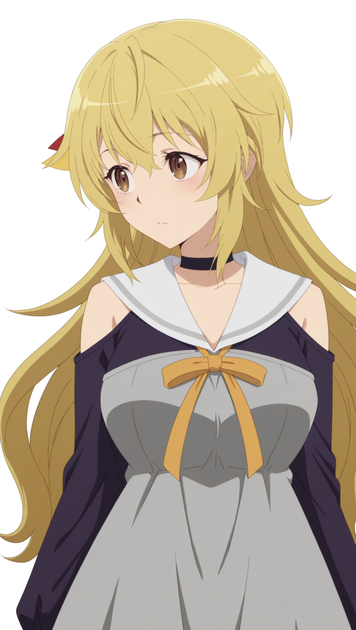 anime coloring, masterpiece, best quality, amazing quality, yifa, 1girl, long hair, blonde hair, brown eyes, medium breasts, hair ornament, choker, sailor collar, neck ribbon, dress, shoulder cutout, long sleeves, solo, blush, breasts, open mouth, indoors, collarbone, solo, pose, standing, looking at viewer, from front, ((((white background, simple background))))