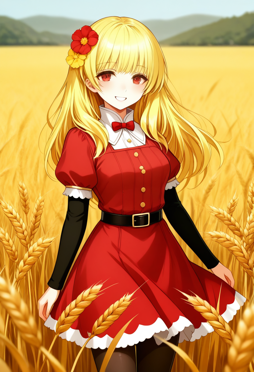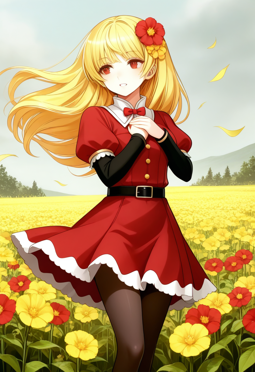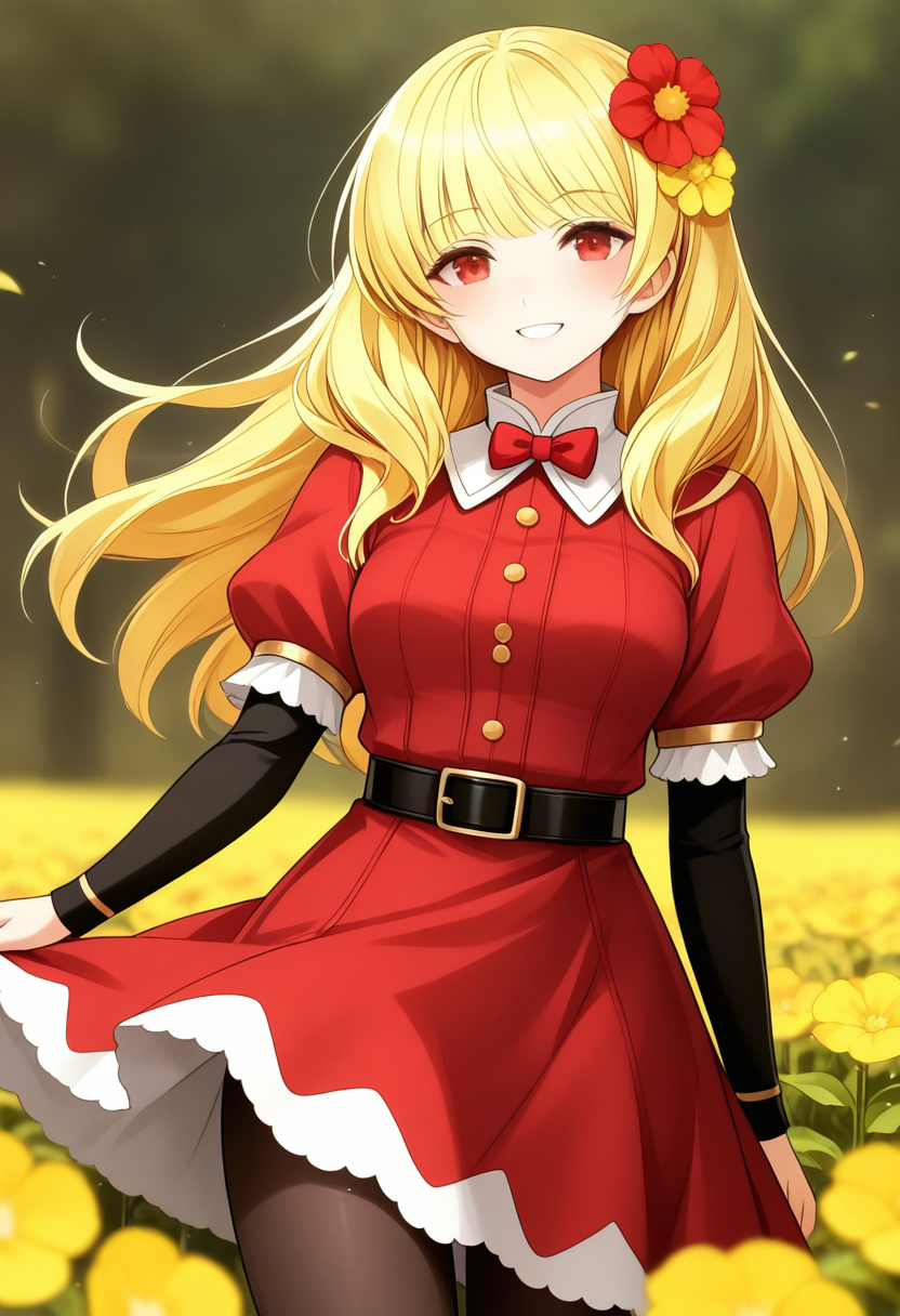 anurisu2\(ASTLIBRA\),1girl,solo,hair flower,hair ornament,blonde hair,smile,long hair,bowtie,red dress,belt,layered sleeves,looking at viewer,red bowtie,short over long sleeves,puffy sleeves,yellow flower,red eyes,black pantyhose,red flower,puffy short sleeves,black belt,belt buckle,buttons,