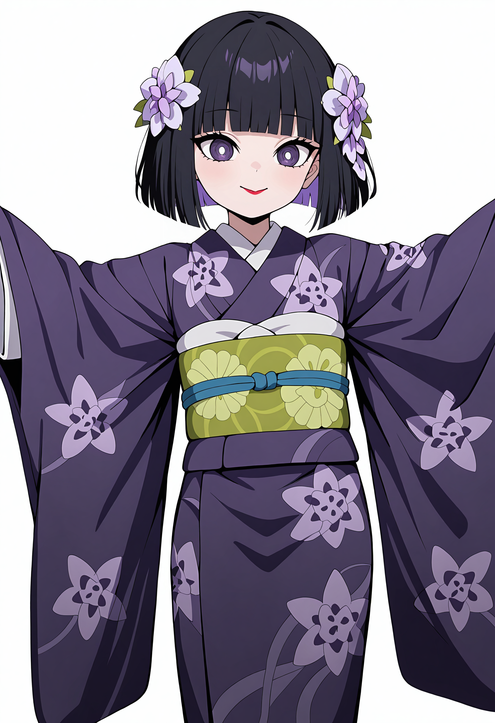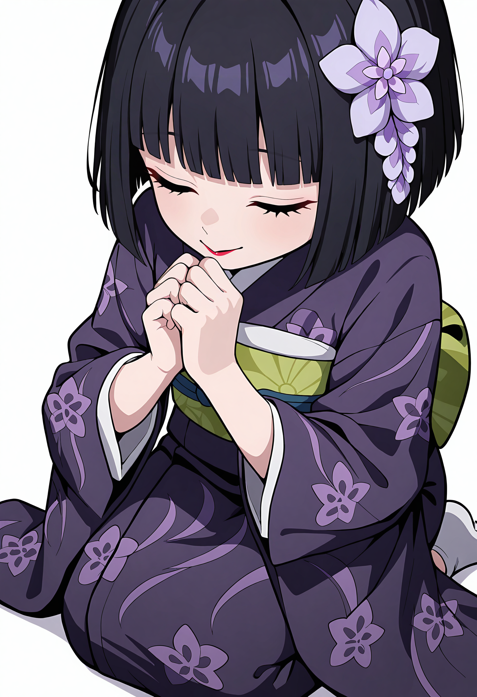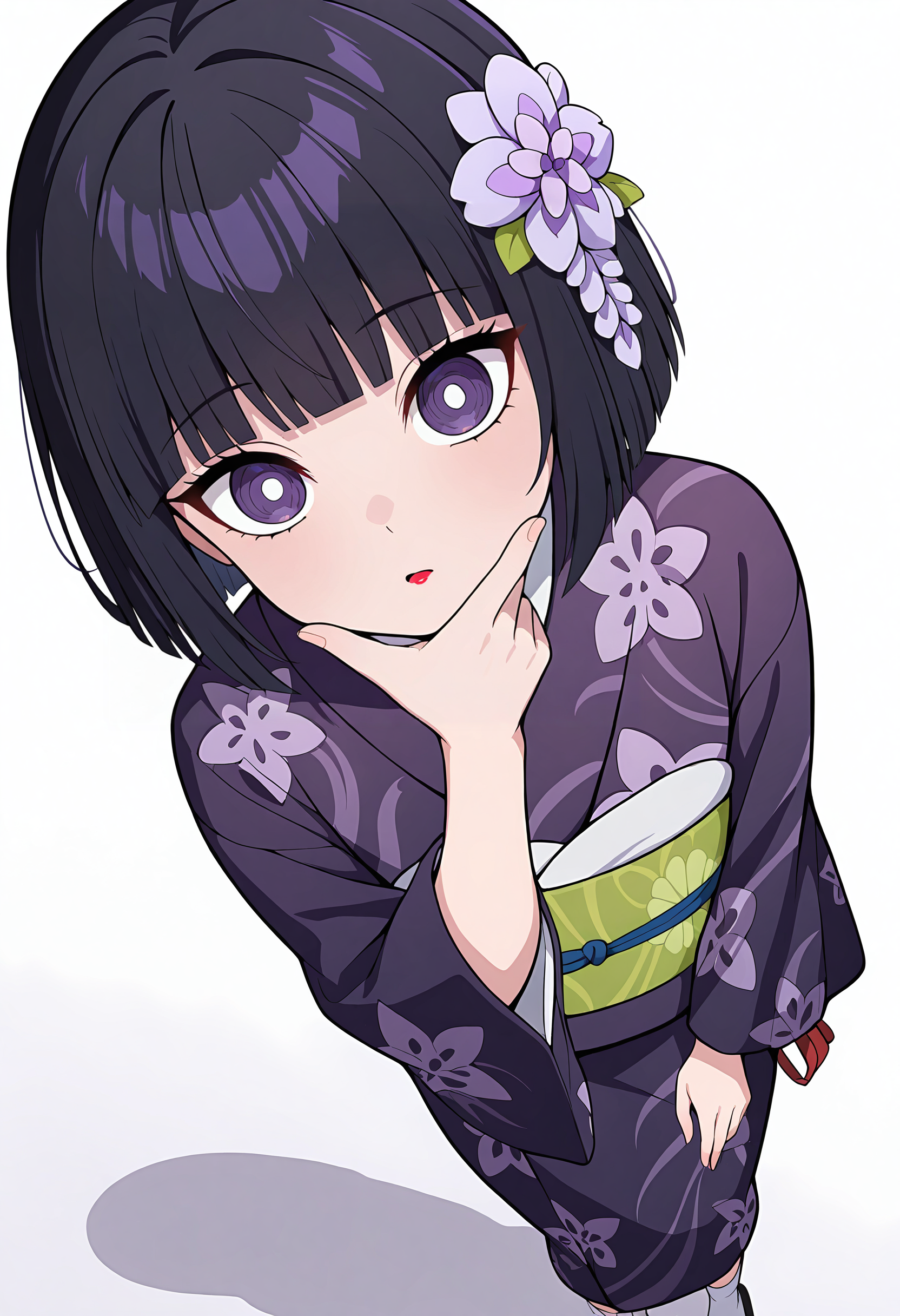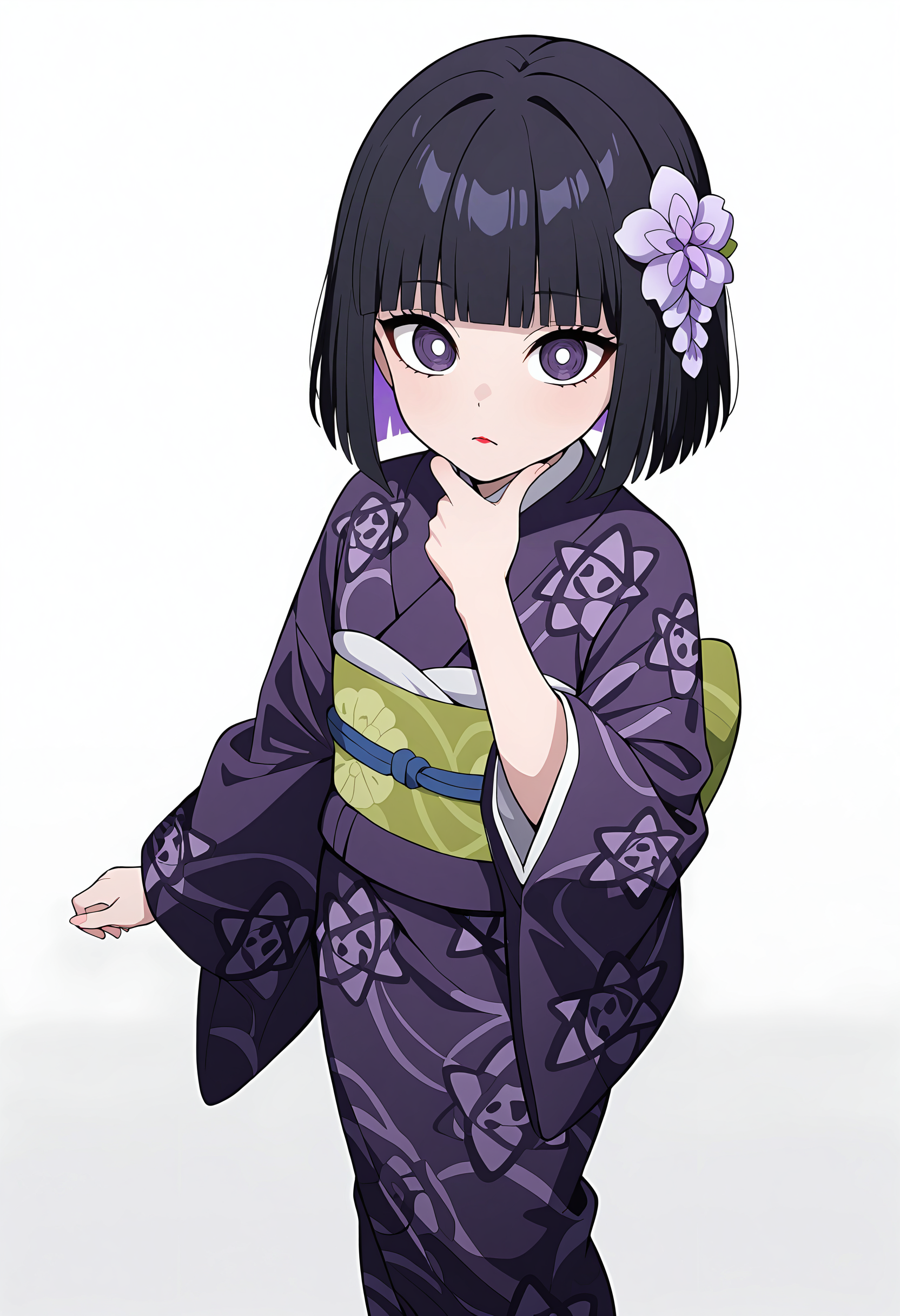 1girl, Ubuyashiki Kiriya, child, solo, black hair, straight bangs, short hair, straight hair, purple hair-flower, purple eyes, geometric eye iris, white pupils, eyelashes, thin lipstick,