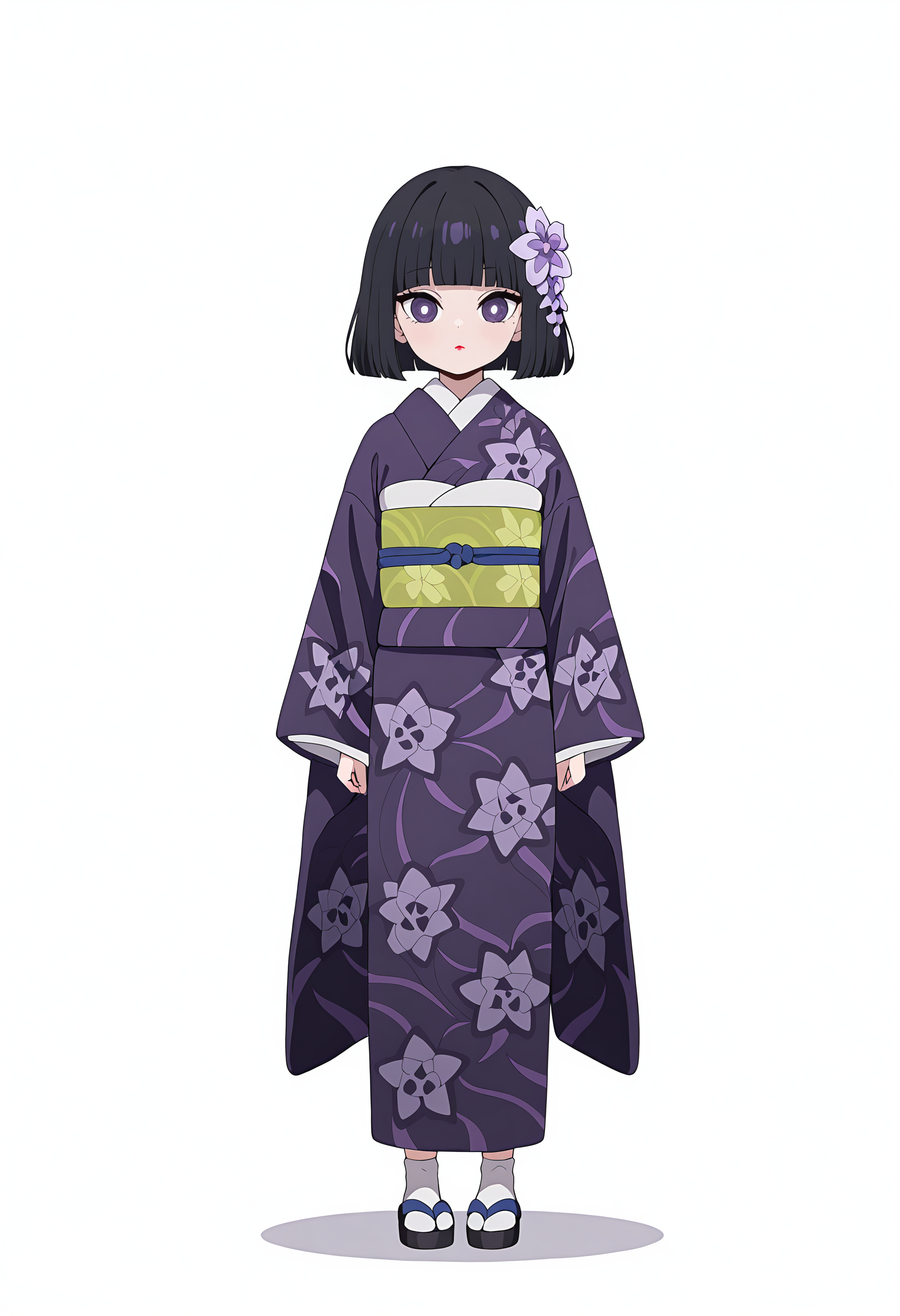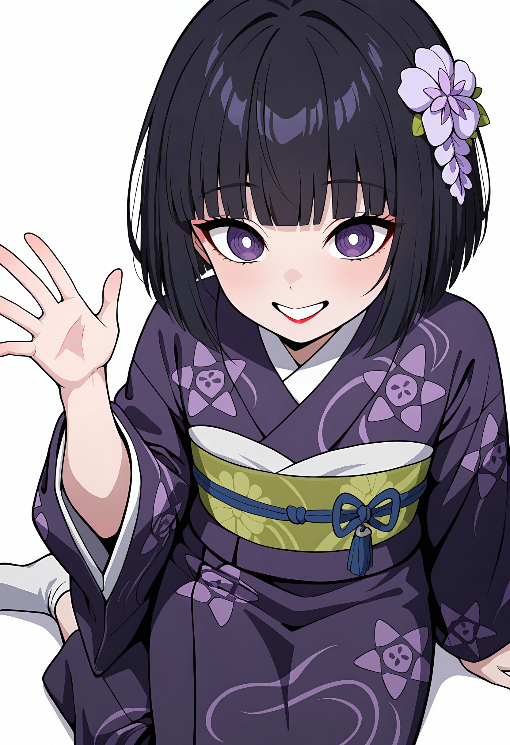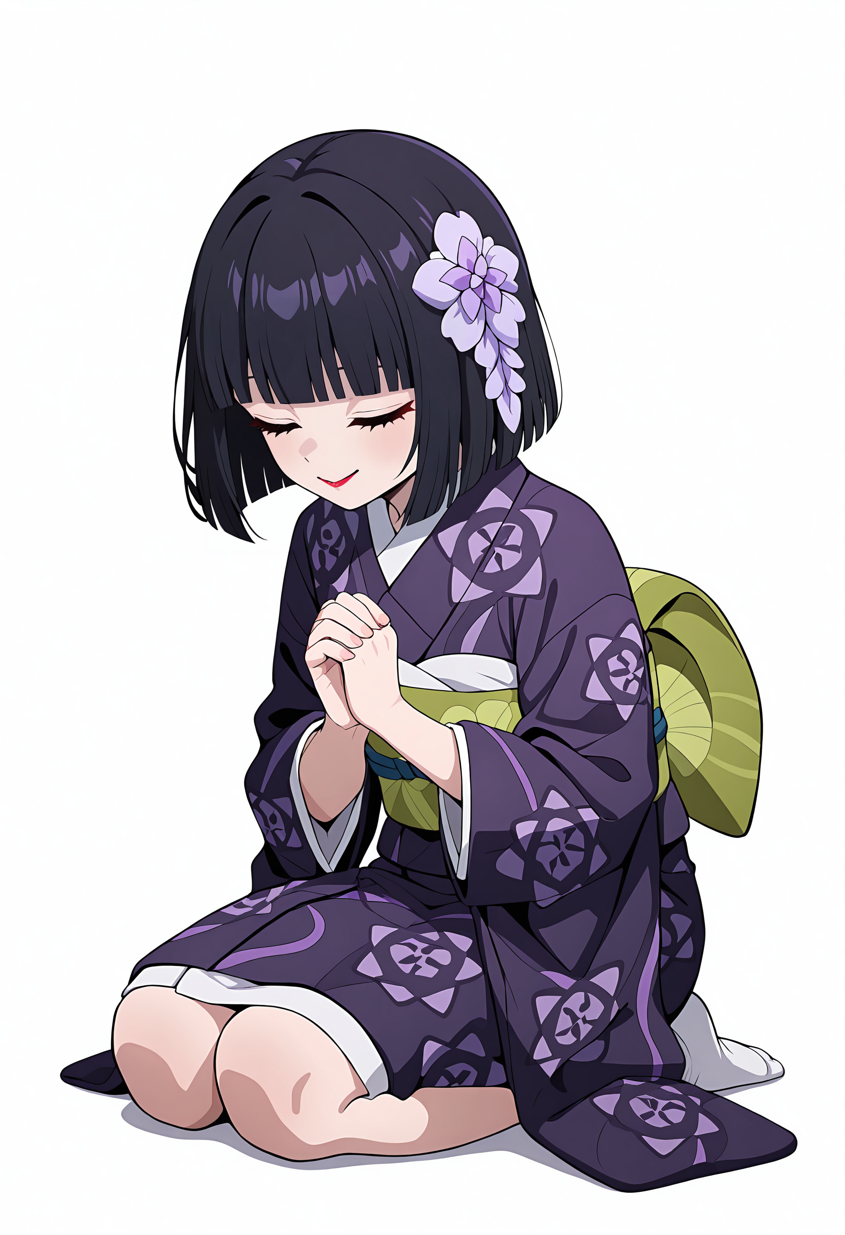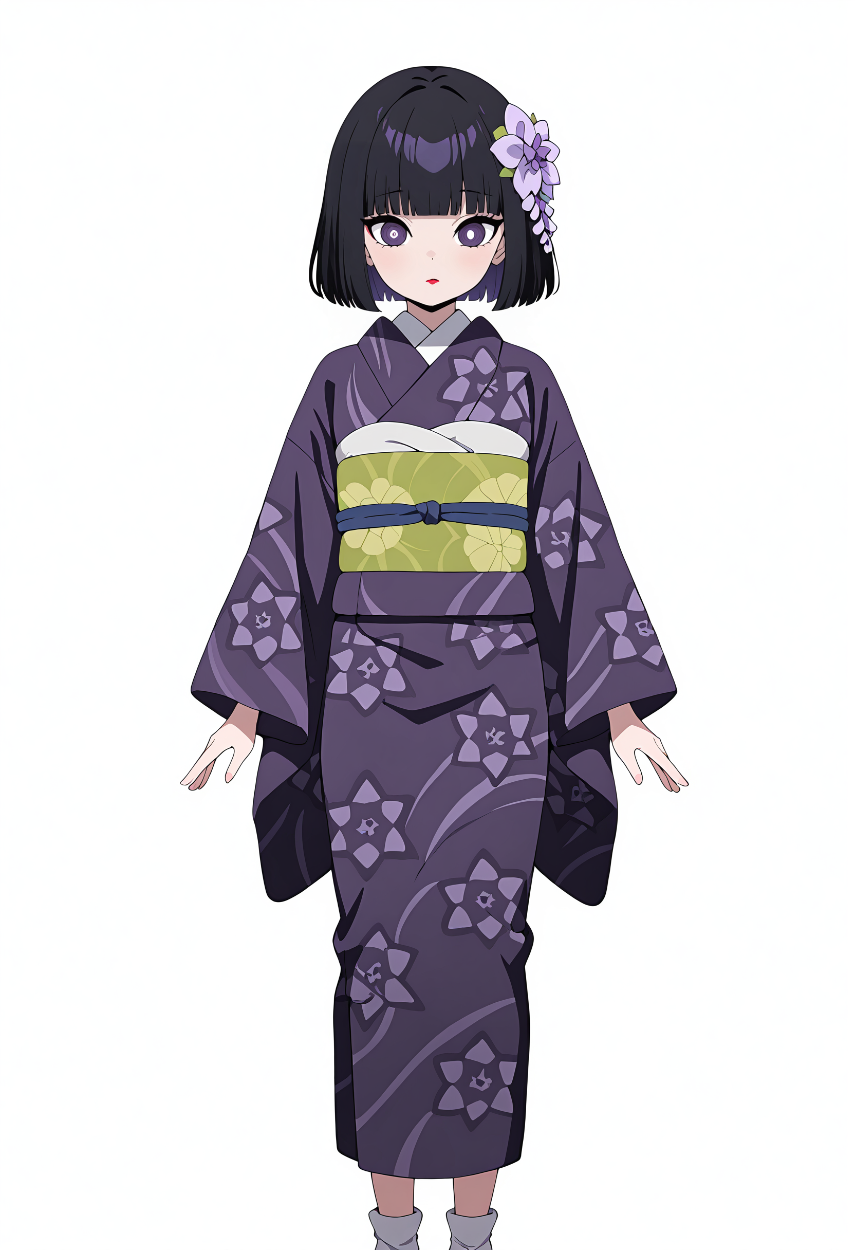 1girl, Ubuyashiki Kiriya, child, solo, black hair, straight bangs, short hair, straight hair, purple hair-flower, purple eyes, geometric eye iris, white pupils, eyelashes, thin lipstick,