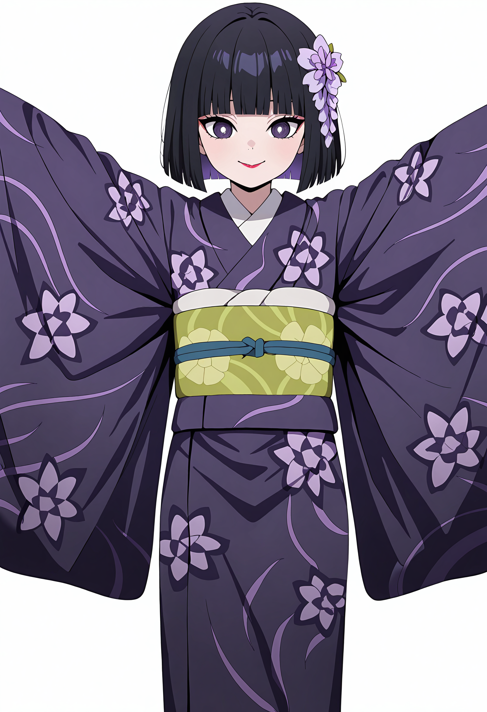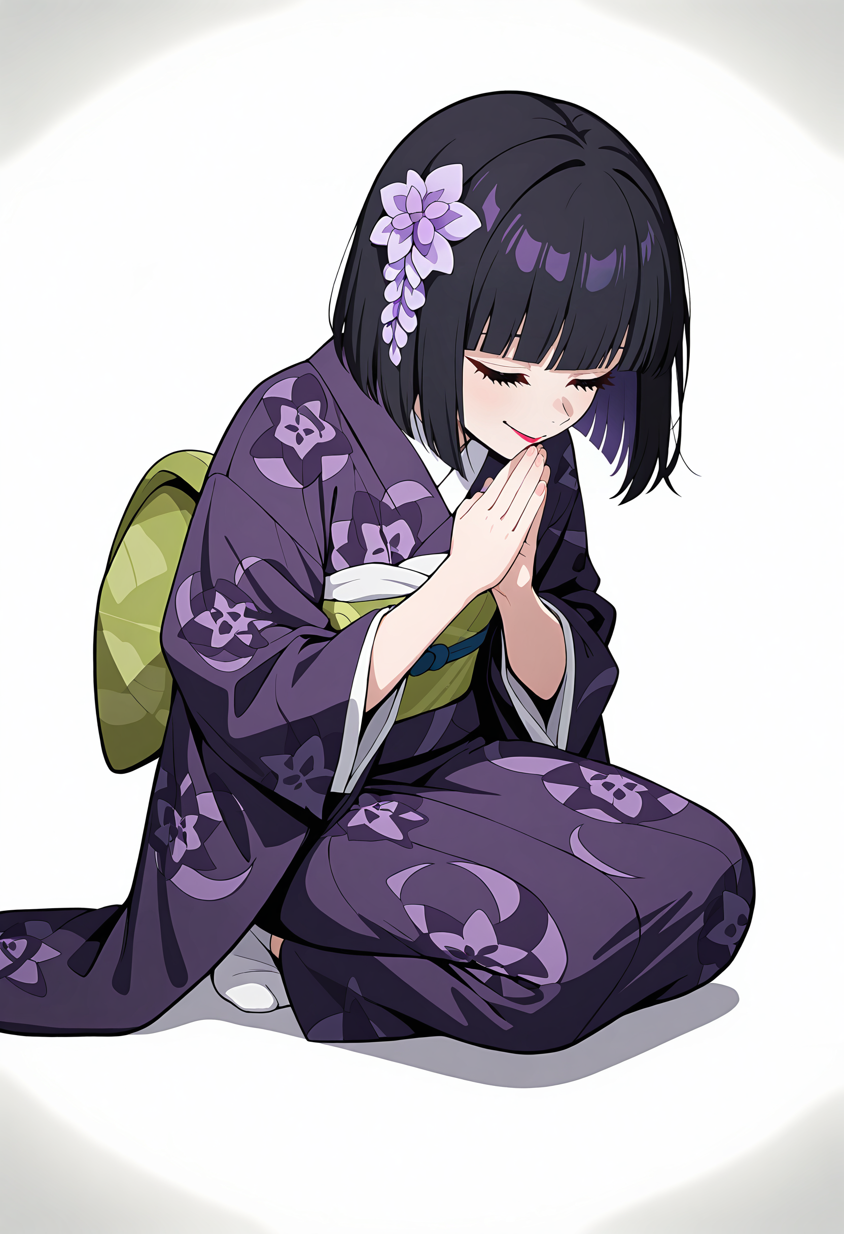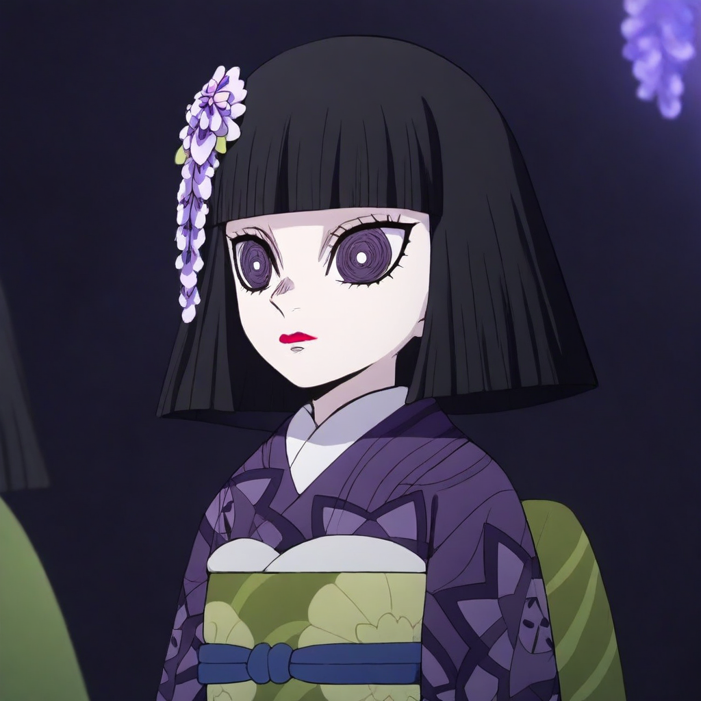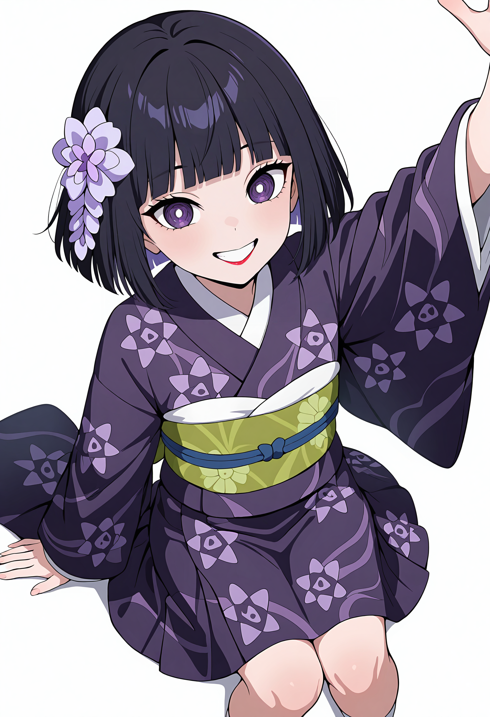 1girl, Ubuyashiki Kiriya, child, solo, black hair, straight bangs, short hair, straight hair, purple hair-flower, purple eyes, geometric eye iris, white pupils, eyelashes, thin lipstick,