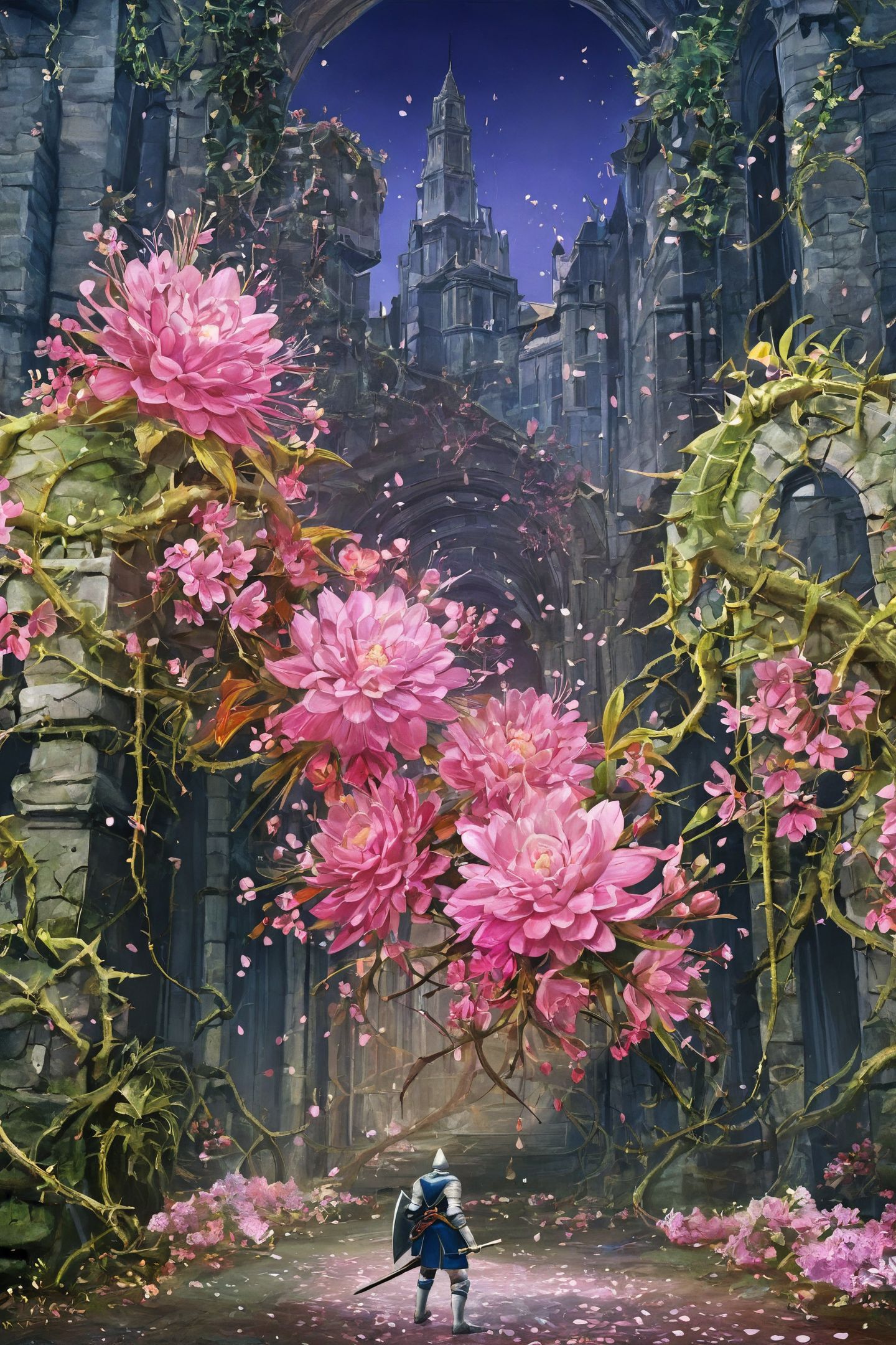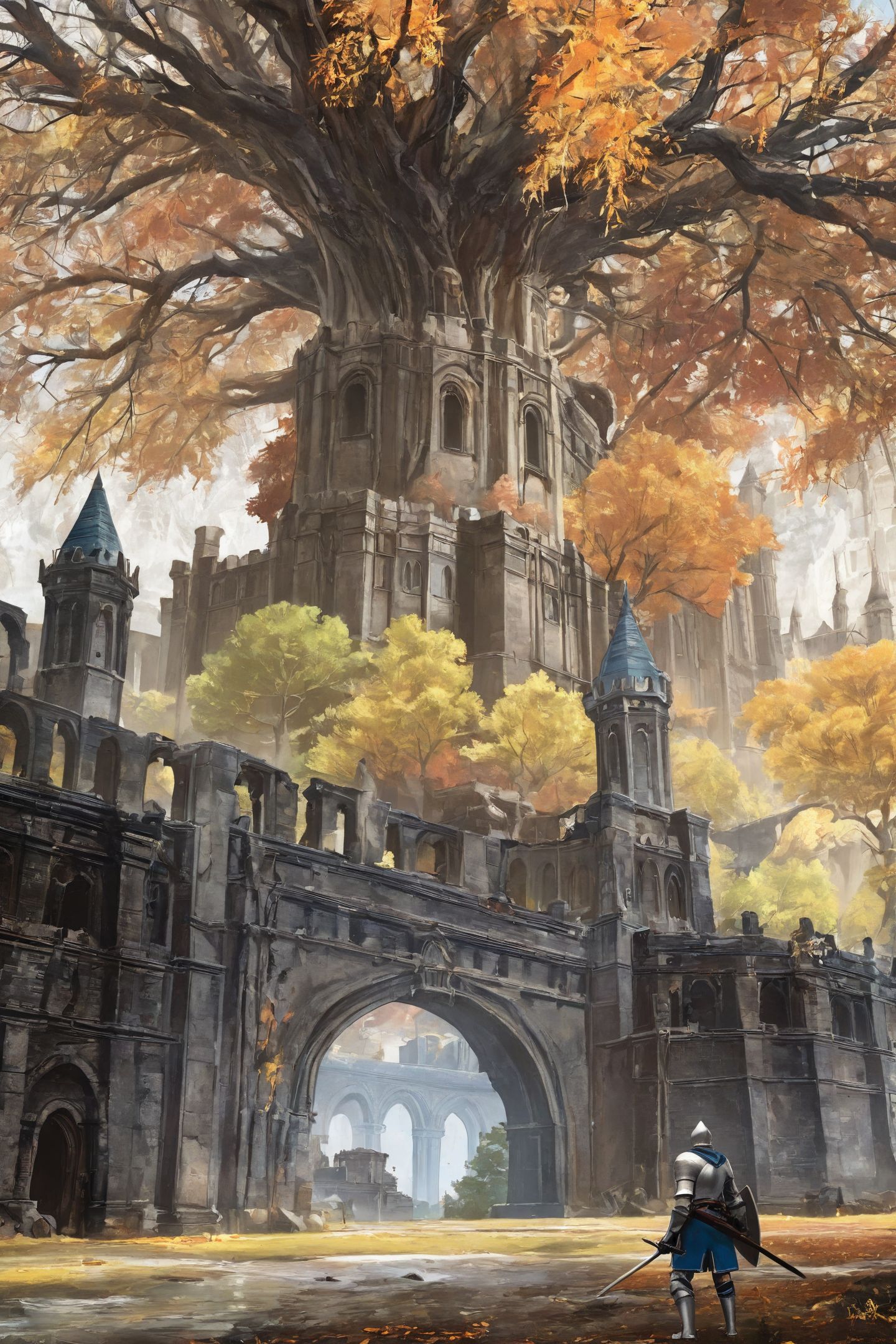 大名鼎鼎的《艾尔登法环》的场景lora,用了官方画册中的概念图集作为训练数据集,并非使用游戏3D画面作为训练,所以有一种独特的线条凌乱的抽象美感。