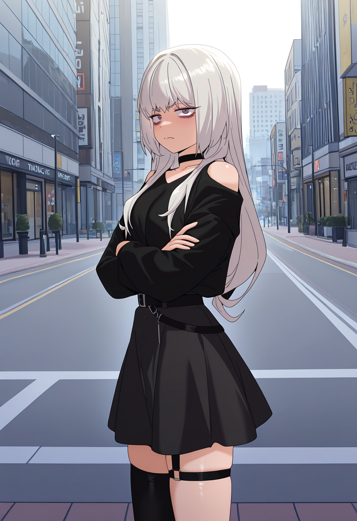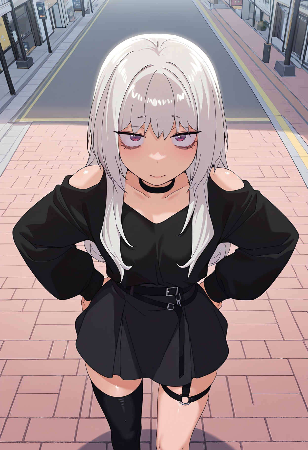 black choker, black thin belt, black dress, shoulder cut, single thigh strap, short skirt, single black thighhigh,