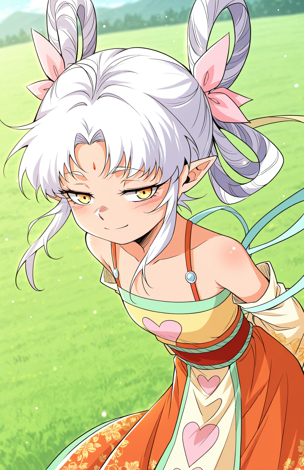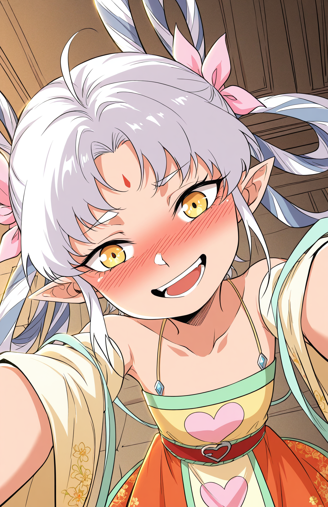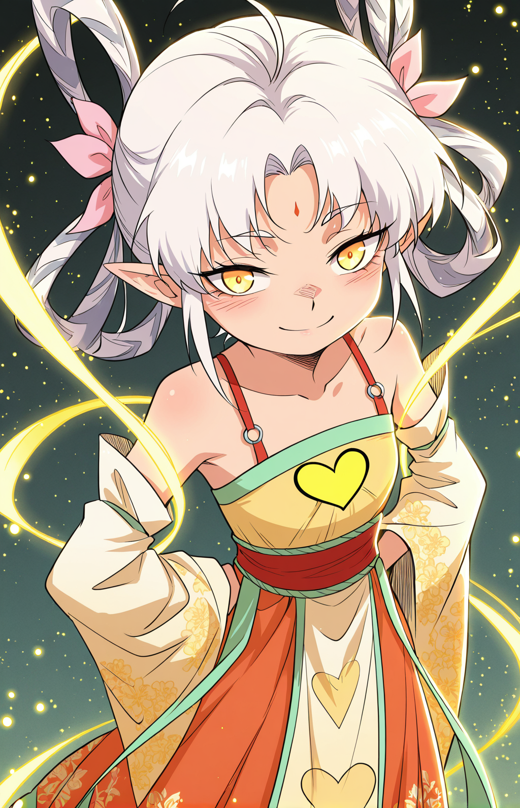 Yuspirit, 1girl, solo, yellow eyes, white hair, short hair, uneven bangs, hair between eyes, long sidelocks, hair bows, pink bows, pointed ears, forehead mark,