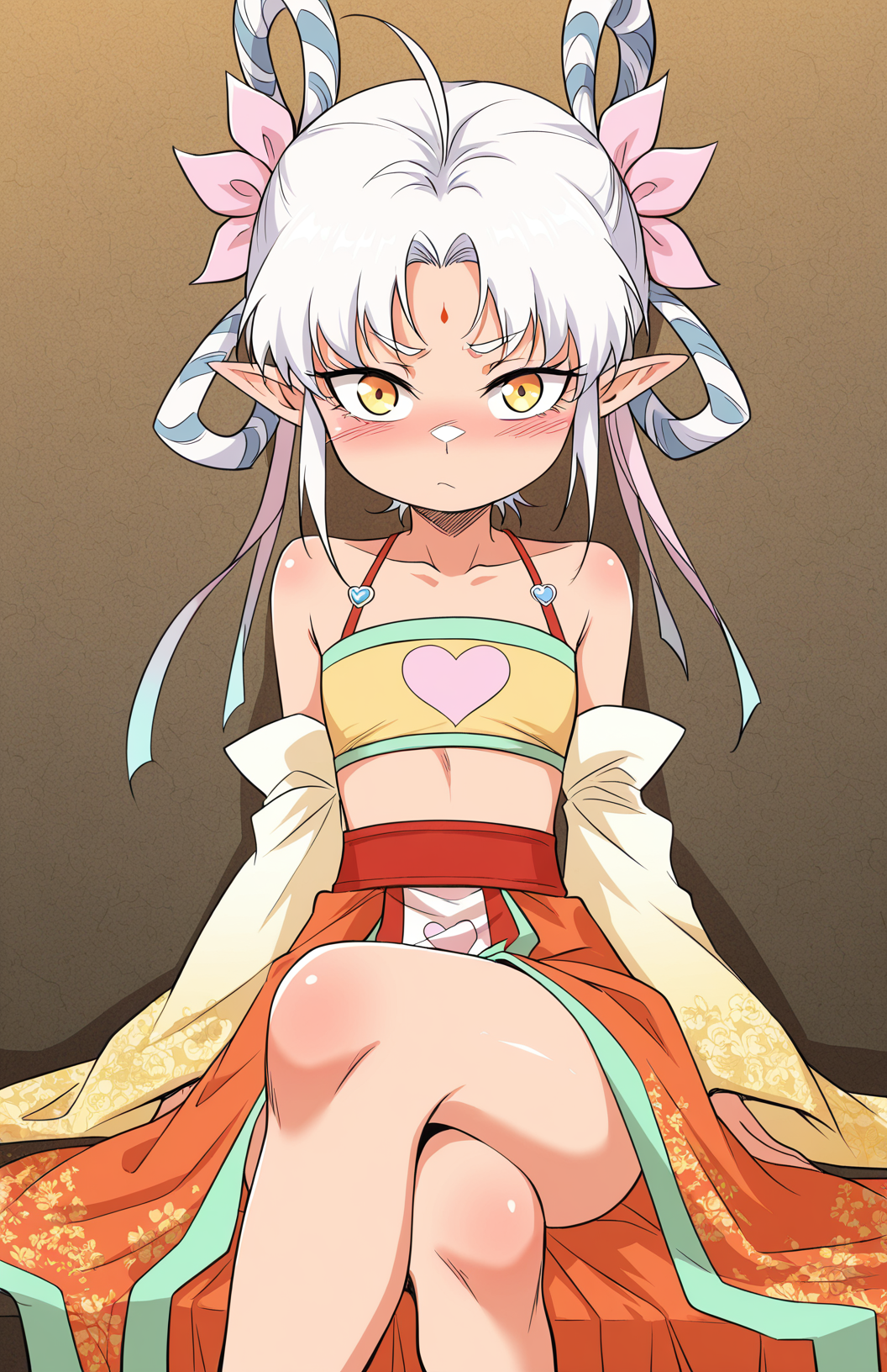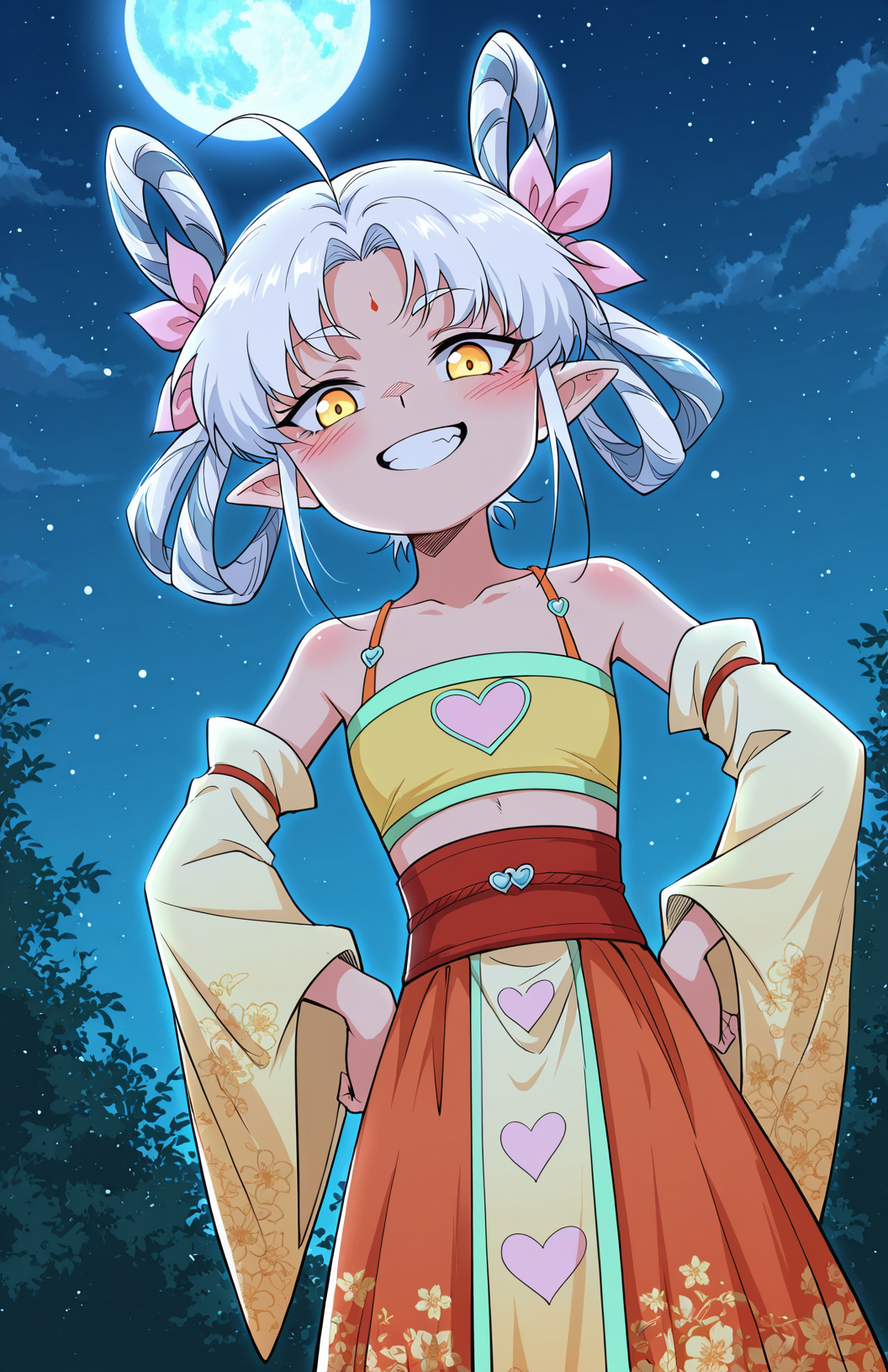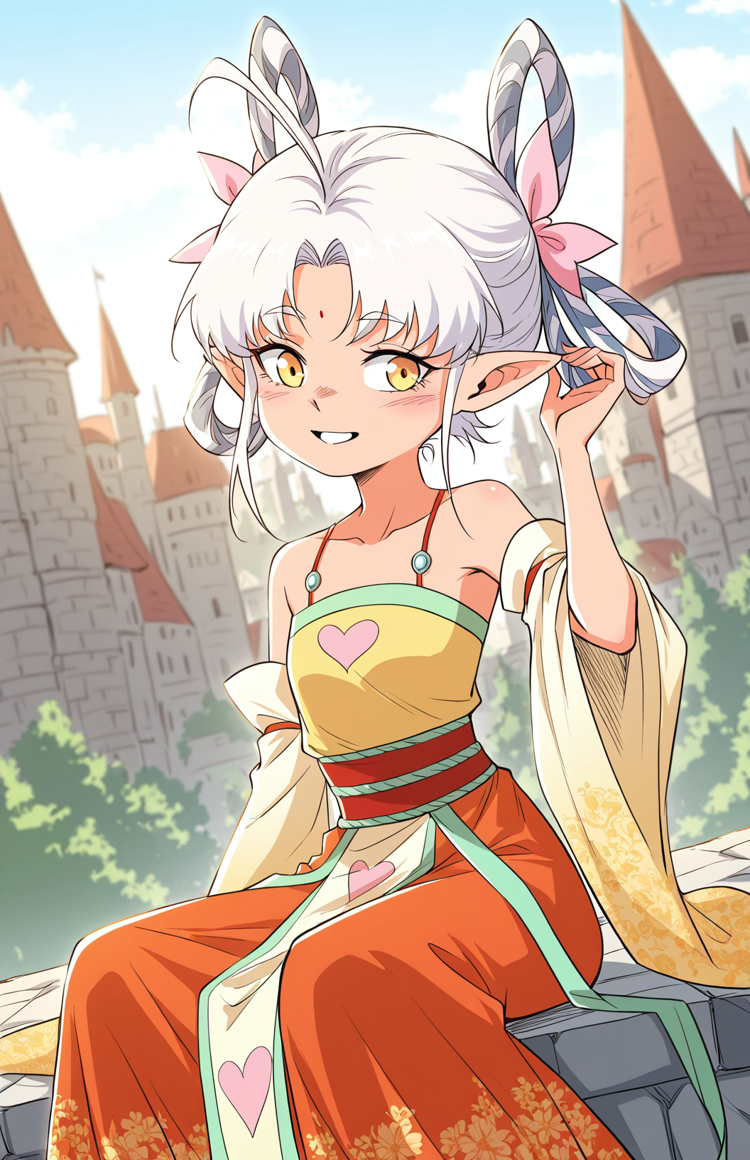 Yuspirit, 1girl, solo, yellow eyes, white hair, short hair, uneven bangs, hair between eyes, long sidelocks, hair bows, pink bows, pointed ears, forehead mark,